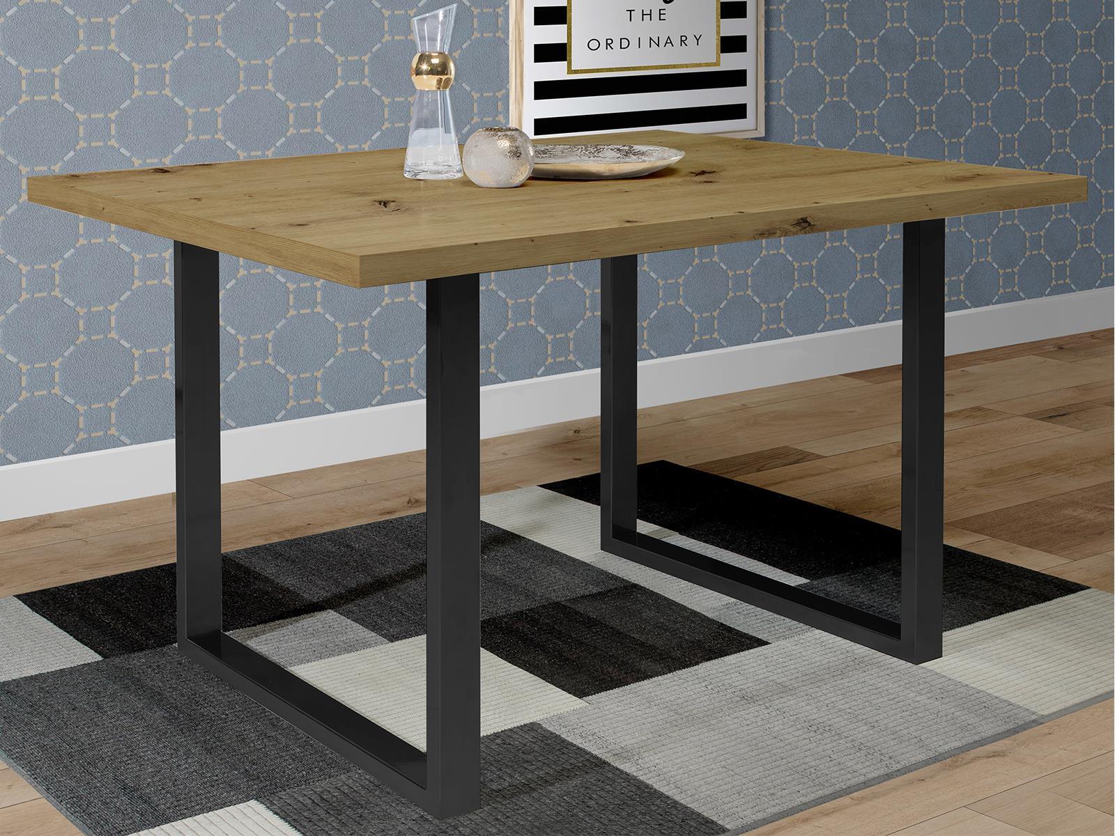Moderner Esszimmertisch, Tischplatte aus Spanplatte in Artisan Eiche Nachbildung, Gestell aus Metall in Schwarz. Breite 140 cm, Höhe 74,4 cm, Tiefe 90 cm