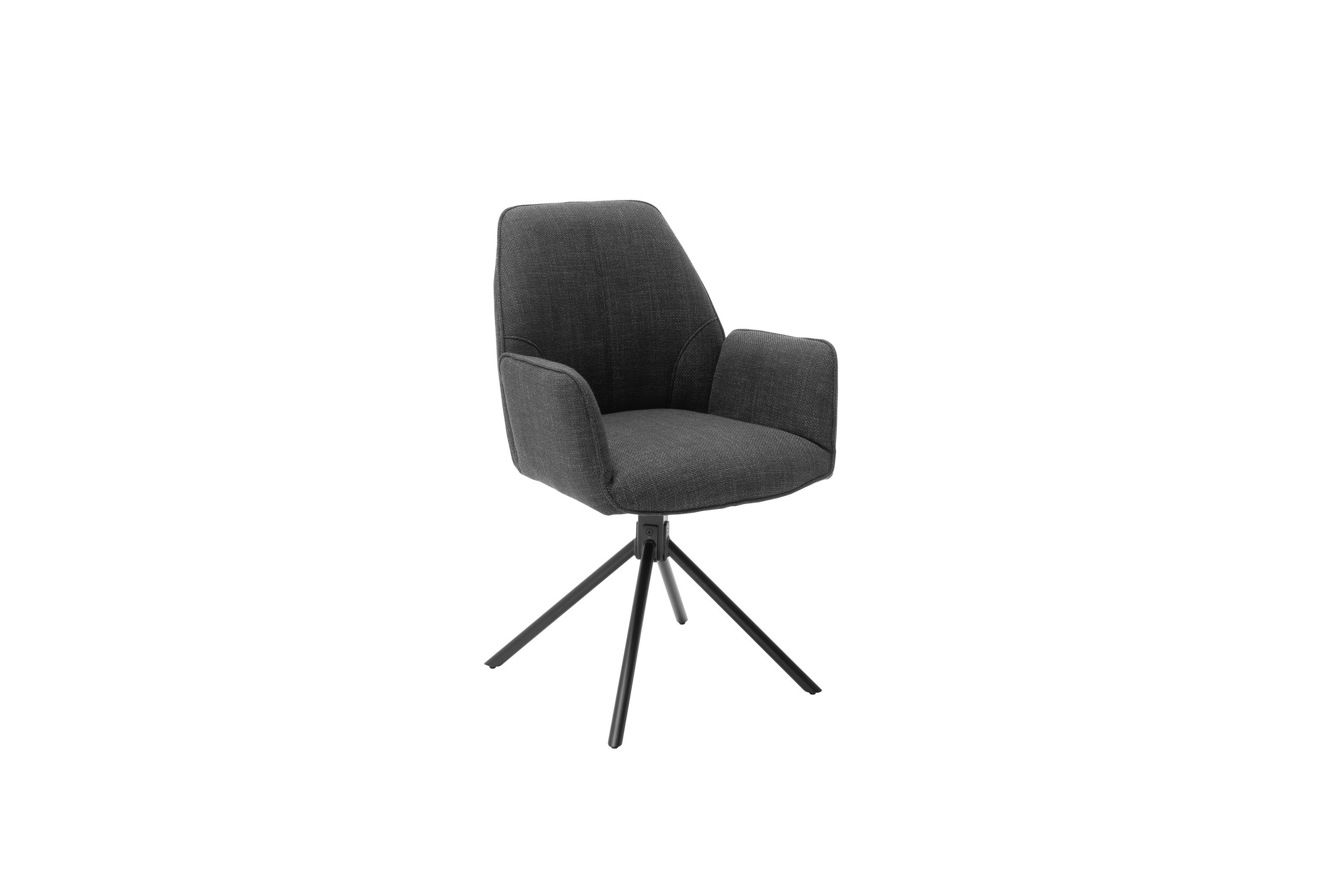 Der Webstoff-Bezug aus 100% Polyester in Anthrazit wirkt elegant und ist zugleich strapazierfähig und pflegeleicht. In Kombination mit dem schwarz matt lackierten 4-Fuß-Metallgestell entsteht ein moderner Look, der Stabilität bis 120 kg und hohen Sitzkomfort durch Armlehnen und großzügige Polsterung bietet.