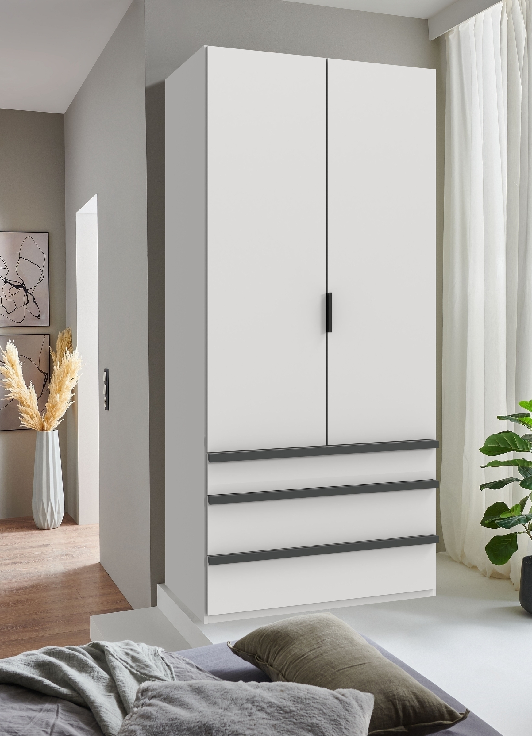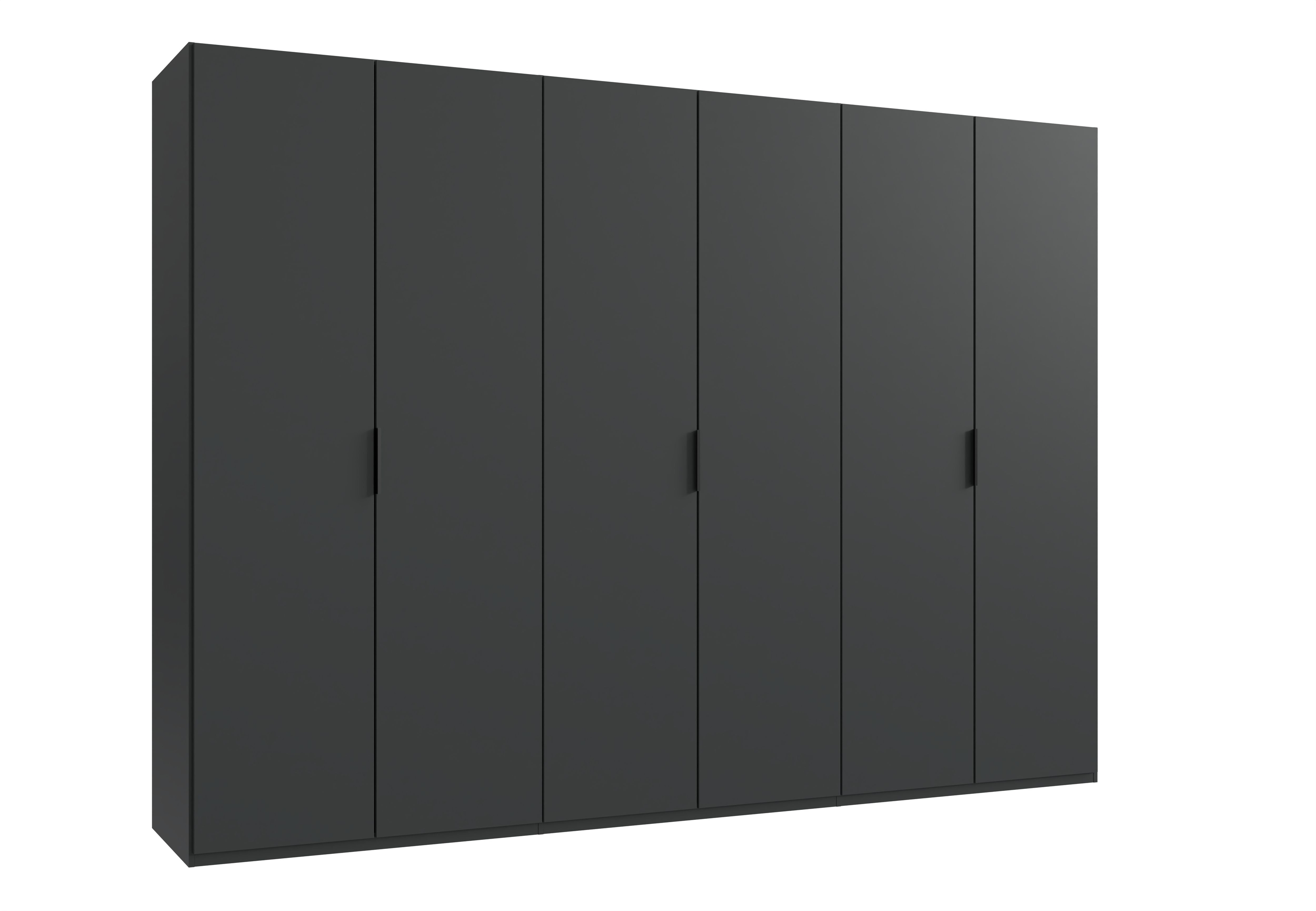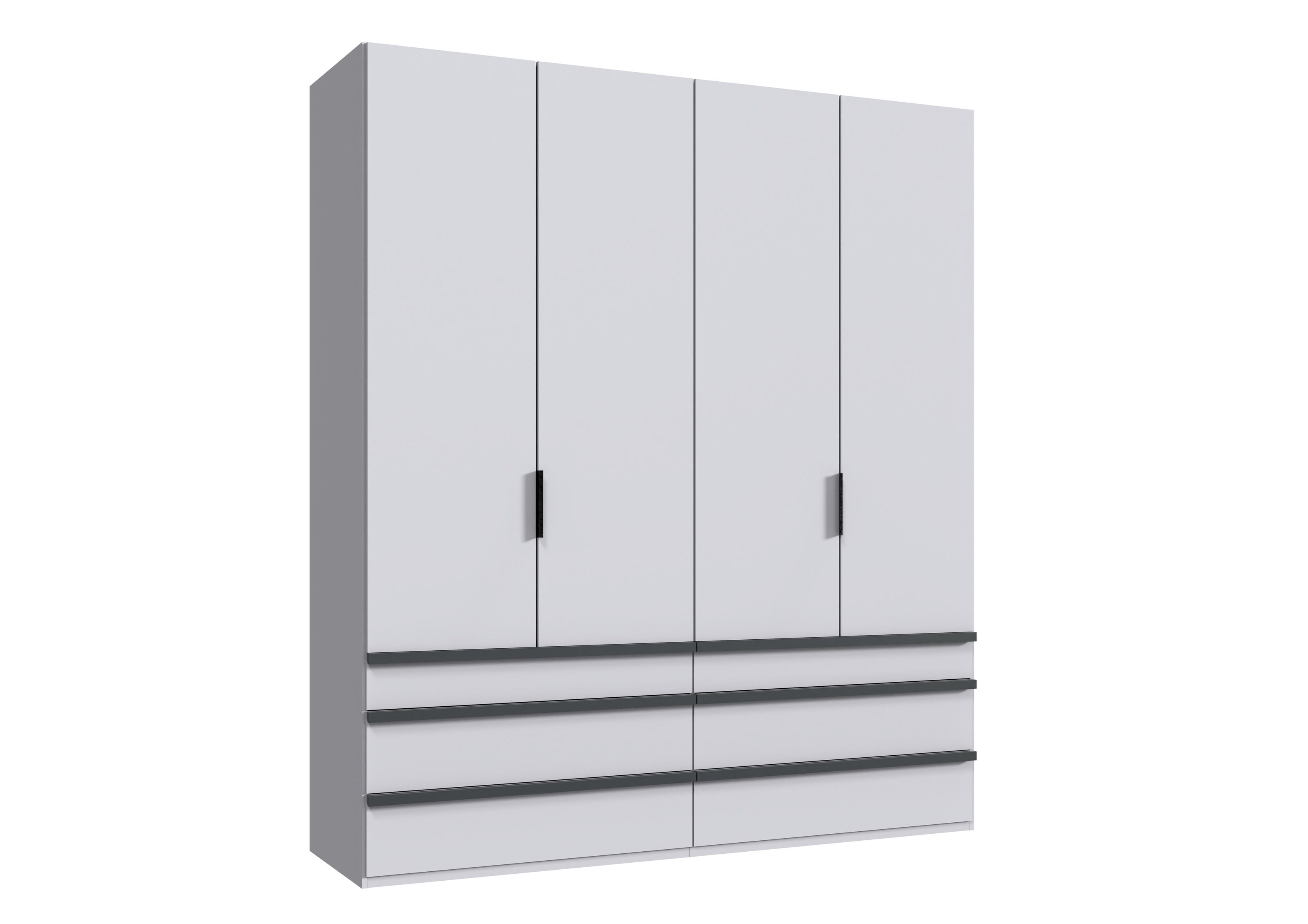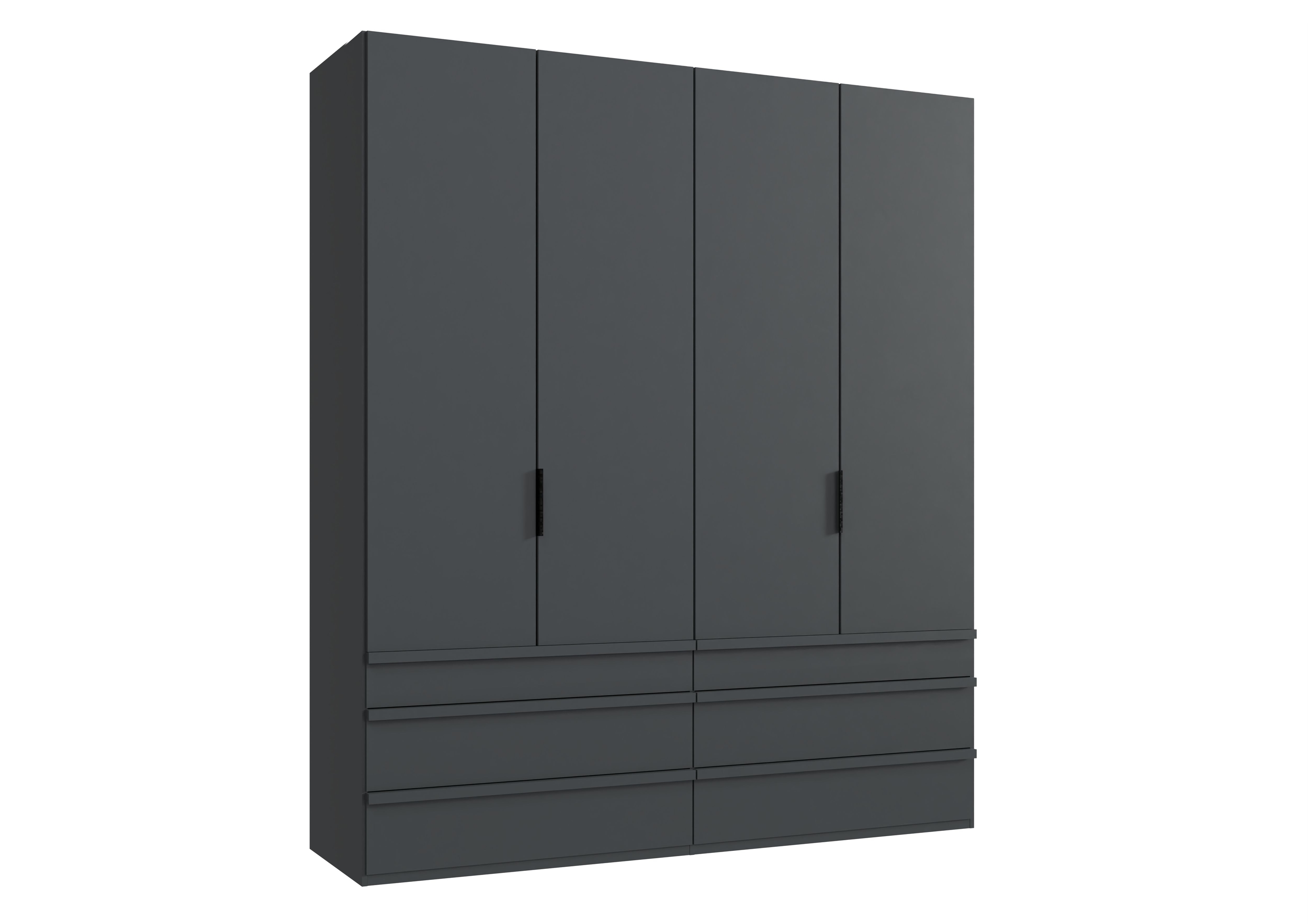 Seine vier praktischen Falttüren in GRAPHIT ermöglichen einen bequemen, weiten Zugriff auf den gesamten Innenraum, sodass Sie Kleidung, Wäsche und Accessoires schnell im Blick haben. Im Inneren sorgen zwei Kleiderstangen, zwei Einlegeböden mit einer Breite von jeweils 96 cm sowie sechs Schubladen für eine strukturierte Aufteilung und flexible Nutzung – ideal, um Ordnung im Schlafzimmer alltagstauglich umzusetzen.