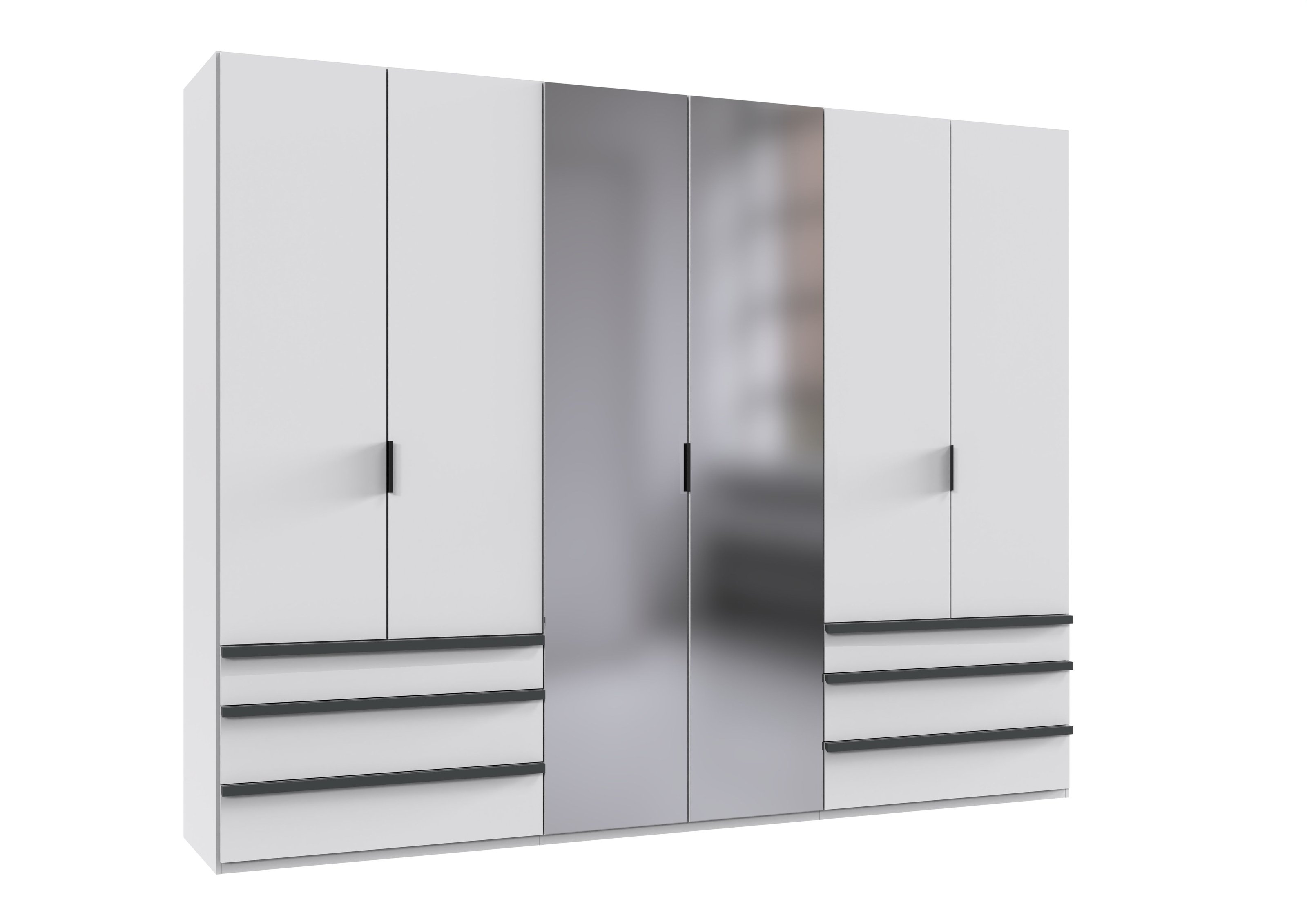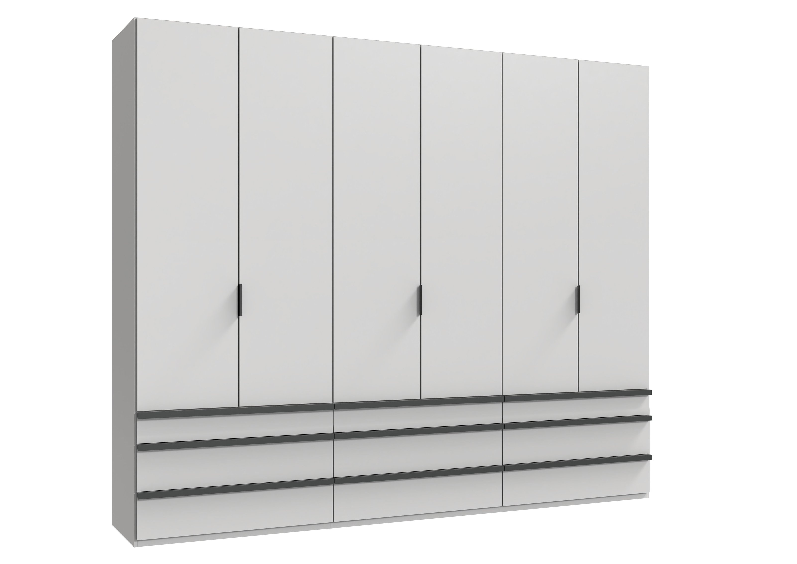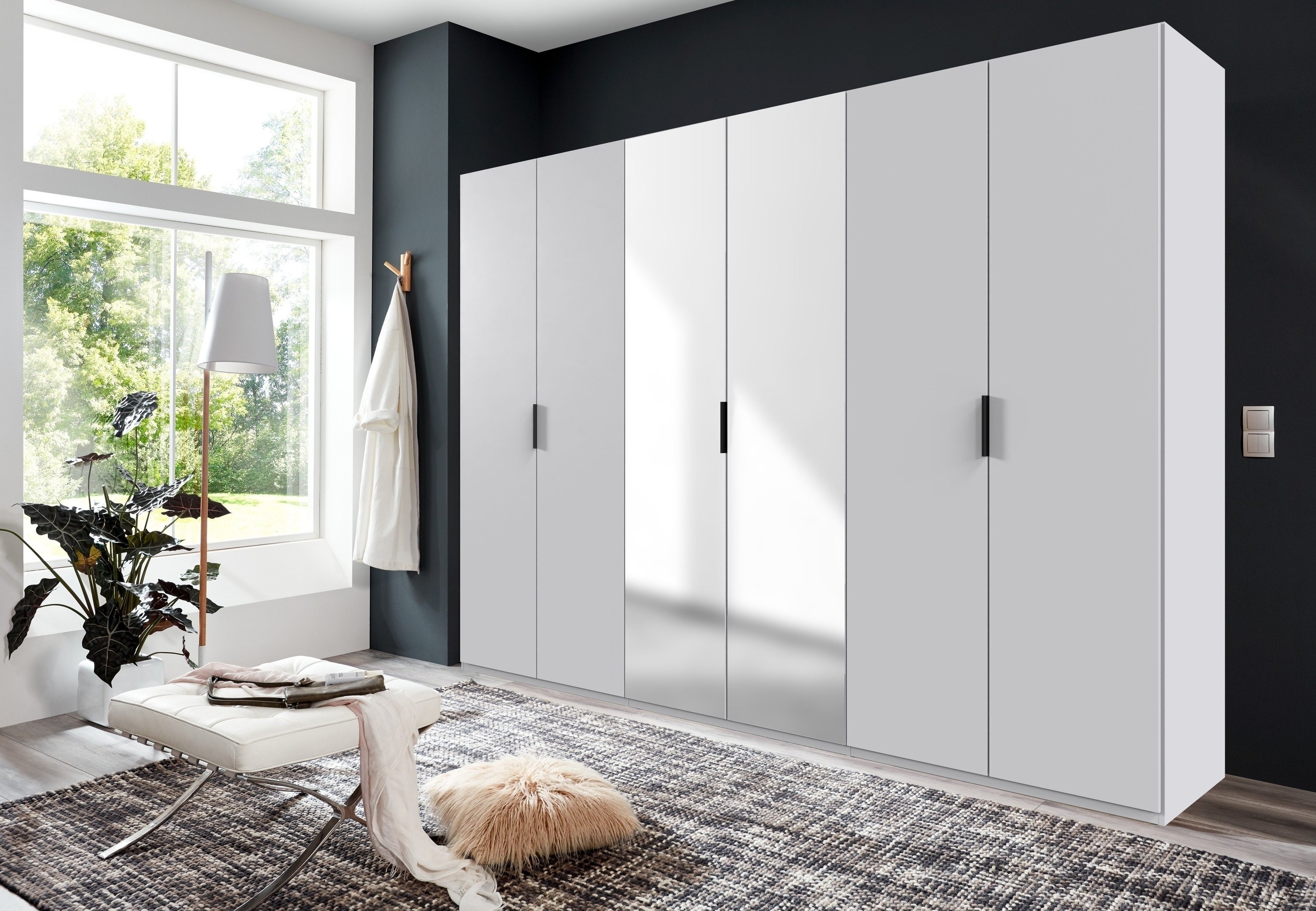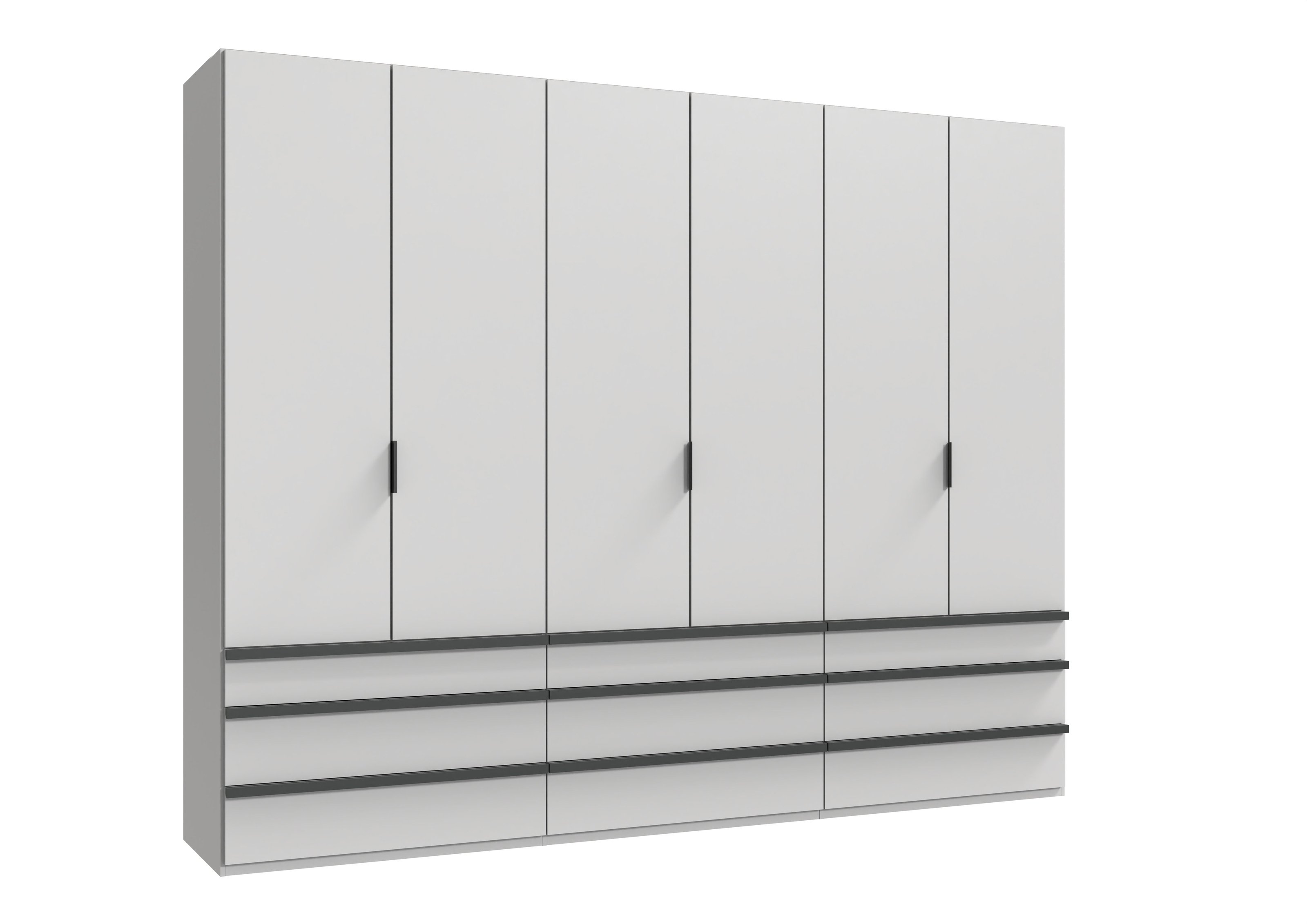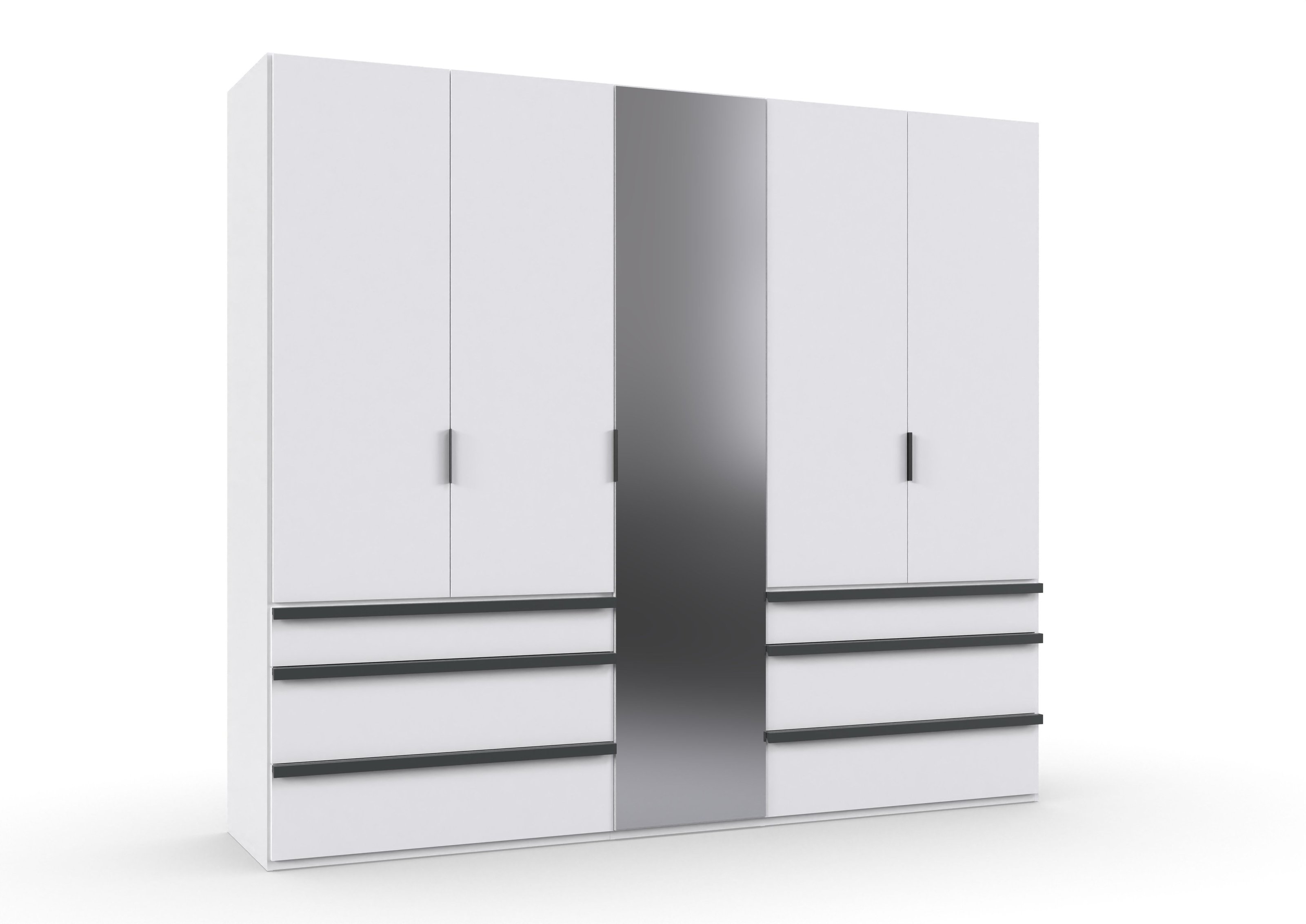 Die sechs Falttüren – mit zwei Türen links und einer rechts angeschlagen je Türenpaar – lassen sich komfortabel öffnen und sind besonders praktisch, wenn vor dem Schrank nur begrenzt Stellfläche zur Verfügung steht. So greifen Sie schnell auf Ihre Kleidung zu, während die Falttürtechnik den Bewegungsraum im Schlafzimmer schont.