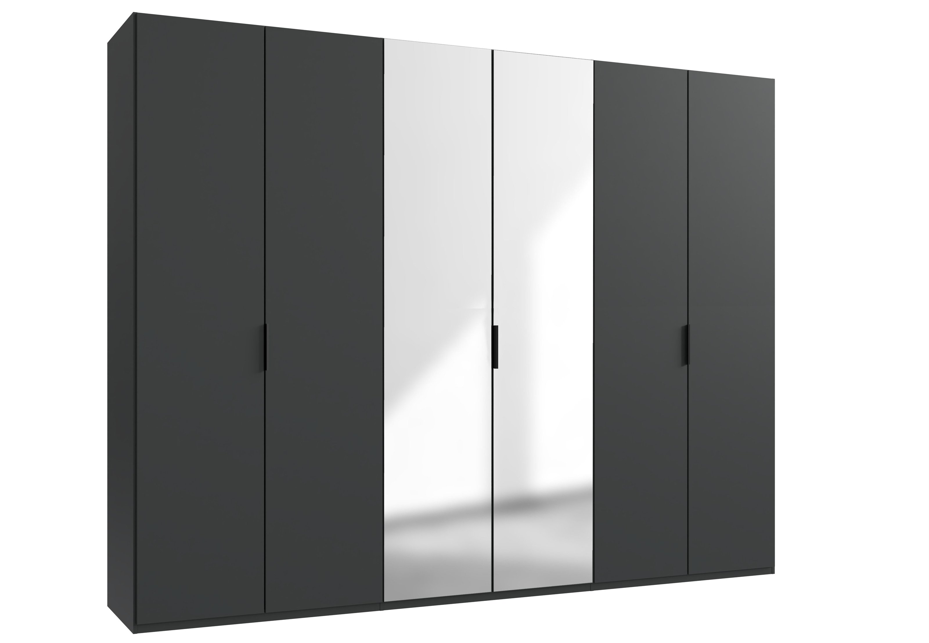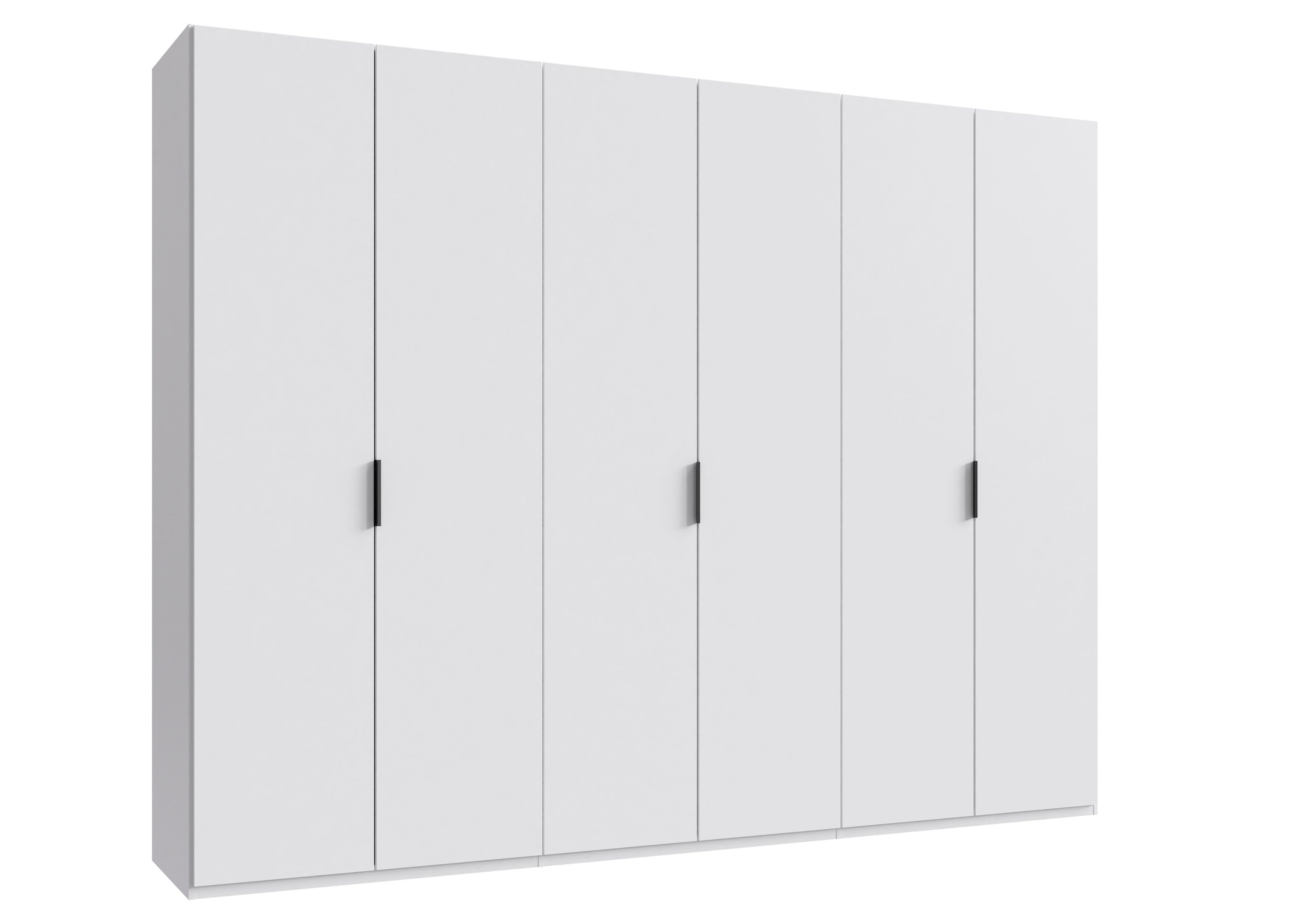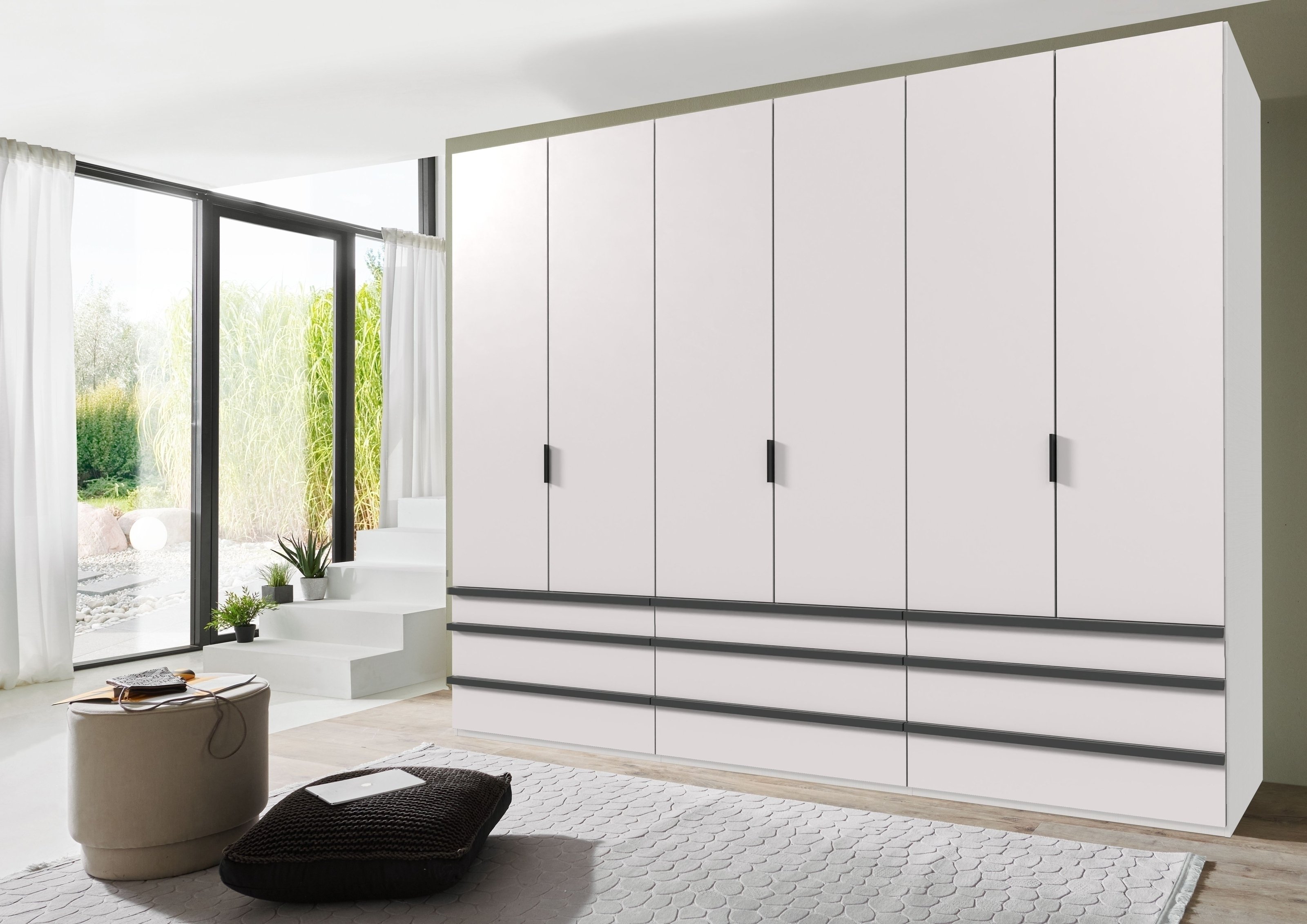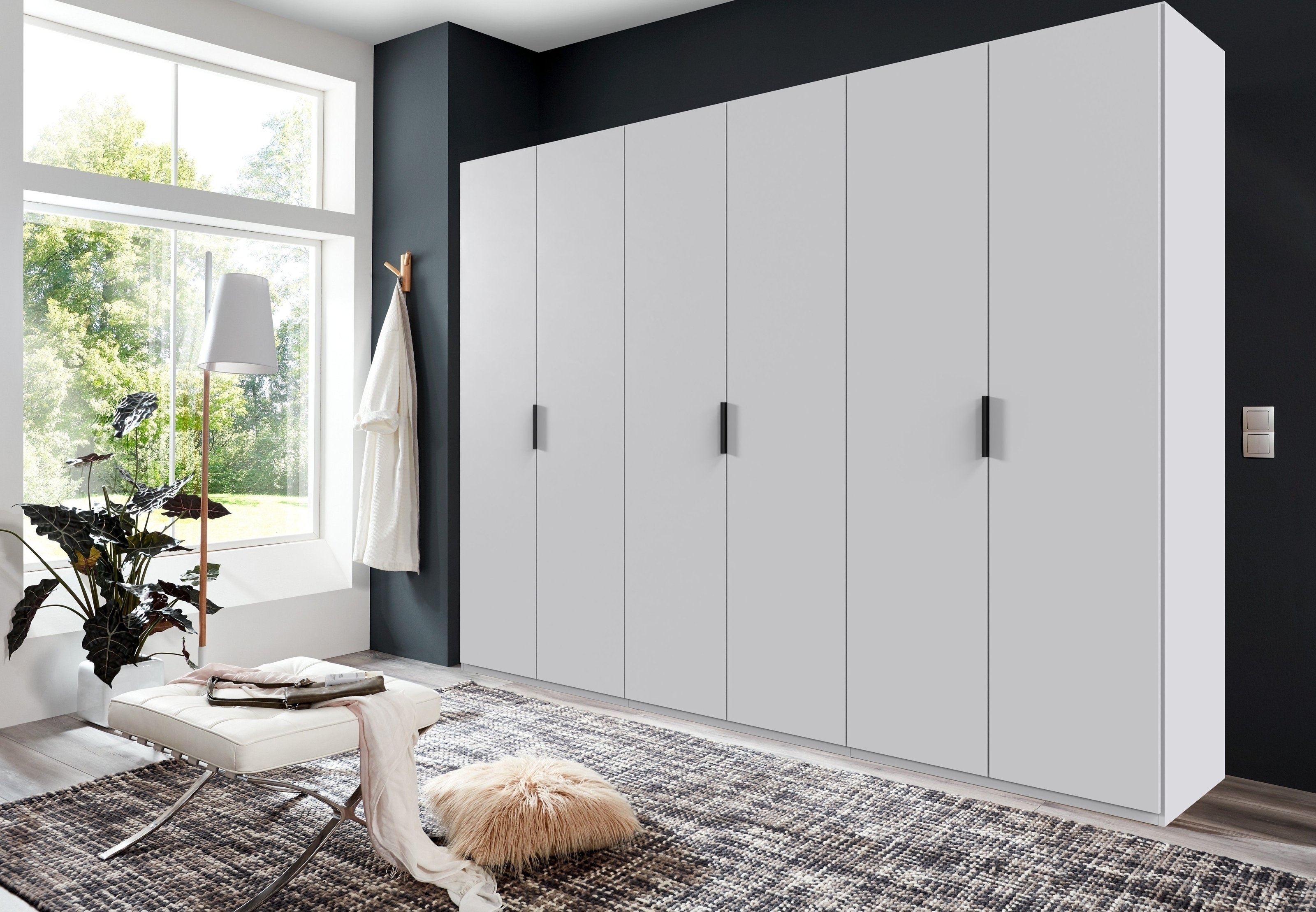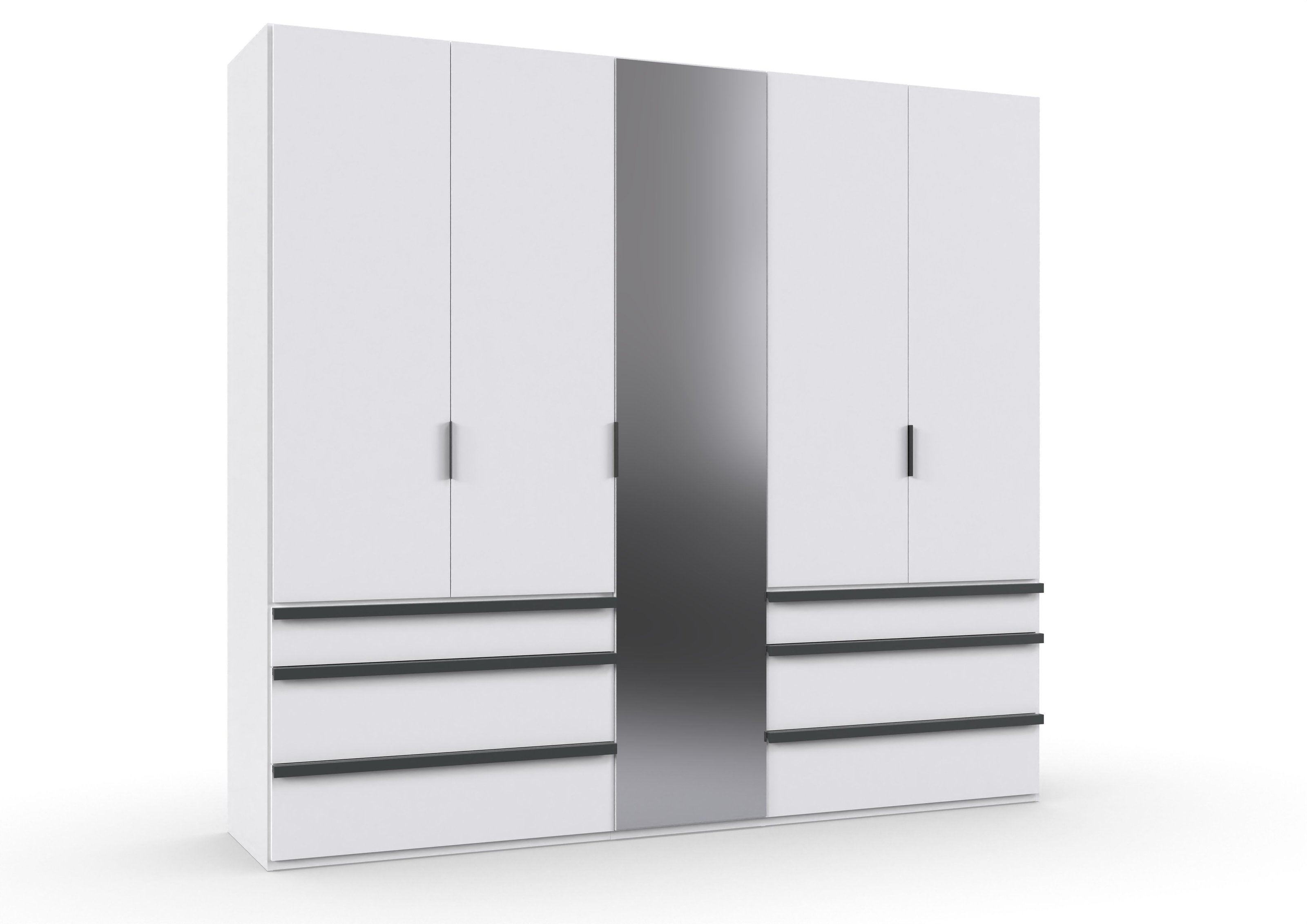 Die sechs Falttüren – mit zwei Türen links und einer rechts angeschlagen je Türenpaar – lassen sich komfortabel öffnen und sind besonders praktisch, wenn vor dem Schrank nur begrenzt Stellfläche zur Verfügung steht. So greifen Sie schnell auf Ihre Kleidung zu, während die Falttürtechnik den Bewegungsraum im Schlafzimmer schont.