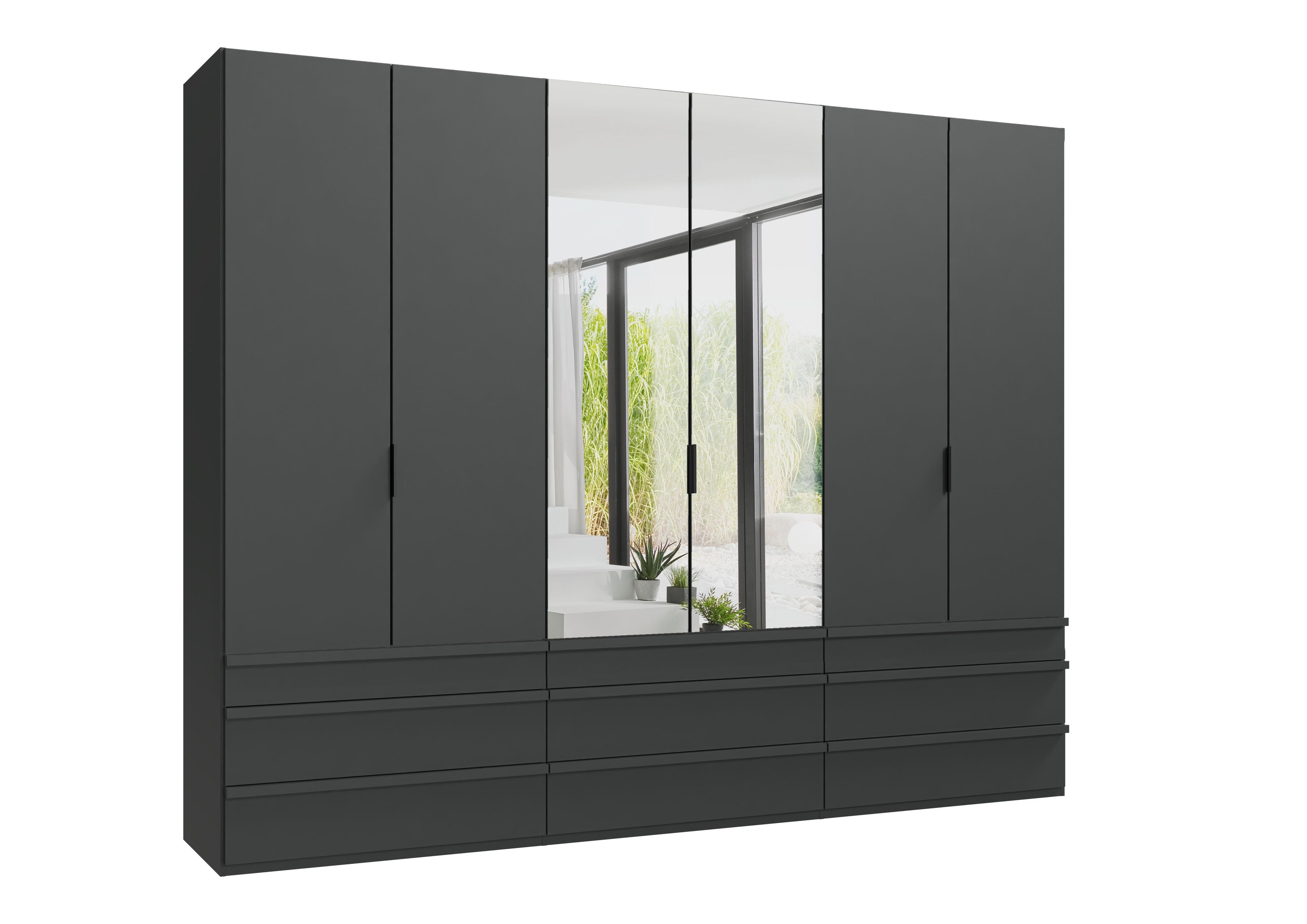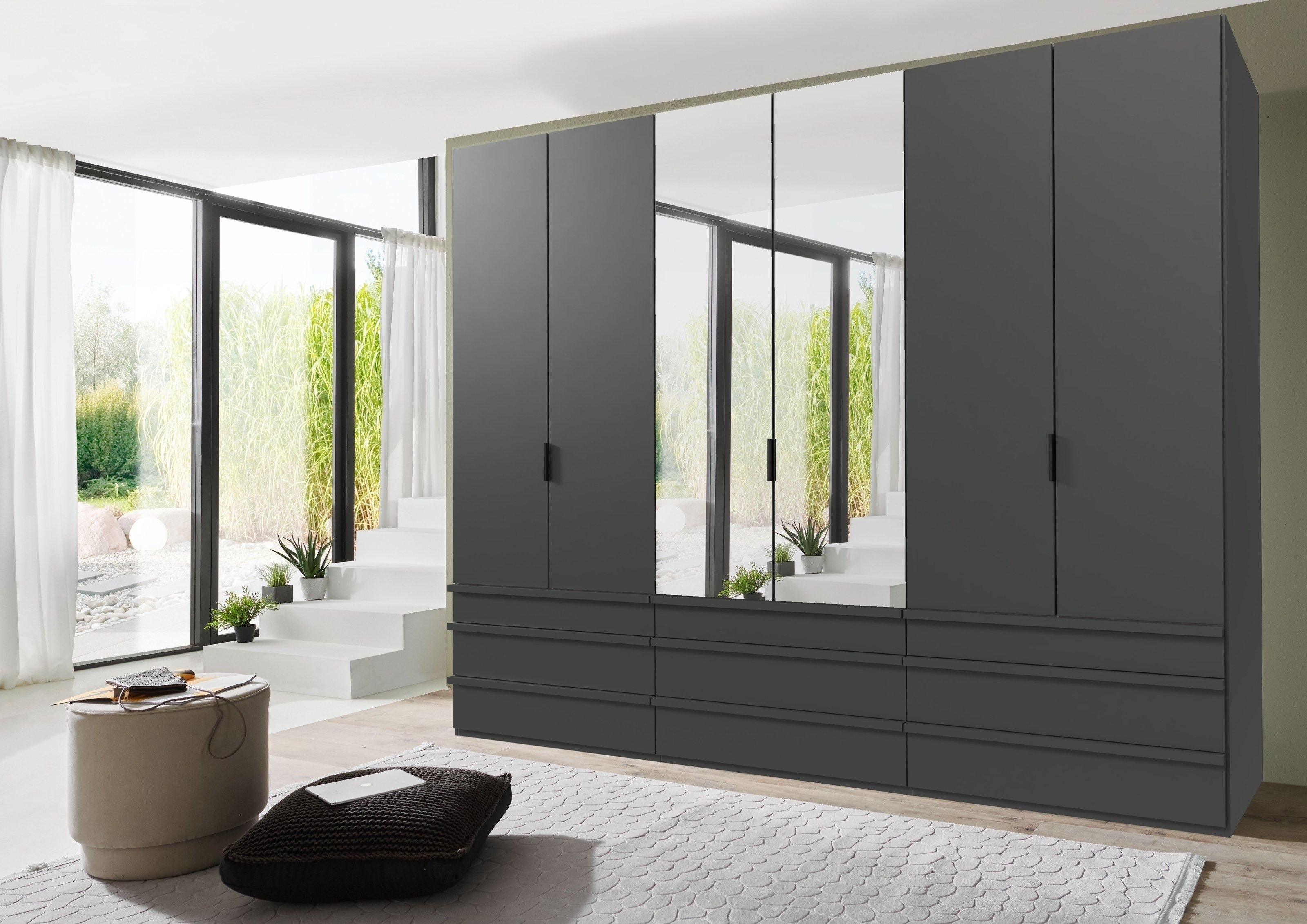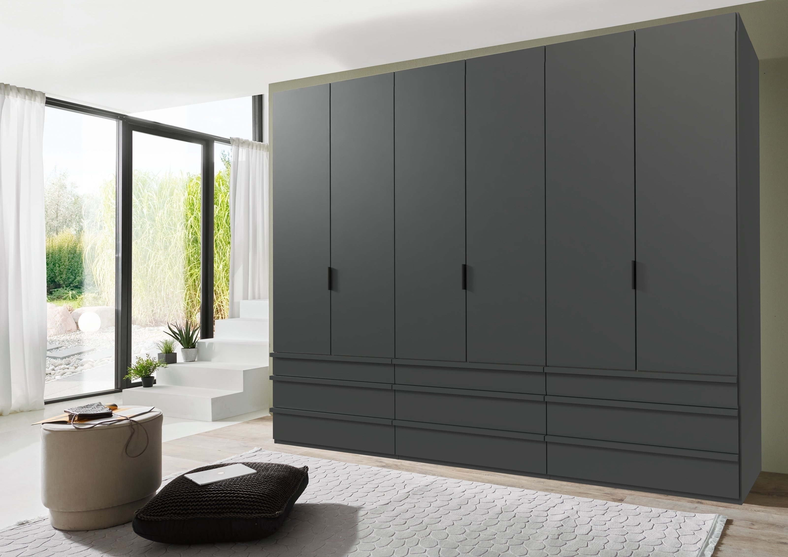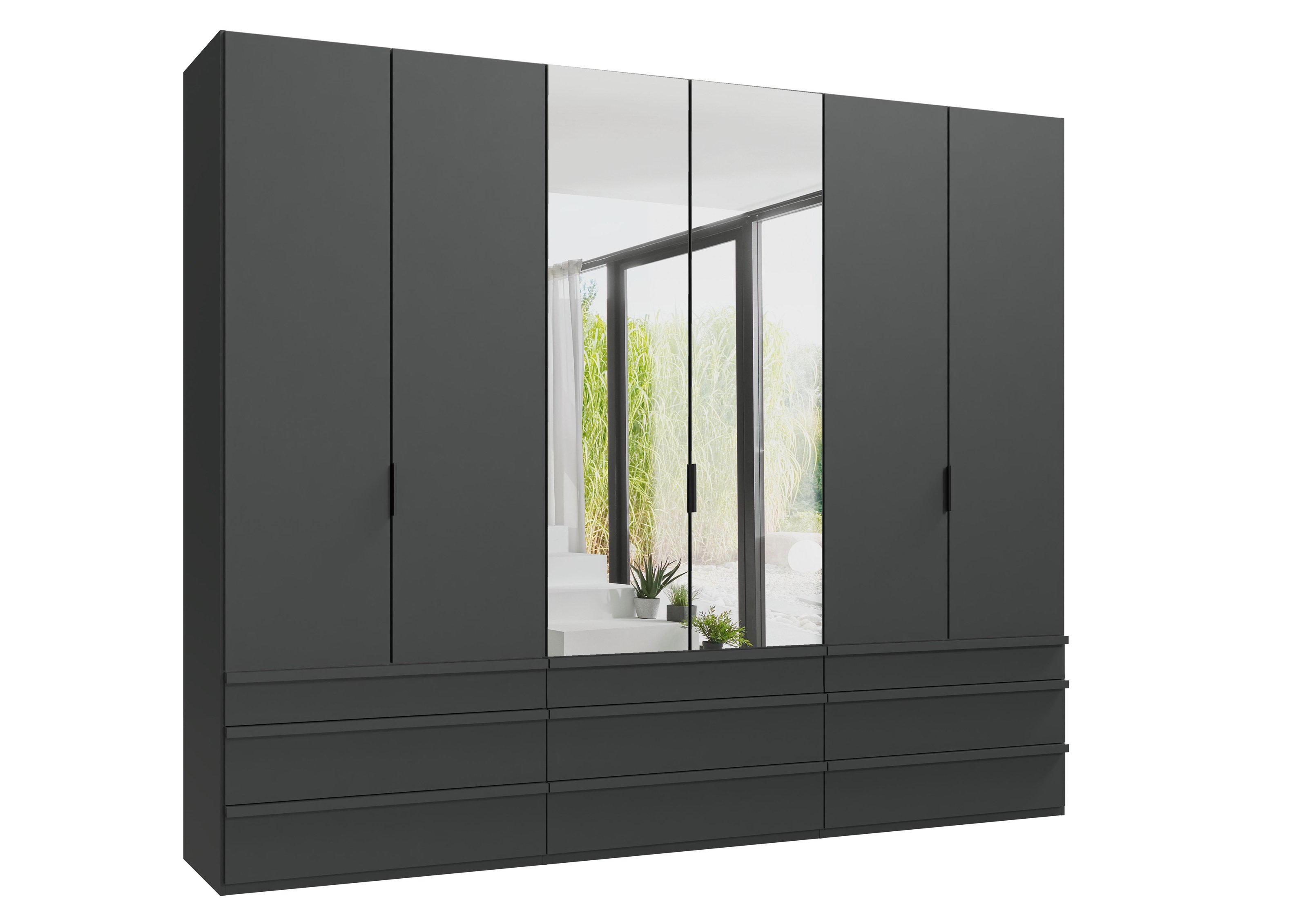 Die sechs Falttüren – mit zwei Türen links und einer rechts angeschlagen je Türenpaar – lassen sich komfortabel öffnen und sind besonders praktisch, wenn vor dem Schrank nur begrenzt Stellfläche zur Verfügung steht. So greifen Sie schnell auf Ihre Kleidung zu, während die Falttürtechnik den Bewegungsraum im Schlafzimmer schont.