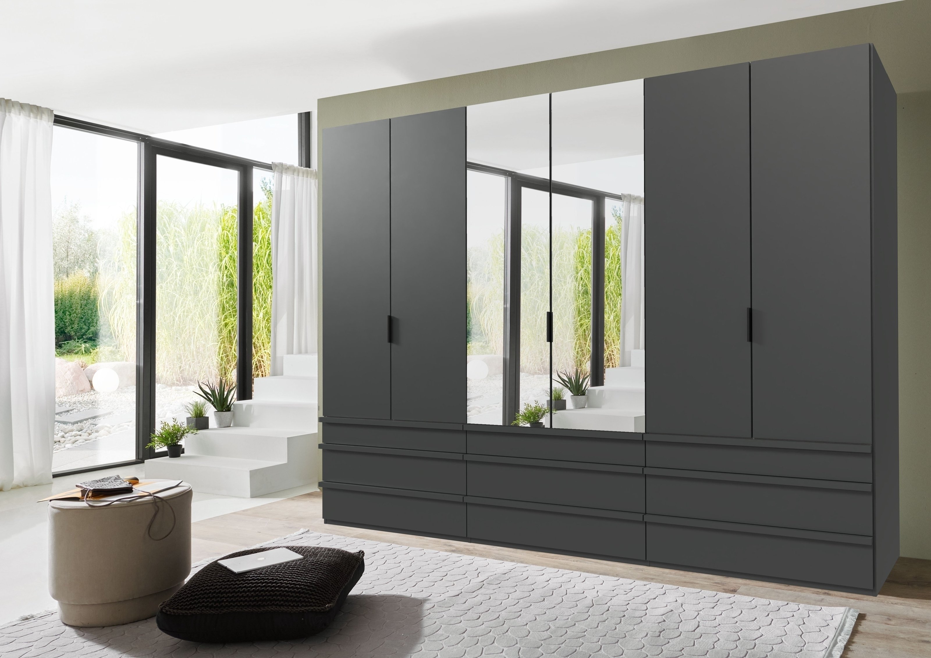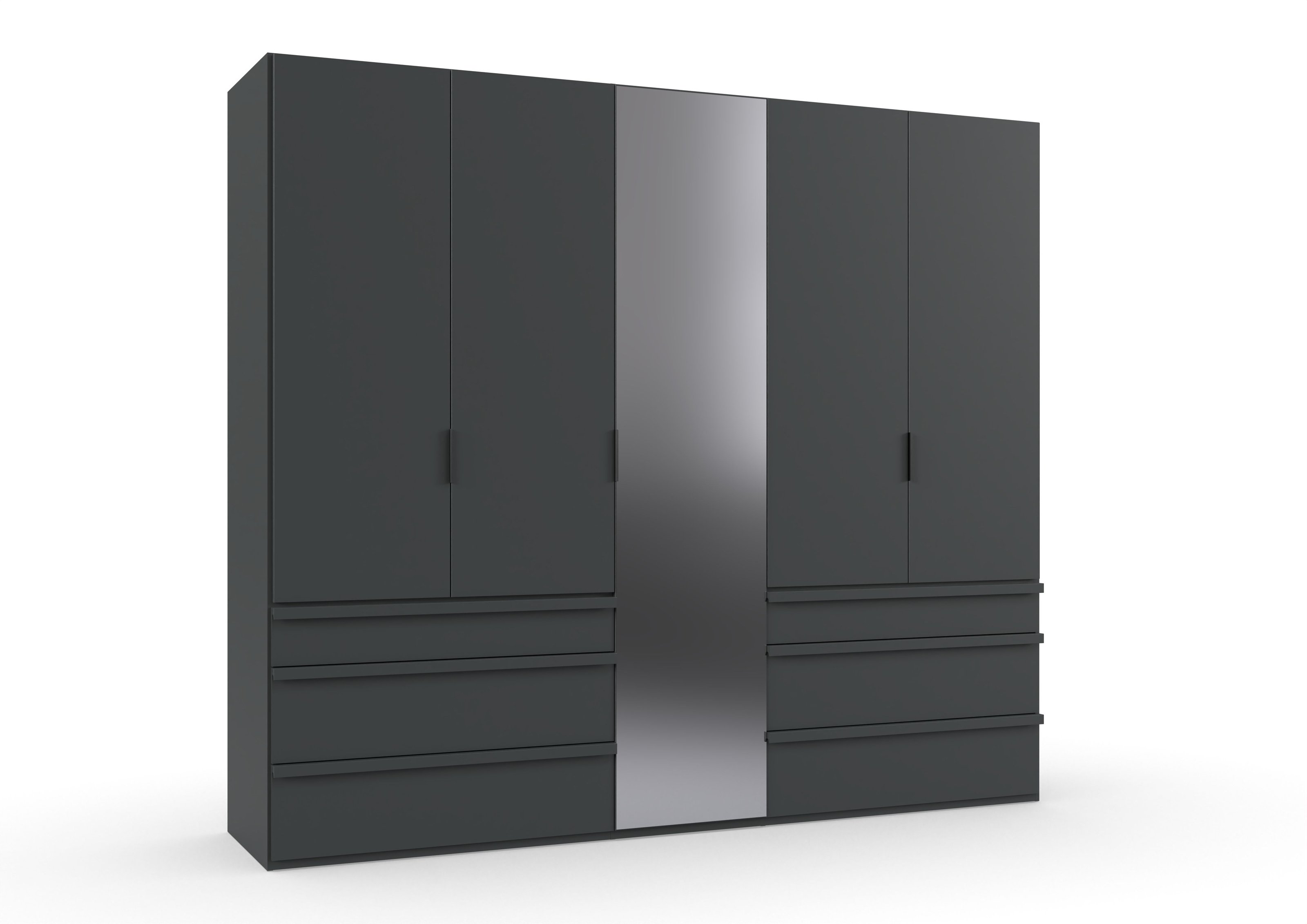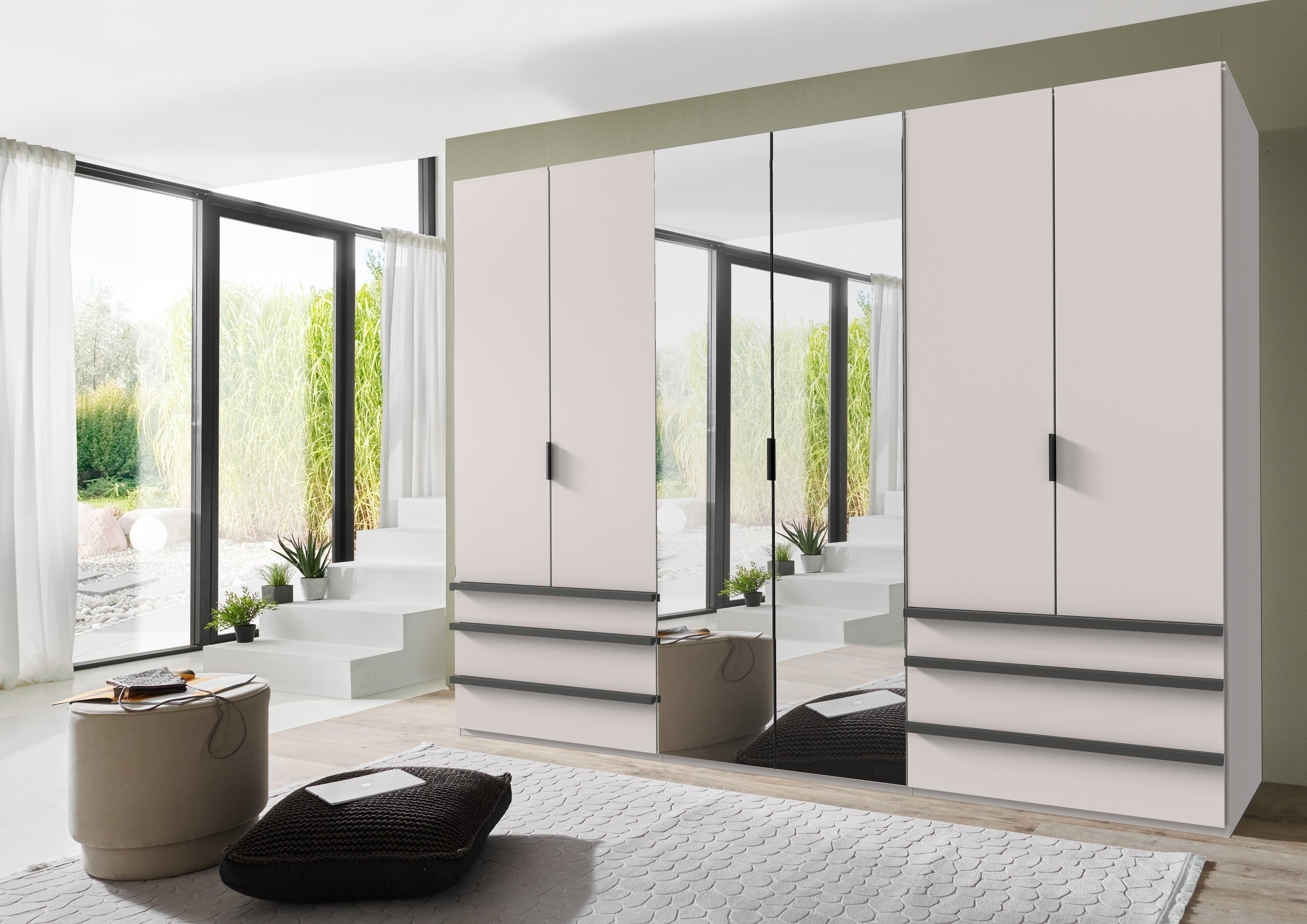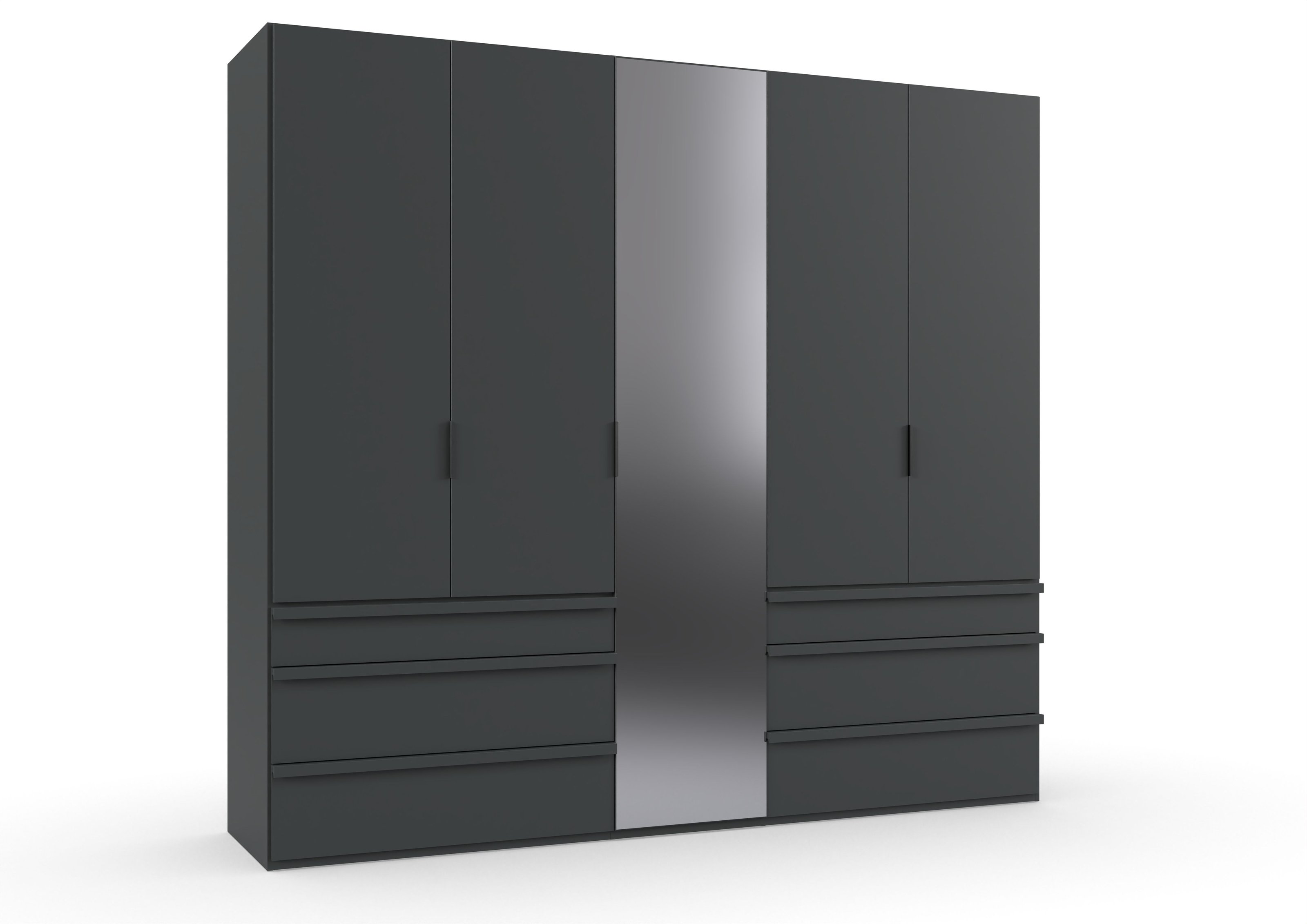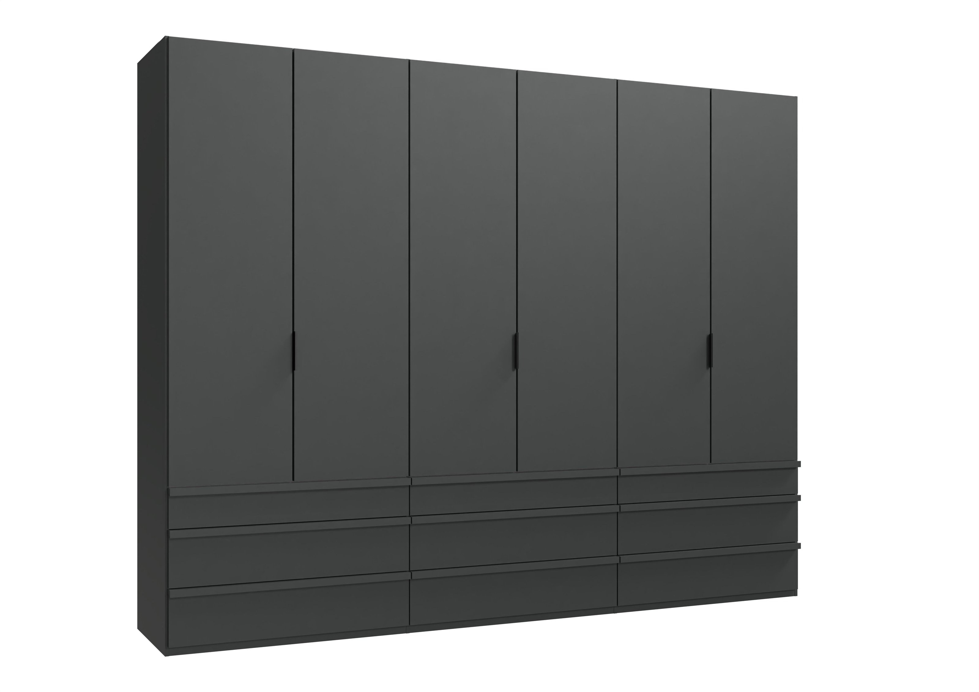 Die sechs Falttüren – mit zwei Türen links und einer rechts angeschlagen je Türenpaar – lassen sich komfortabel öffnen und sind besonders praktisch, wenn vor dem Schrank nur begrenzt Stellfläche zur Verfügung steht. So greifen Sie schnell auf Ihre Kleidung zu, während die Falttürtechnik den Bewegungsraum im Schlafzimmer schont.