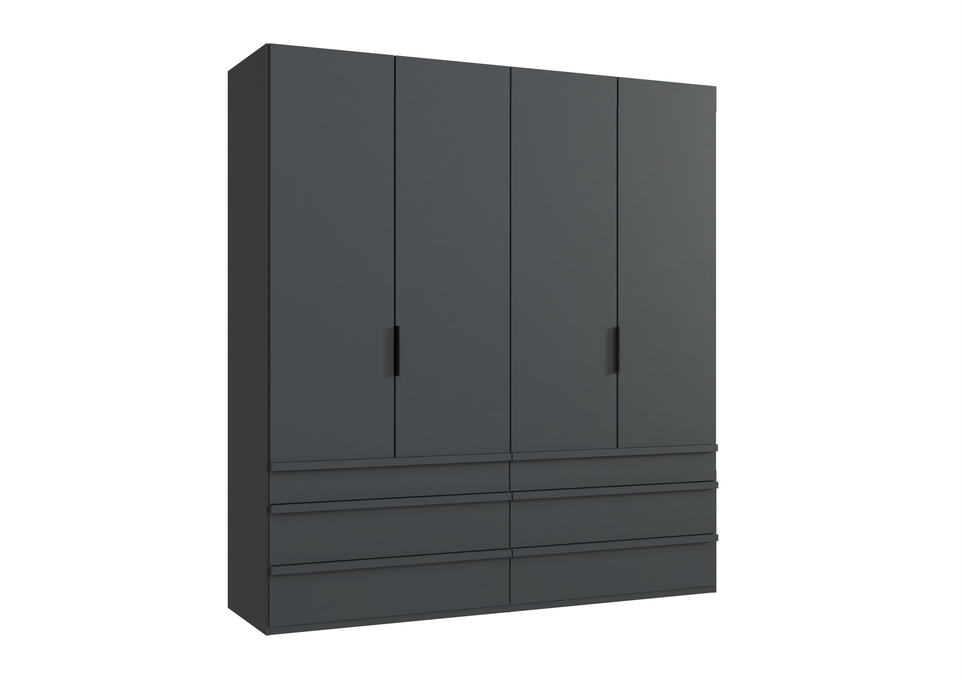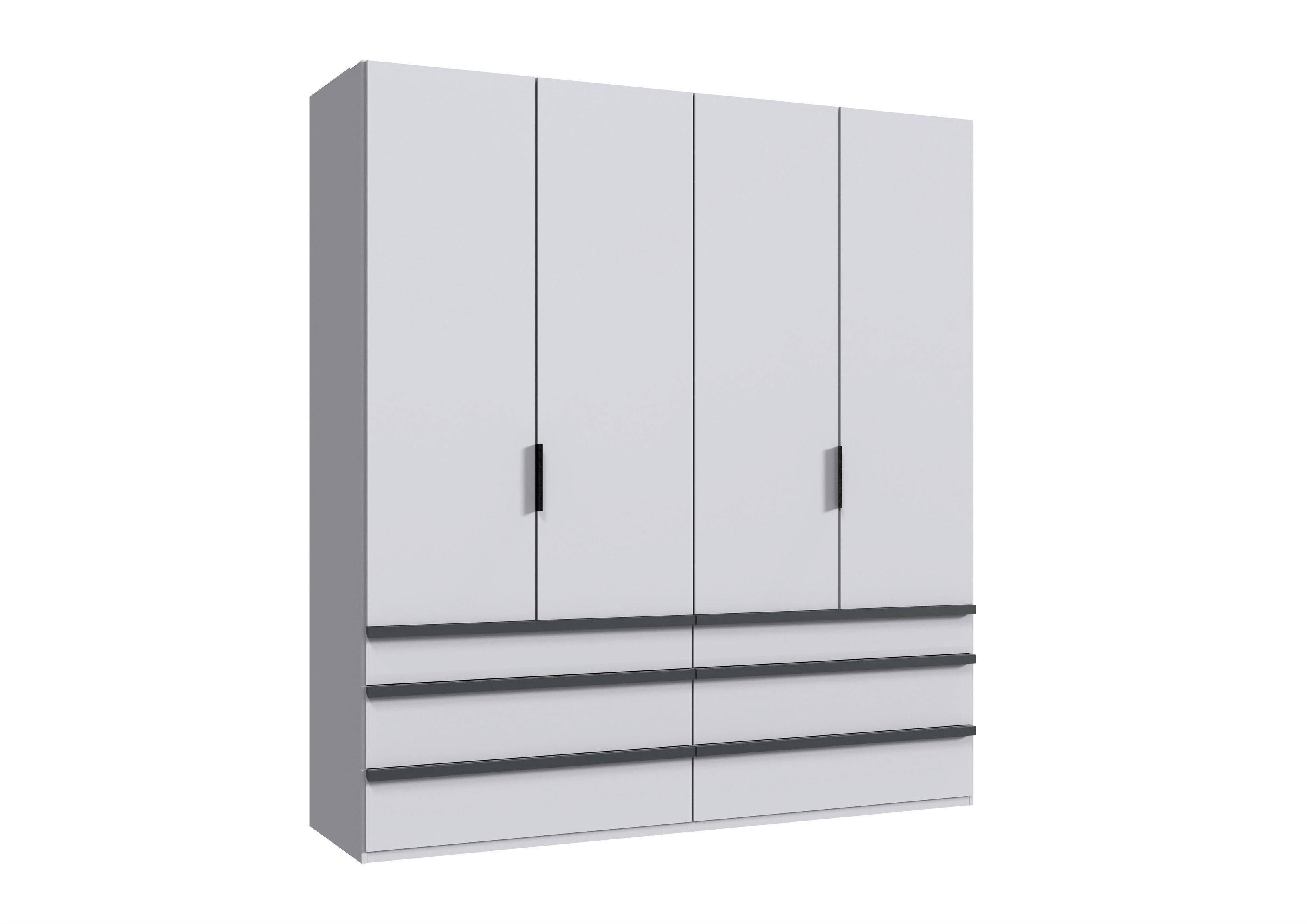 Sechs praktische Falttüren – mit zwei links und einer rechts angeschlagenen Türenpaaren – erleichtern den Zugriff auf den Innenraum und sparen Platz beim Öffnen, sodass sich der Schrank ideal auch für etwas kleinere Schlafzimmer eignet.