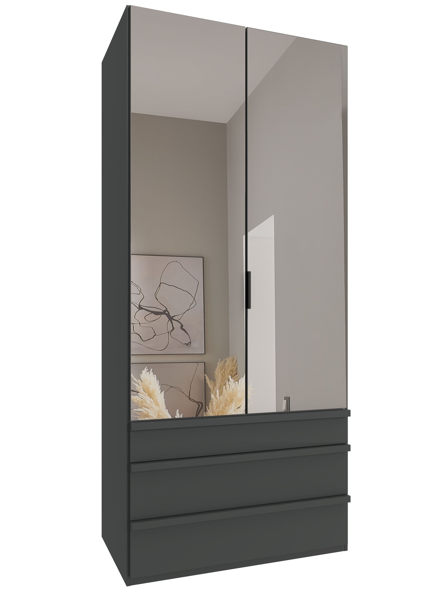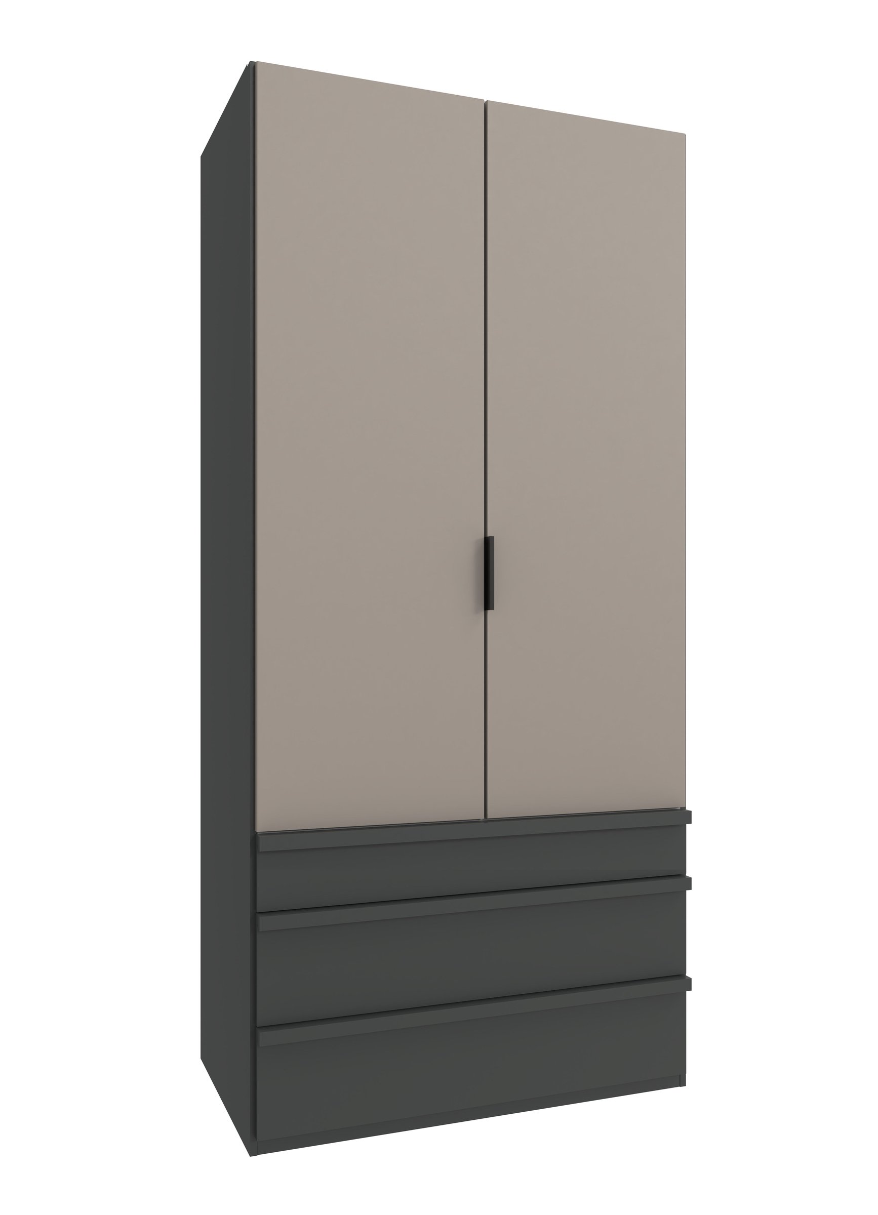 Der Korpus in GRAPHIT in Kombination mit Türen in SAHARAGRAU sowie die robuste Spanplattenkonstruktion verleihen dem OXFORD Schrank einen modernen Look, pflegeleichte Oberflächen und langlebige Stabilität – Made in Germany.