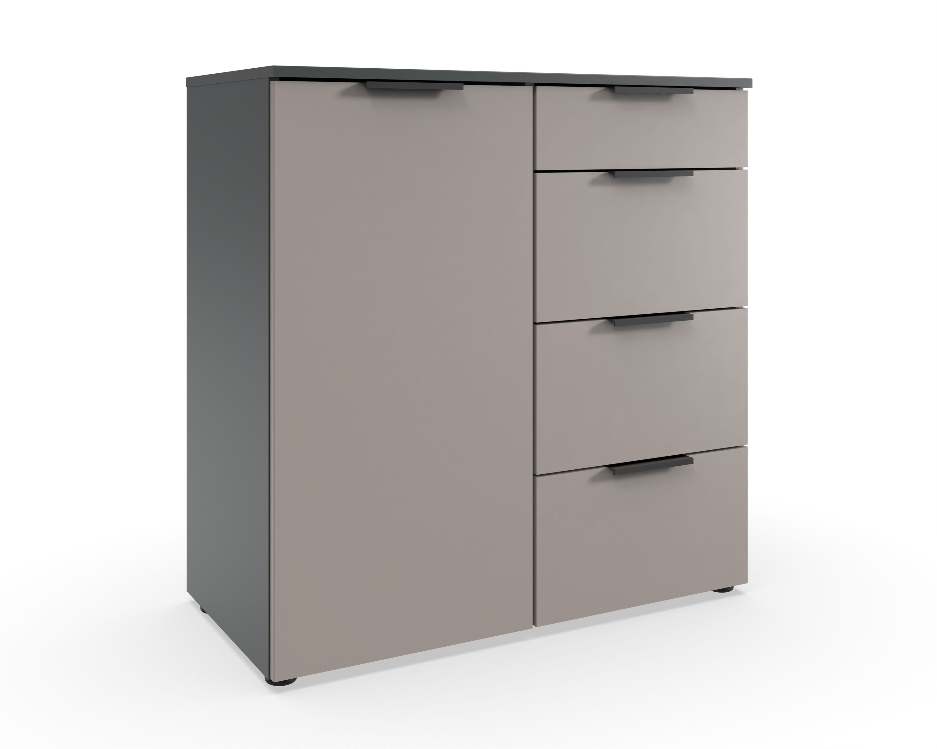 Der Korpus in GRAPHIT und die Türen in SAHARAGRAU unterstreichen den modernen Wohnstil und lassen sich harmonisch in verschiedene Einrichtungskonzepte integrieren. Die verwendete Spanplatte sorgt für Stabilität, Langlebigkeit und pflegeleichte Oberflächen, die mit den im beiliegenden Produkt- und Materialpass beschriebenen Pflegehinweisen lange schön bleiben.