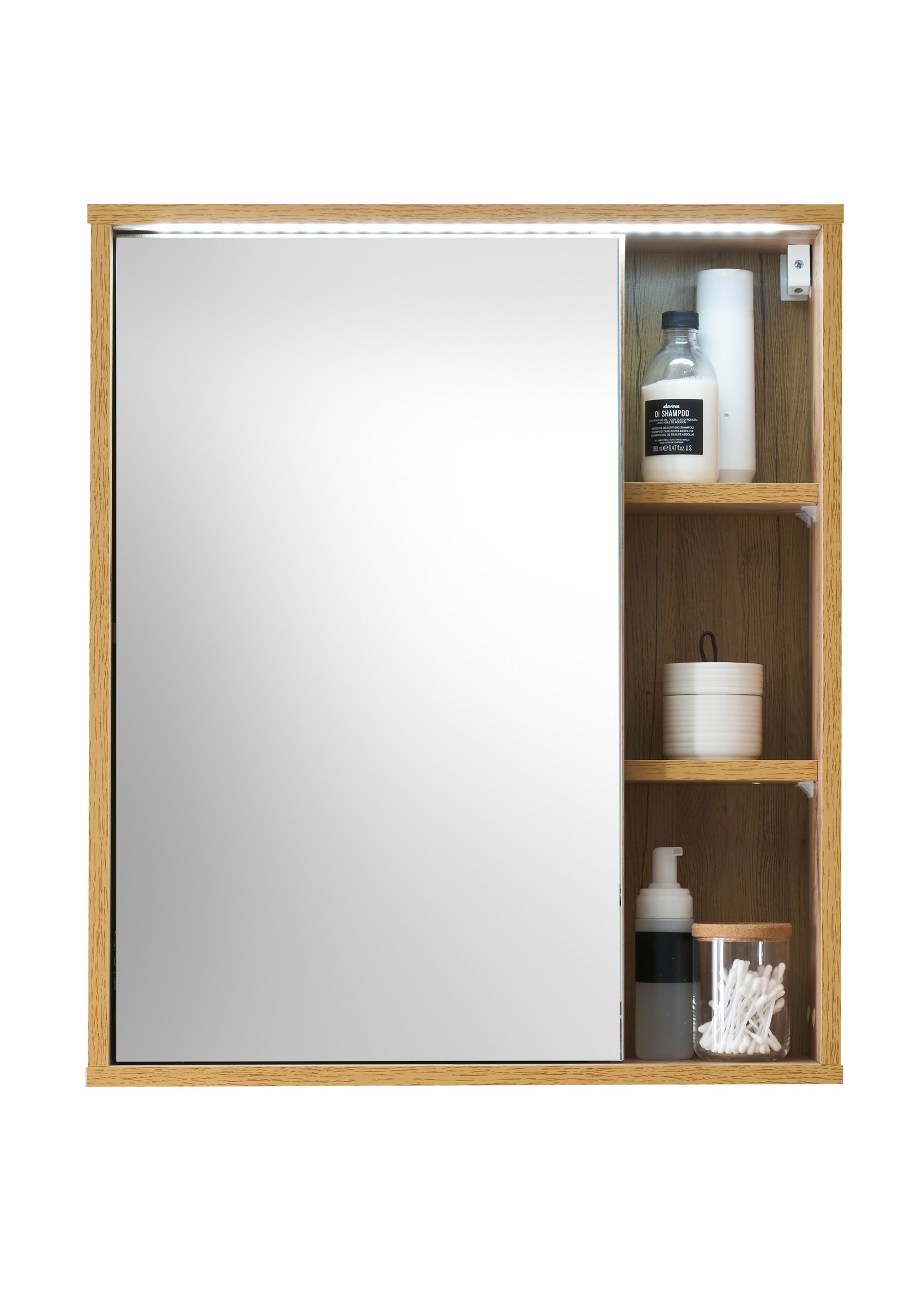 [BulletPoints] => MODERN - Der Spiegelschrank besticht durch sein klares Design in Wotan Eiche Optik, das wunderbar in zahlreiche Badezimmer passt und sich zudem ideal mit bereits vorhandenem Mobiliar kombinieren lässt.;VIEL STAURAUM - Der Schrank bietet hinter einer Tür mit einem Einlegeboden und einem offenen Fach mit zwei weiteren Einlegeböden viel Stauraum und einen schnellen Zugriff auf Ihre Badutensilien.;MIT LED-BELEUCHTUNG - Der Spiegelschrank verfügt über eine energiesparende und langlebige LED-Beleuchtung, die eine helle und angenehme Lichtquelle bietet, um das Badezimmer optimal auszuleuchten.;LEICHTE MONTAGE - Der Spiegelschrank ist dank der detaillierten Anleitung schnell & leicht montiert und somit für Anfänger geeignet. Das Montage-Material ist inklusive;PRODUKTDATEN - Badspiegelschrank inkl. LED Beleuchtung. Spiegelschrank mit Korpus in Wildeiche Optik melaminbeschichtet. Schrank mit 1 Spiegeltür und innen 1 Einlegeboden mit Steckdose, 1 offenes Fach mit 2 Einlegeböden, Schrank belastbar bis max. 10 kg, Maß BxHxT 60x70x20 cm, Lieferung erfolgt zerlegt