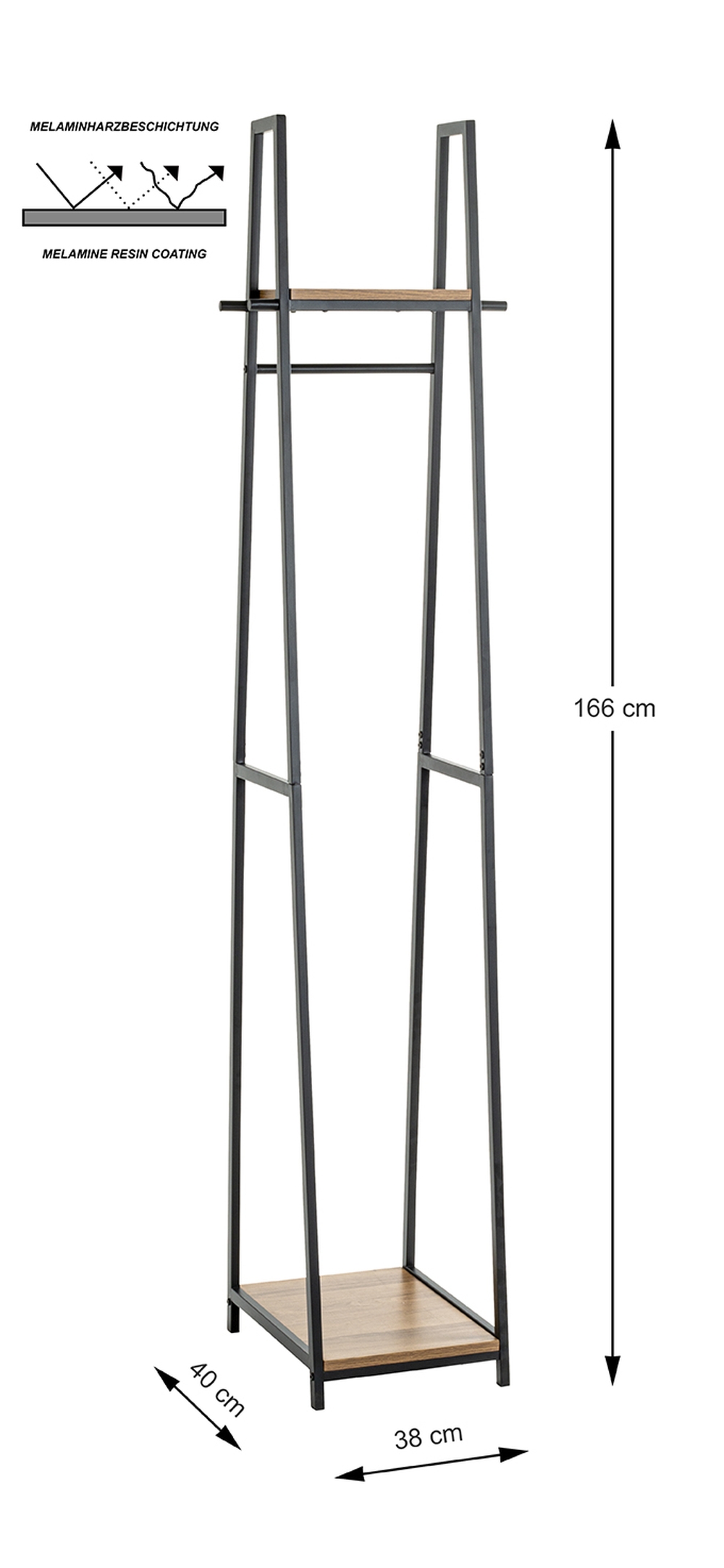 Die Kombination aus eichefarbenen MDF-Ablagen und schwarz lackiertem Metallgestell verleiht der Garderobe einen zeitgemäßen Look. Eine Kleiderstange und zwei Ablagen bieten verschiedene Möglichkeiten, Kleidung, Schuhe und Taschen griffbereit zu organisieren.