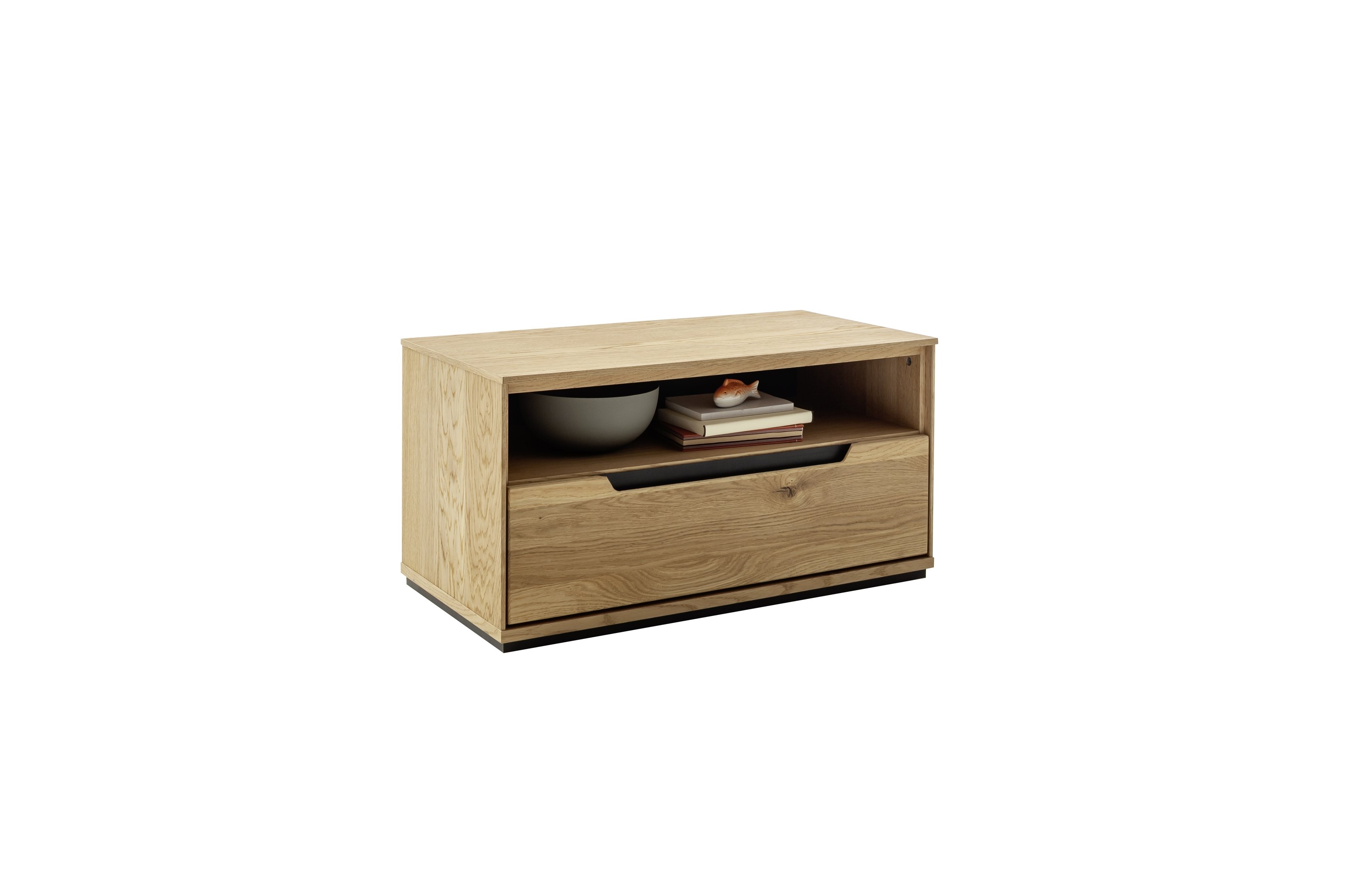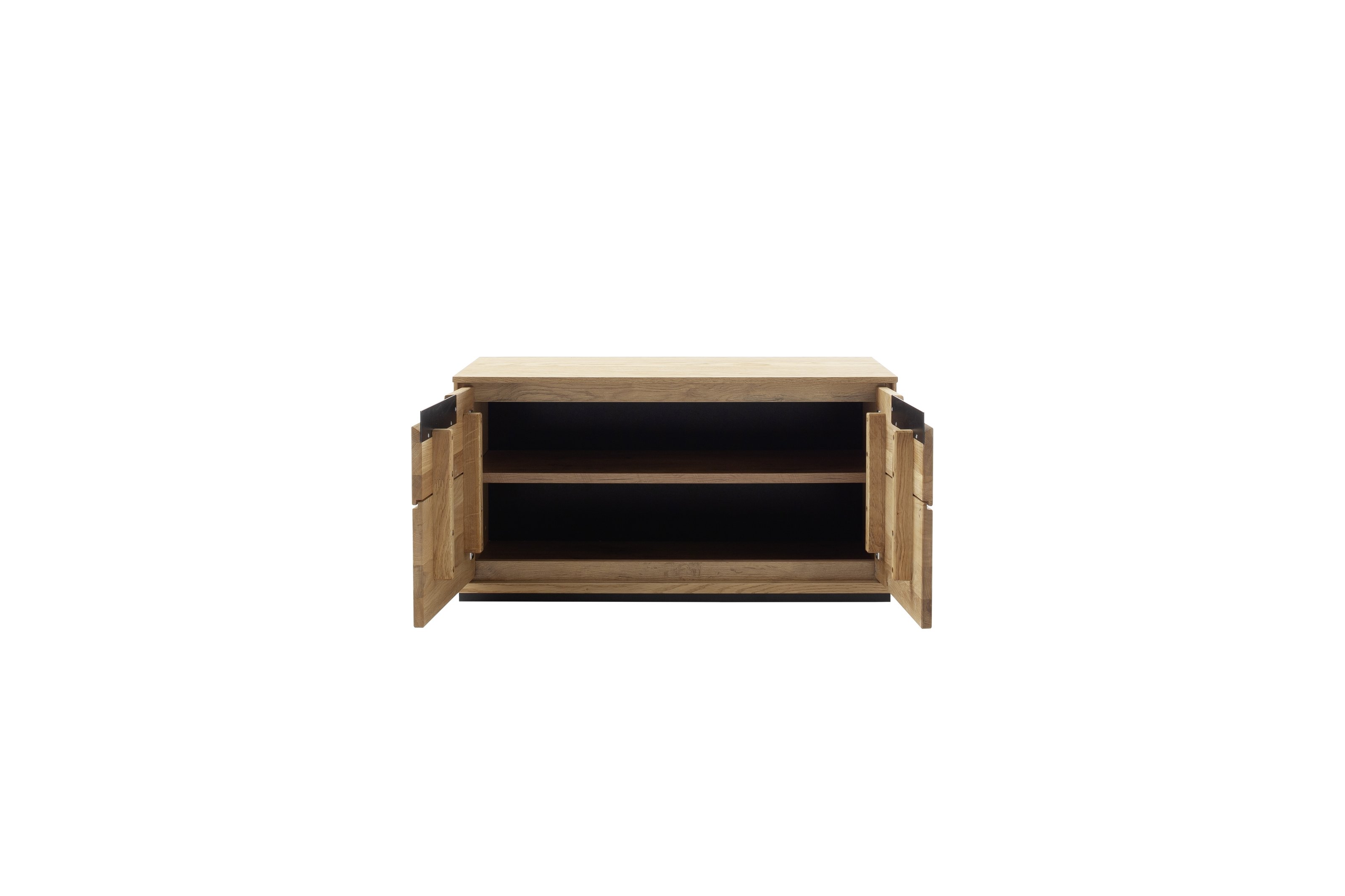 [Bullet-Point 2] => Massive Wildeiche-Fronten, geölt, und ein Korpus aus eichefurniertem Holzwerkstoff verleihen der Kommode ARAYA eine hochwertige, natürliche Holzoptik mit schwarzen Akzenten.