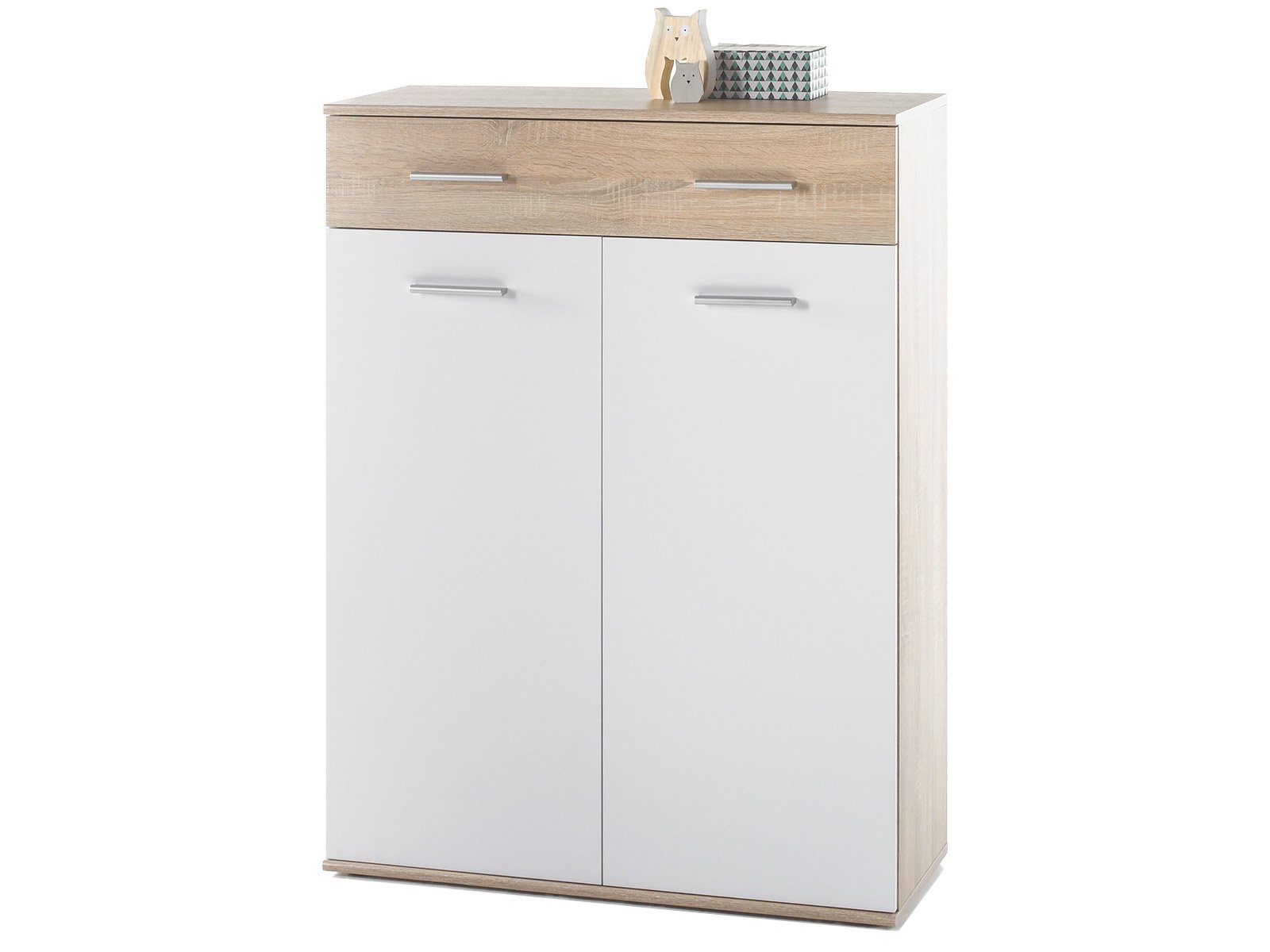 [metaDescription] => Moderner Schuhschrank aus Spanplatte, Korpus in Sonoma-Eiche Nachbildung, Front in Weiß mit 2 Holztüren, 1 Schubkasten, 2 Konstruktionsböden und 6 Einlegebö