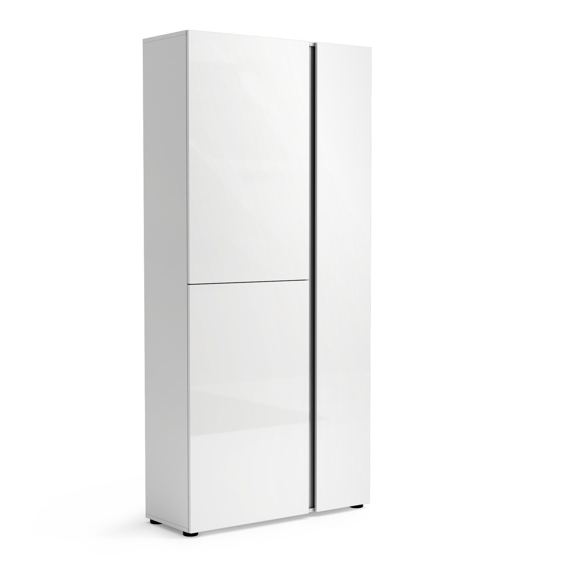 Das moderne, geradlinige Design in strahlendem Weiß wirkt hell und freundlich und lässt sich sehr gut mit bestehenden Möbeln und Böden kombinieren. Die einheitlich weiße Farbgebung von Korpus, Türen, Einlegeböden und Innendekoren sorgt für ein ruhiges, harmonisches Gesamtbild – ideal für einen einladenden ersten Eindruck im Zuhause.