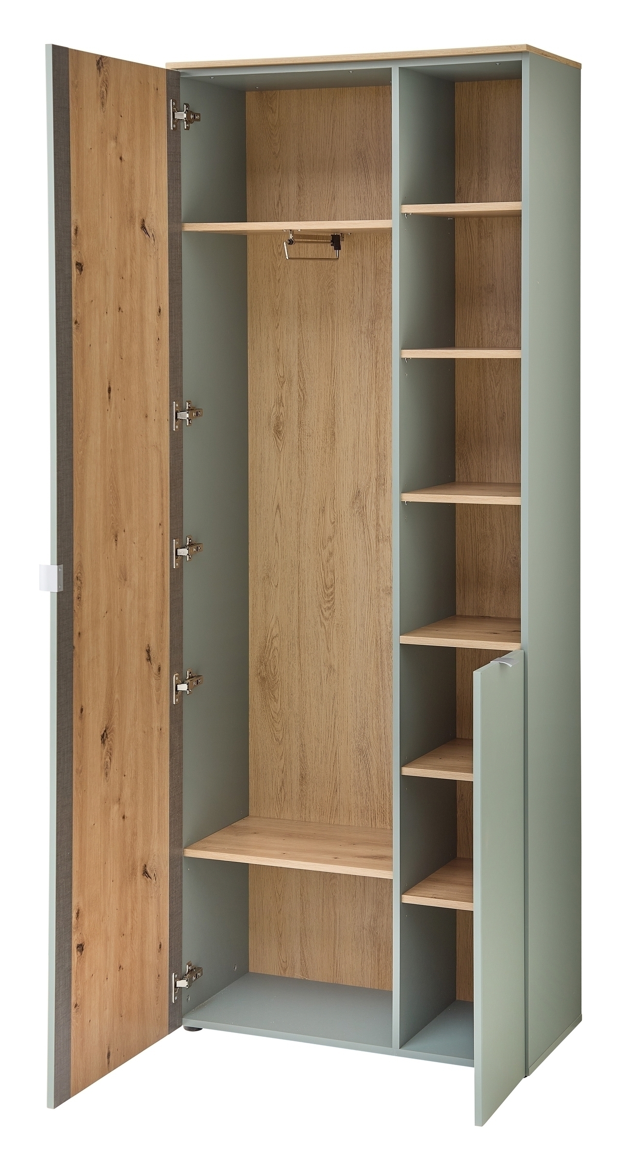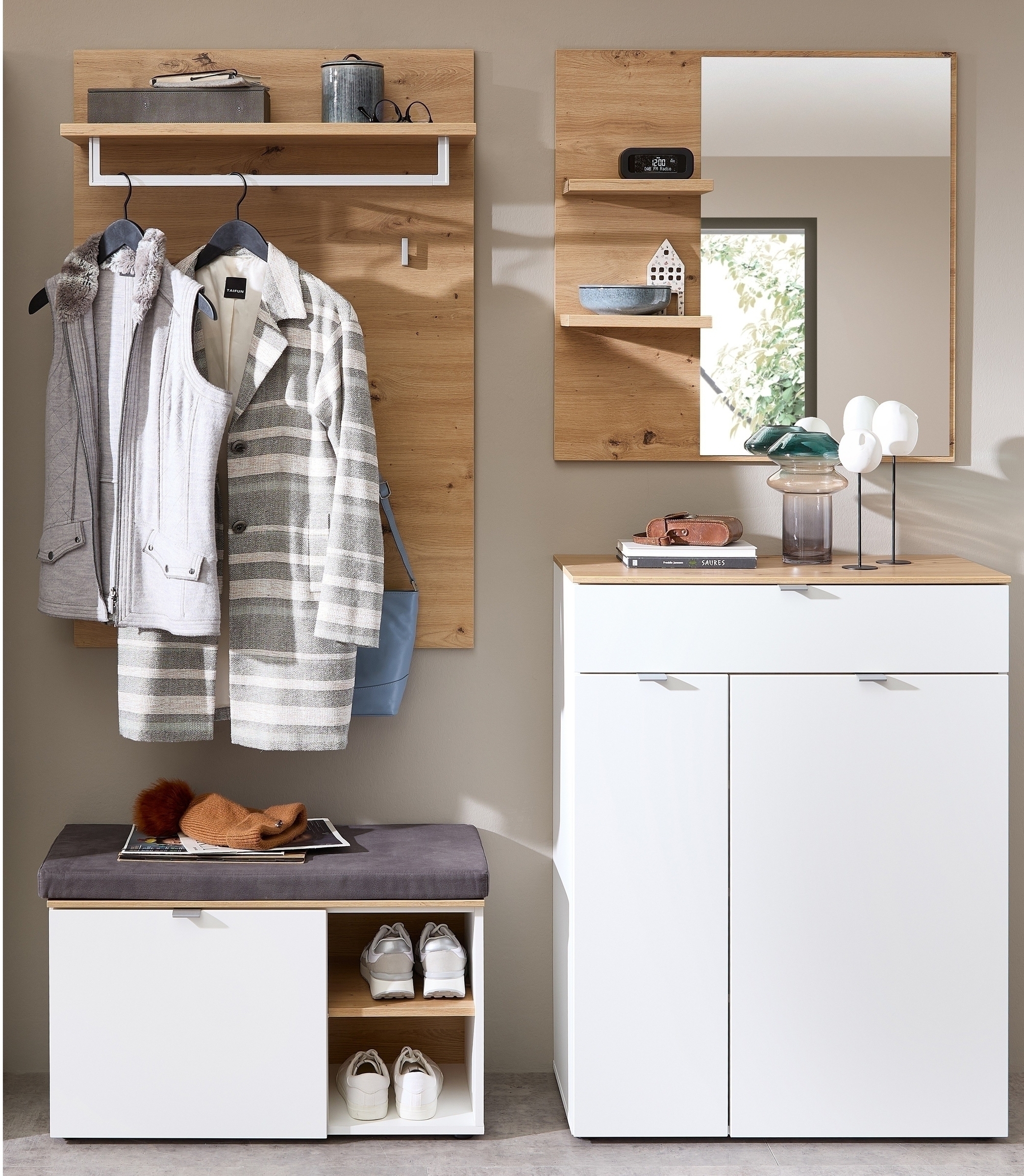 Optisch überzeugt "Bari" durch die zeitlose Kombination aus weiss supermatt und Artisan Eiche Dekor, die einen modernen, wohnlichen Charakter schafft. Die silbermatten Metallgriffe greifen das klare Design auf und setzen dezente Akzente. Damit fügt sich das Set mühelos in verschiedene Einrichtungsstile ein und lässt Ihren Eingangsbereich freundlich und einladend wirken.