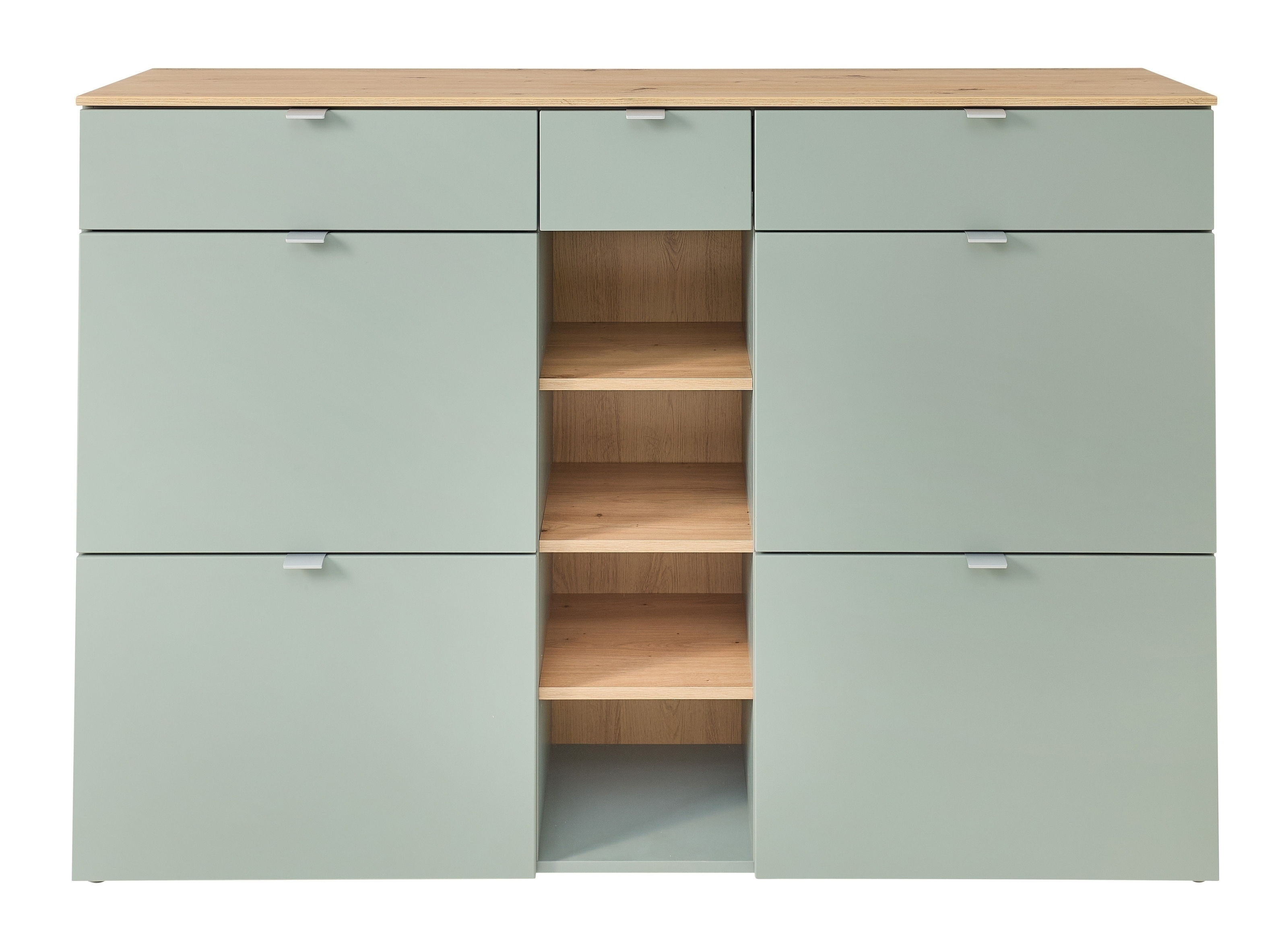 Die Kombination aus weiss supermatt und Artisan Eiche Dekor verleiht dem Set einen eleganten und zugleich natürlichen Look, silbermatte Metallgriffe runden das Gesamtbild harmonisch ab. Gefertigt aus robustem Holzwerkstoff (MDF- und Spanplatten) und FSC-zertifiziert, verbindet "Bari" langlebige Qualität mit nachhaltiger Materialwahl.