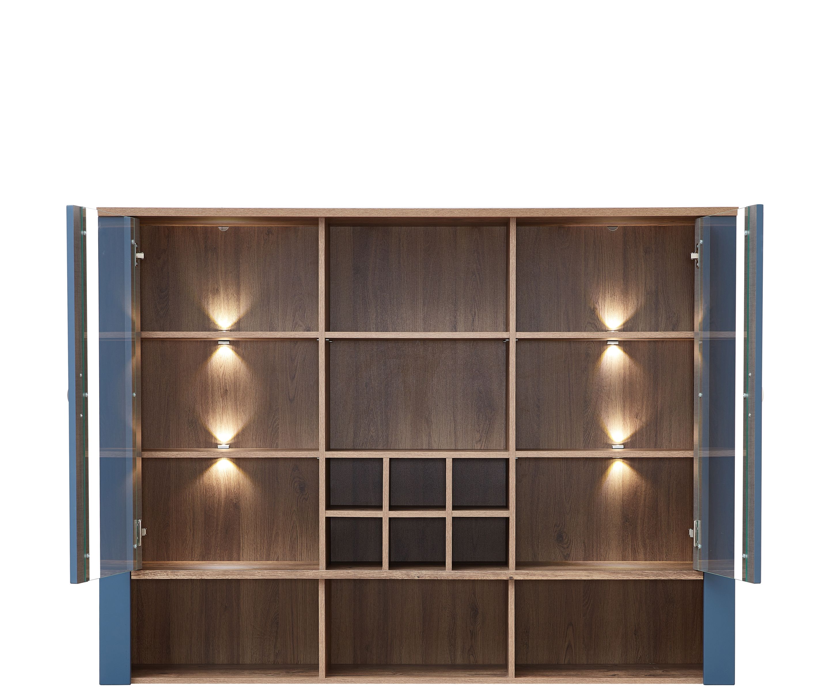 [metaDescription] => moderne Vitrine, aus Spanplatte und MDF, in Parisian Blue Nachbildung, Absetzung in Haveleiche Cognac Nachbildung Breite 98 cm, Höhe 134 cm, Tiefe 38 cm