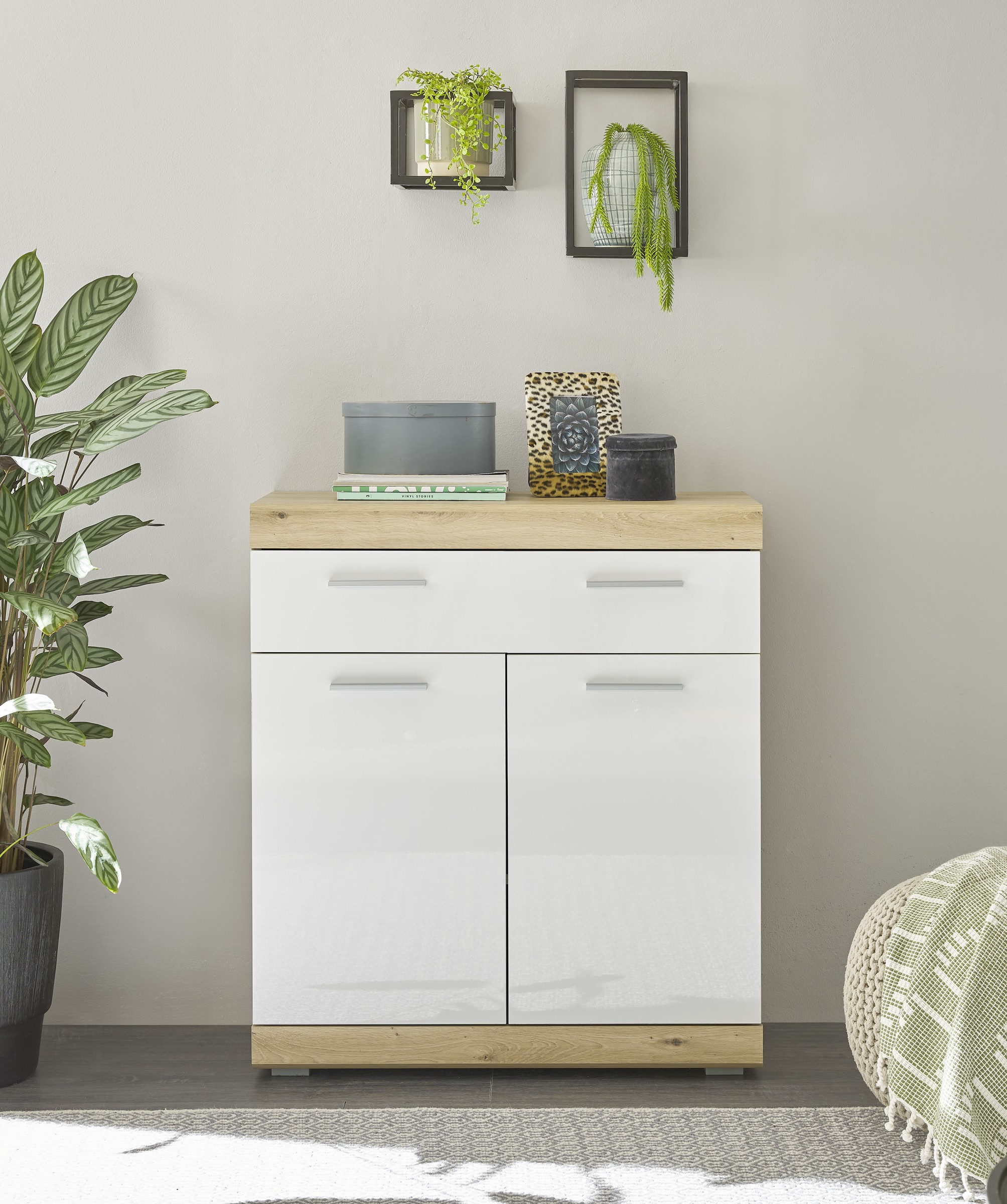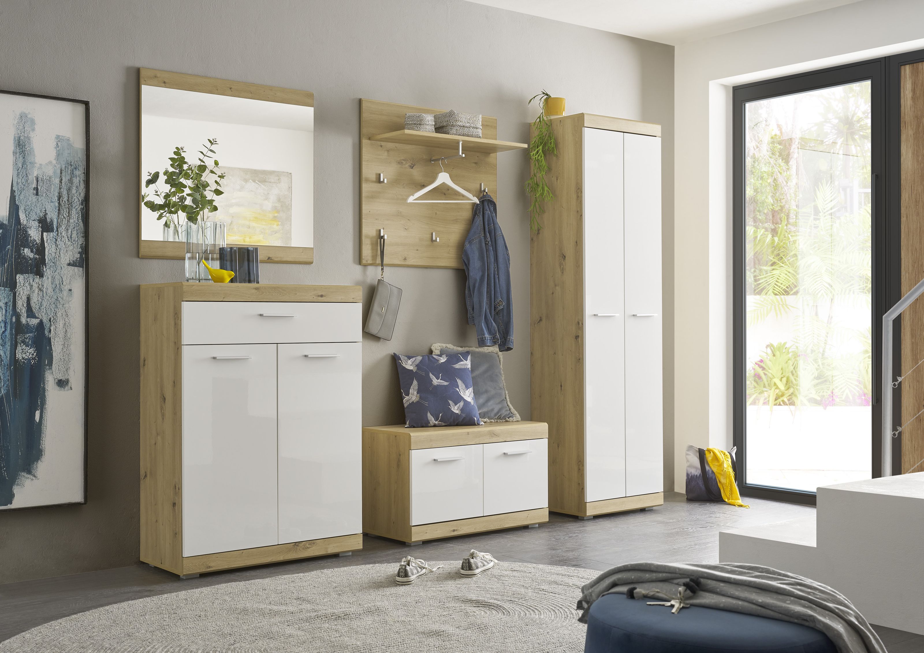 Die sorgfältig abgestimmte Optik in Weiß-Eiche Artisan kombiniert ein warmes, natürlich wirkendes Dekor mit modernen weißen Hochglanz-Absetzungen. So fügt sich das Set harmonisch in verschiedene Wohnstile ein und setzt gleichzeitig einen hochwertigen Akzent im Flur. Die moderne Formensprache unterstreicht den zeitgemäßen Charakter dieser Garderobenkombination.