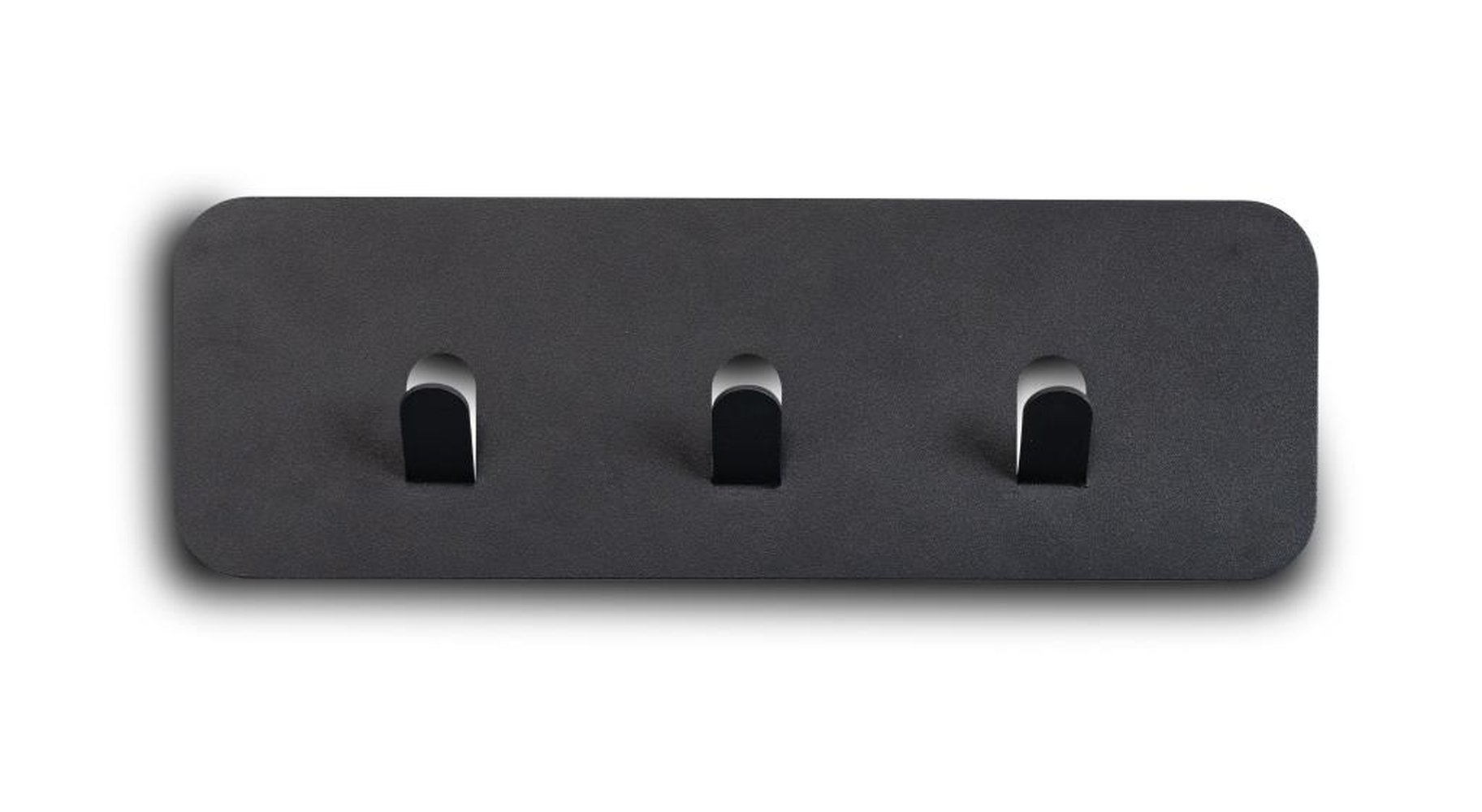 Drei anthrazitfarbene Haken sorgen für eine organisierte Aufbewahrung von Jacken und Taschen.