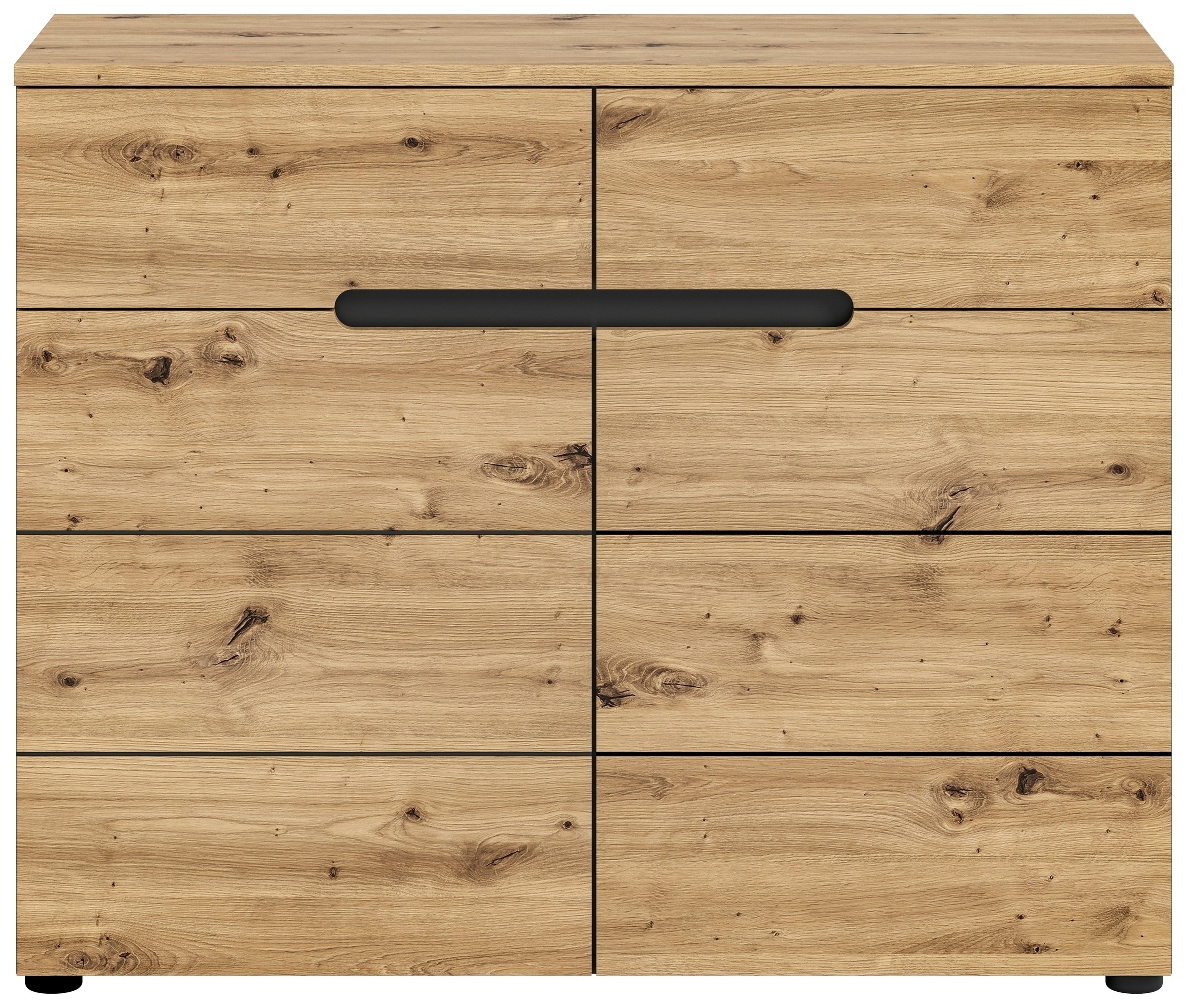 Die Kombination aus Basalt Grau und Artisan-Nachbildung im modernen Stil fügt sich harmonisch in unterschiedliche Wohnkonzepte ein, während die melaminbeschichteten, pflegeleichten Oberflächen aus FSC®-zertifiziertem Holzwerkstoff für langlebige Stabilität und einfache Reinigung sorgen.