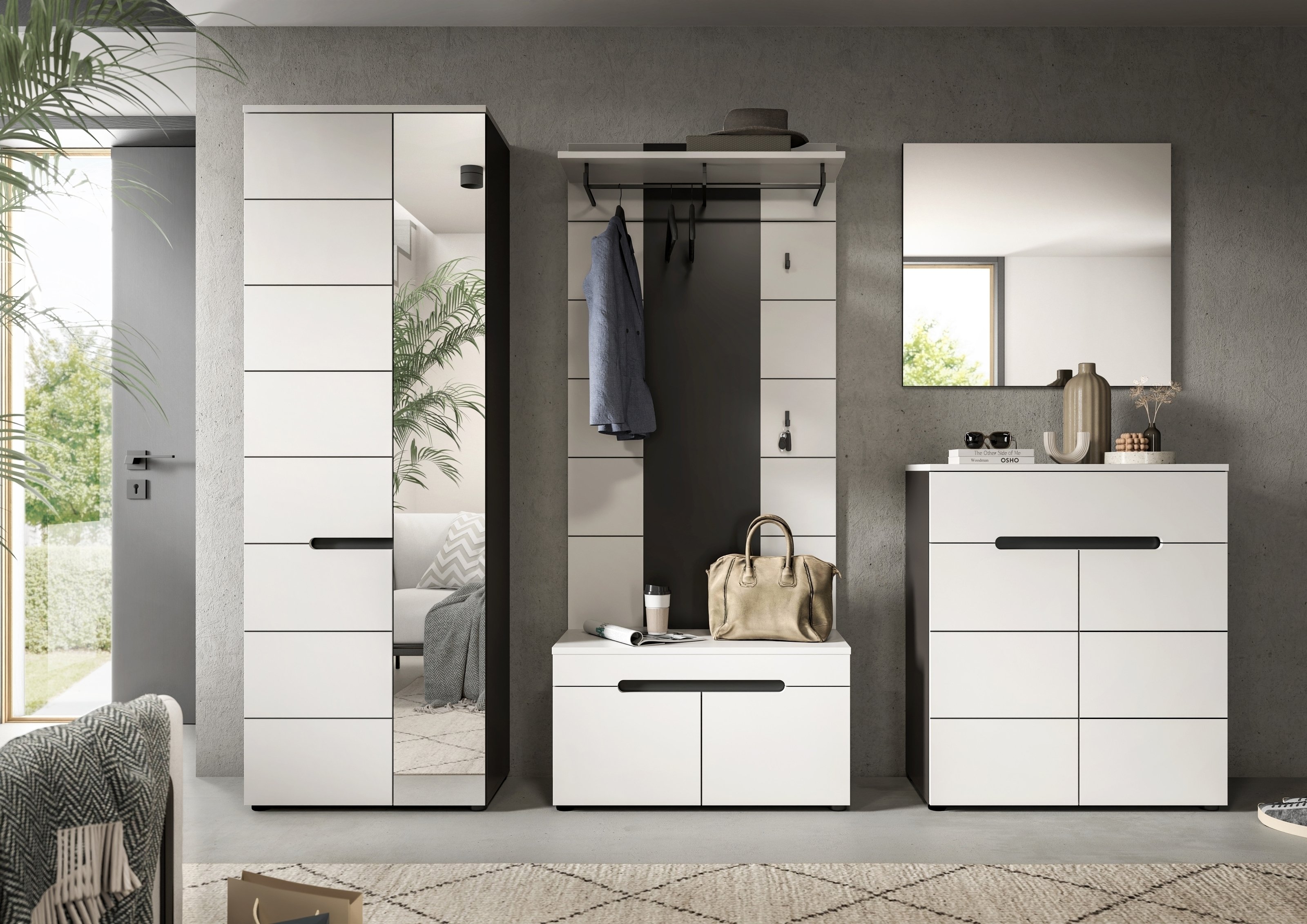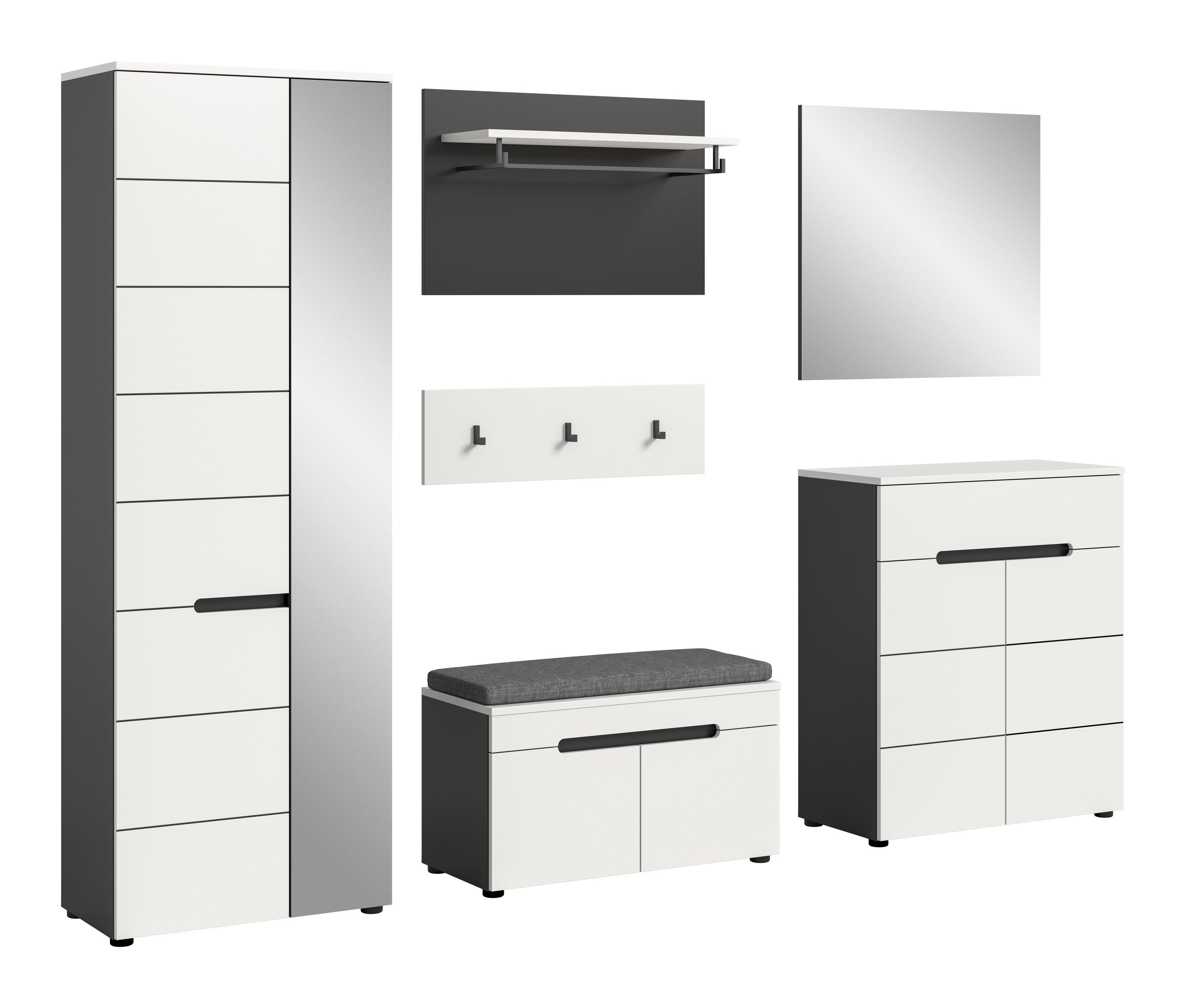 Die Kombination aus Basalt Grau und Weiß Nachbildung verleiht Ihrem Eingangsbereich einen modernen, freundlichen Look, während die melaminbeschichteten Oberflächen angenehm pflegeleicht bleiben. Jacken schnell einhängen, Tasche aufhängen und Mütze oder Schal ablegen – so wirkt der Flur im Alltag direkt aufgeräumter.