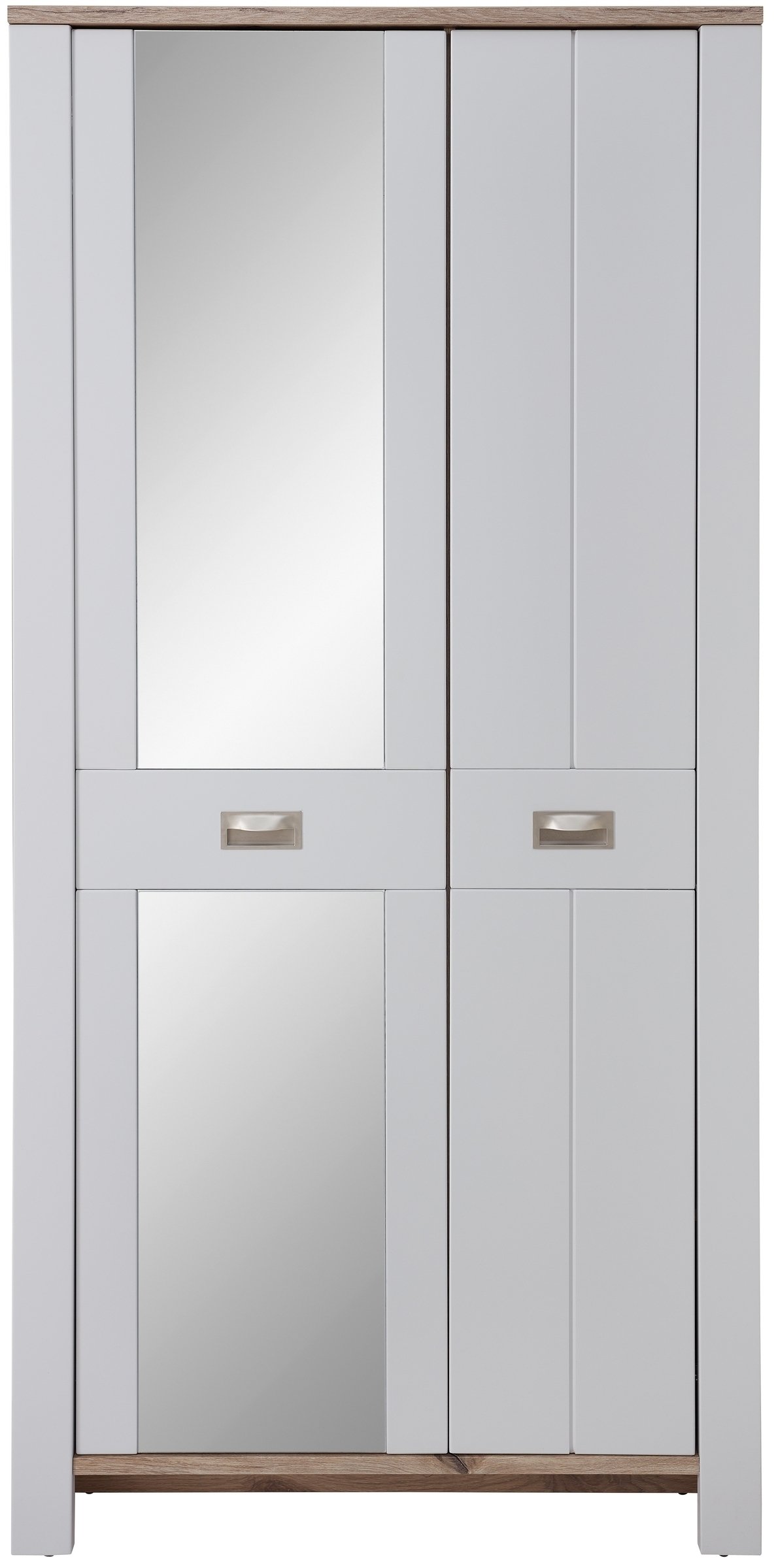 Die Kombination aus MDF und Spannplatte mit folierter, tiefgezogener Oberfläche sorgt für eine pflegeleichte und zugleich wertige Optik. Markante Längsrillen, die warme Viking Oak Hutablage und Muschelgriffe in mattem Nickel unterstreichen das moderne Landhaus-Design der Serie DIJON.