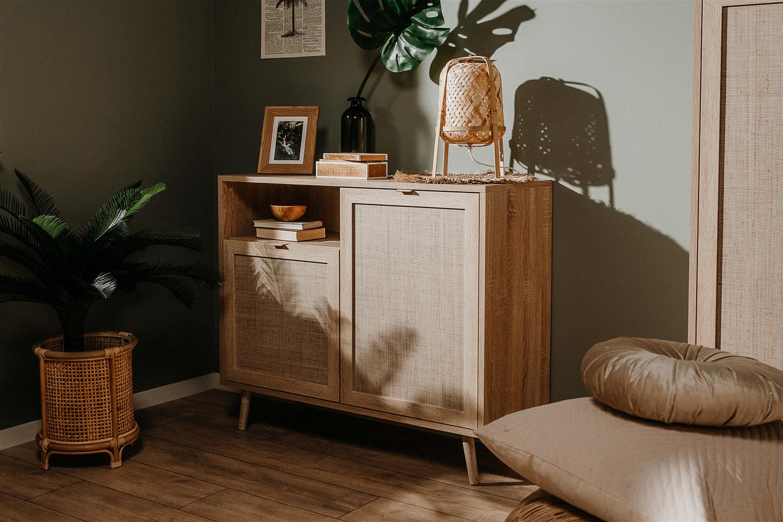 Besonders charakteristisch ist das Rafia-Geflecht-Dekor im Bast-Look, das dem Paneel eine echt wirkende, natürliche Note verleiht. Dieser dekorative Akzent fügt sich hervorragend in skandinavisch geprägte Wohnkonzepte ein und lässt sich vielseitig mit weiteren Möbeln in Holz- oder Holz-Nachbildung kombinieren.