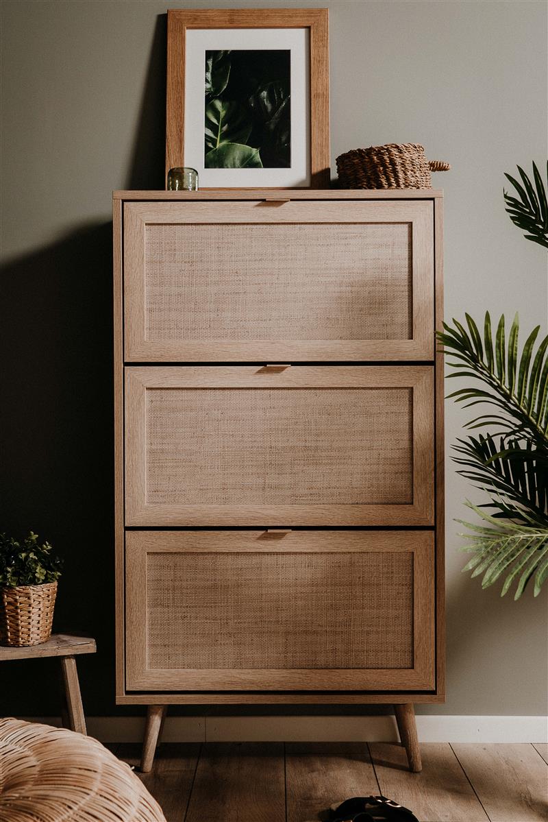 Das dekorative Rafia-Geflecht-Dekor mit echt wirkendem Bast-Look verleiht dem Paneel einen natürlichen, skandinavischen Charakter, der sich harmonisch in helle, freundliche Wohnkonzepte einfügt. Der Korpus im Dekor Sonoma Eiche rundet das Gesamtbild ab und sorgt für eine warme, wohnliche Ausstrahlung im Eingangsbereich.