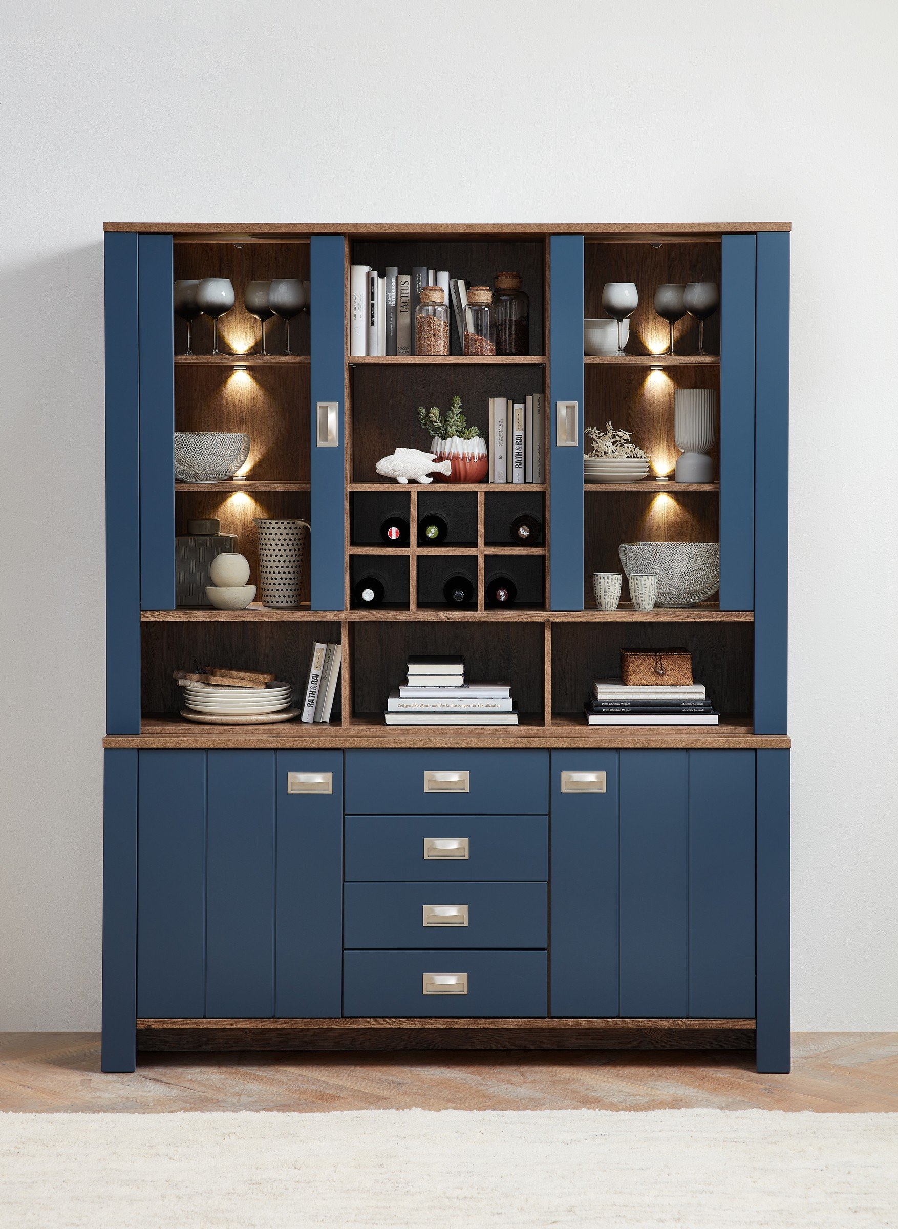 [metaDescription] => moderne Vitrine, aus Spanplatte und MDF, in Parisian Blue Nachbildung, Absetzung in Haveleiche Cognac Nachbildung Breite 98 cm, Höhe 134 cm, Tiefe 38 cm