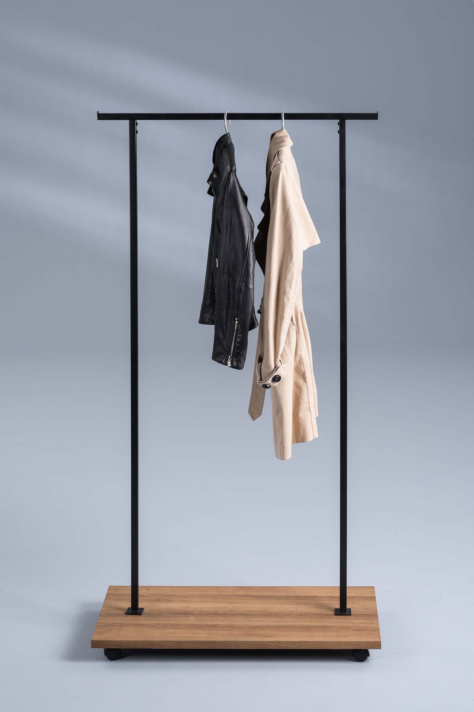 Garderobenständer Eisenach – Moderner Garderobenständer mit Rollen und MDF-Bodenplatte