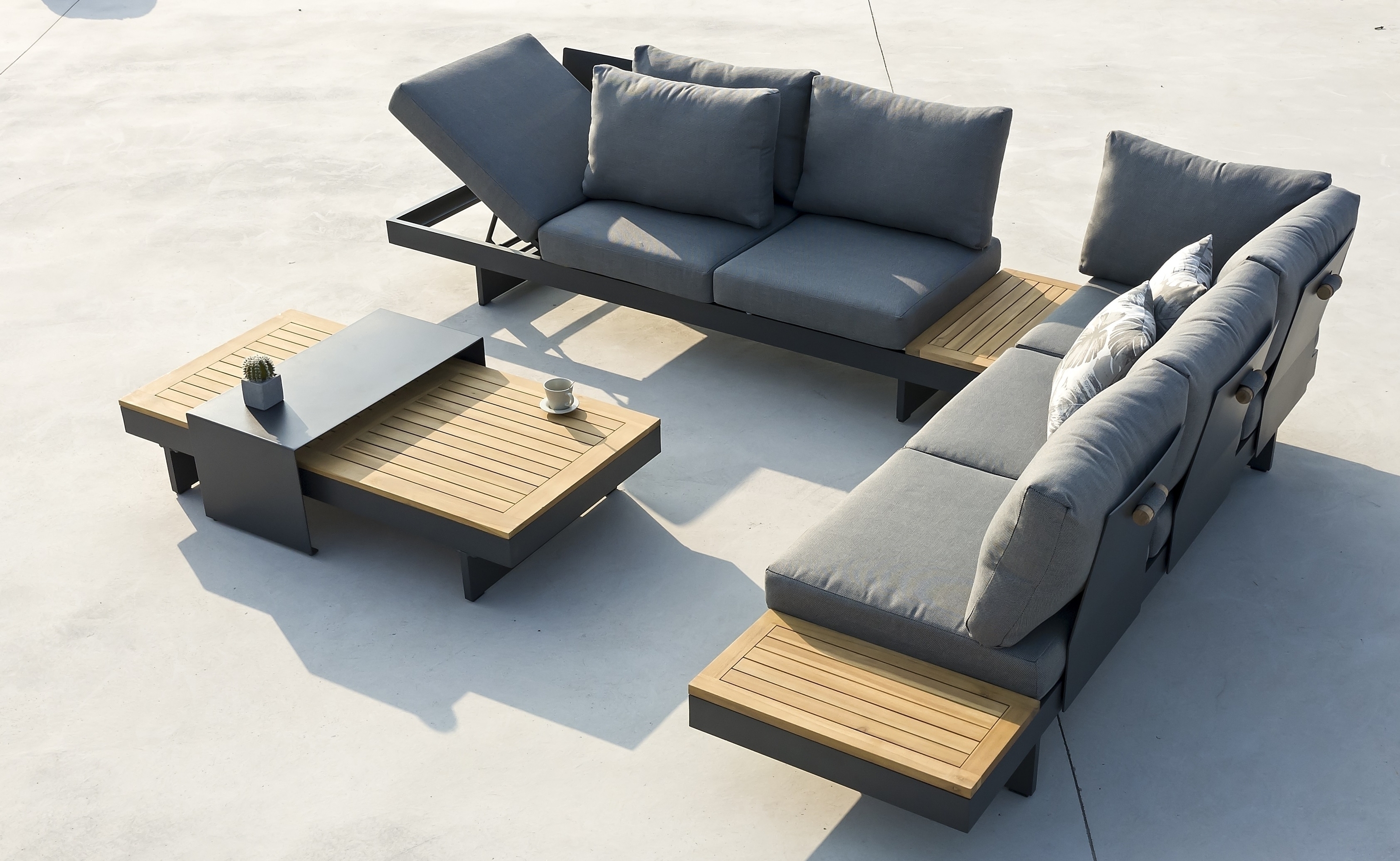 Ein Highlight des Sets ist die Kombination aus pulverbeschichtetem Aluminiumrahmen in Anthrazit und massiven FSC-Teakholzplatten an Lounge- und Beistelltisch. Die beiden 3-Sitzer-Liegen können dank verstellbarer Kopfteile und abnehmbarer Rückenlehnen flexibel genutzt werden – als gemütliche Ecklounge oder als zwei einzelne Liegeflächen.