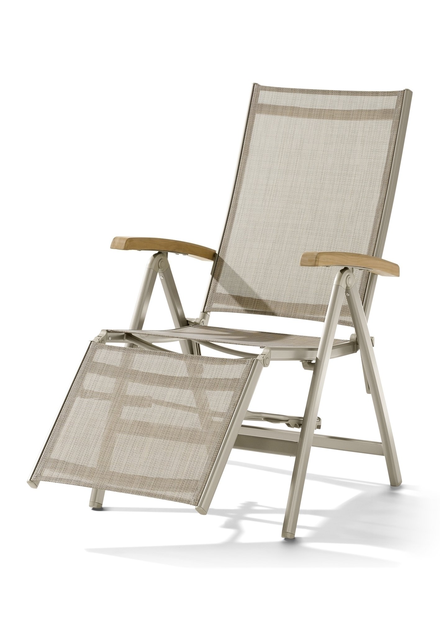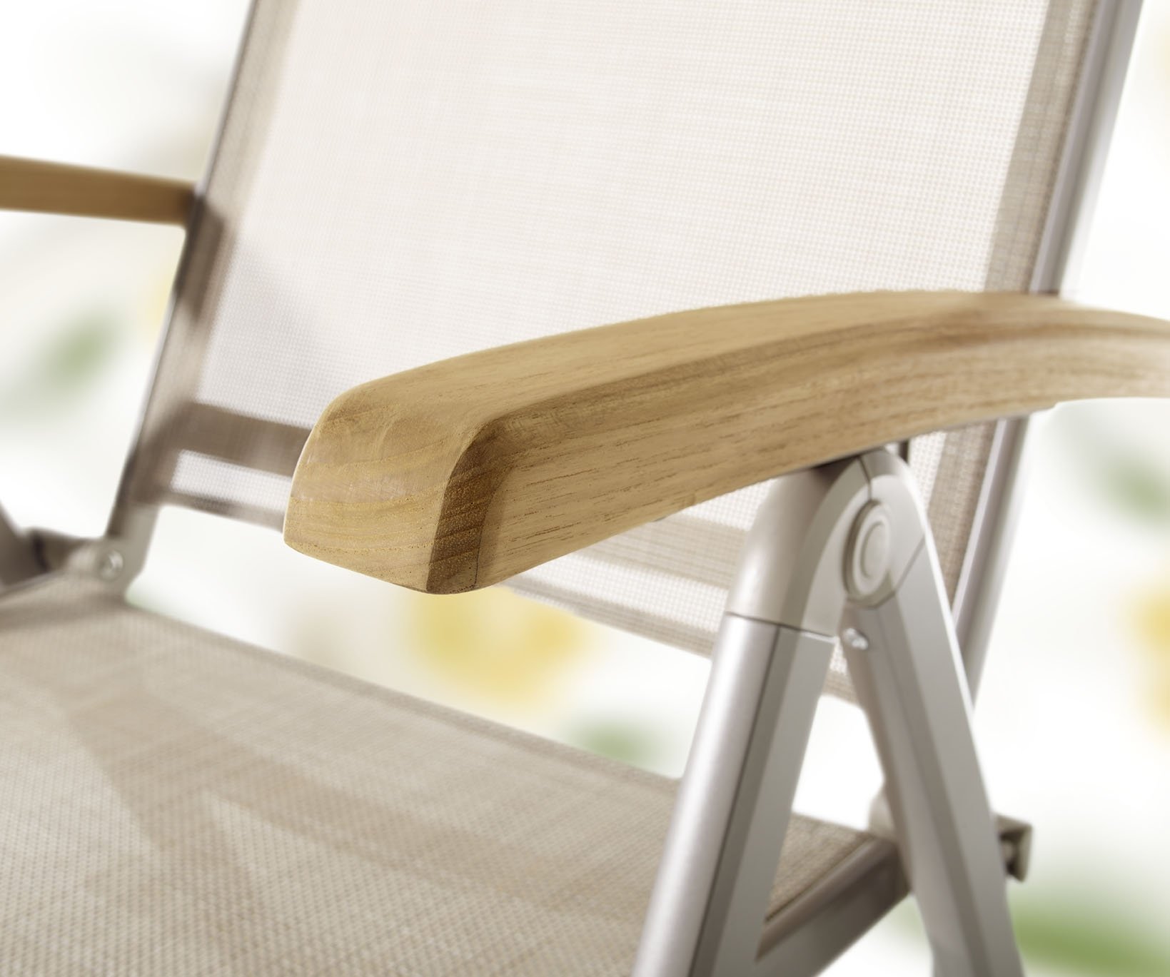 [BulletPoints] => Abmessungen: B 95 cm x T 62 cm x H 109 cm. Sitzhöhe 46 cm, Sitzbreite 50 cm. Klappbar und leicht zu verstauen.;Aluminiumgestell in Champagnerfarbe und Kunstfasergewebe-Bezug in eleganter Champagnerfarbe.;FSC-zertifizierte Teakholz-Armlehnen in natürlicher Farbe für eine ansprechende Optik.;Rückenlehne und Fußteil jeweils 6-fach unabhängig voneinander verstellbar für individuellen Komfort.;Einfache Montage durch 'Klicksystem'. Witterungsbeständig und UV-beständig für den Outdoor-Einsatz.