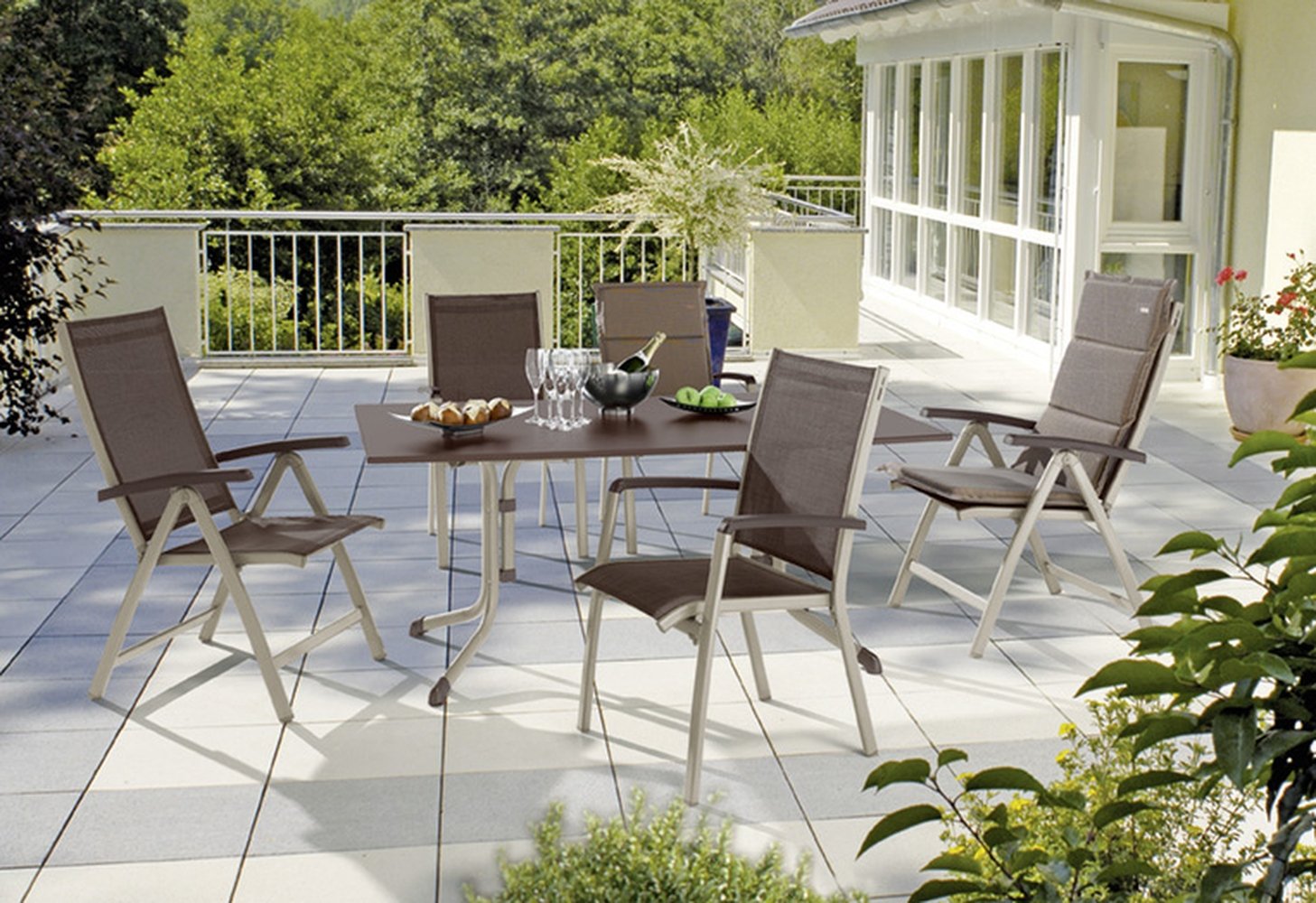 Das stabile Gestell aus Aluminium in Eisengrau bildet die Basis für Langlebigkeit und einen sicheren Stand. Sitz und Rückenlehne bestehen aus strapazierfähigem Textilux®-Kunstfasergewebe in Silbergrau, das sich angenehm anfühlt und für den regelmäßigen Einsatz im Freien ausgelegt ist. Die Armlehnen aus Aluminium in Eisengrau/Mocca mit Vollkunststoff-Strukturoberfläche bieten zusätzlichen Komfort beim Zurücklehnen.