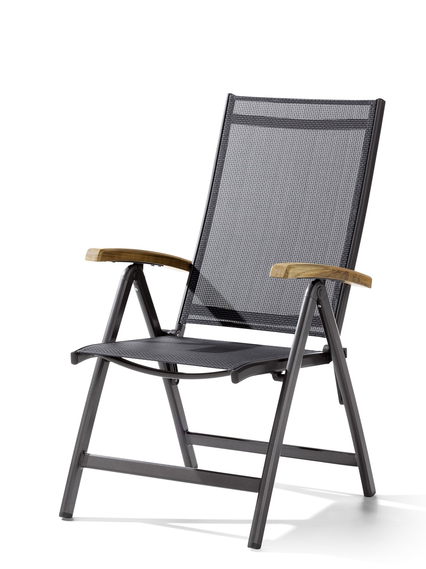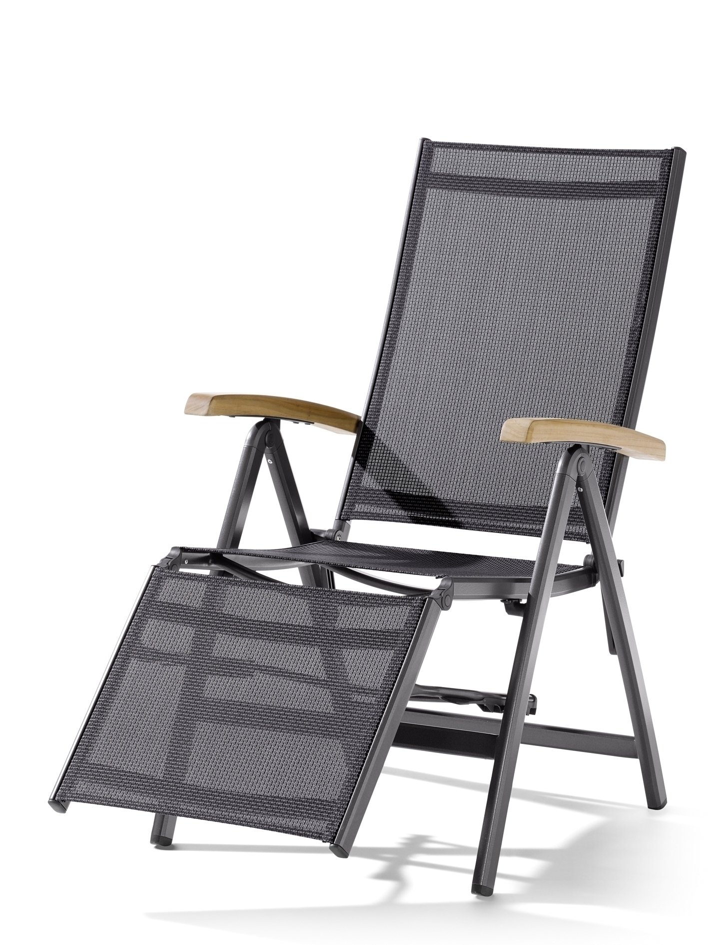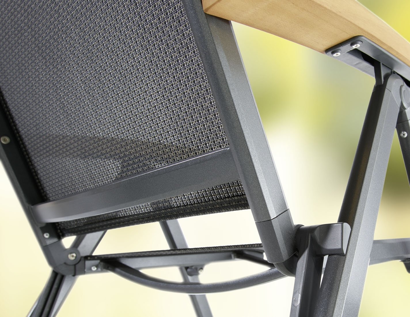 Aluminiumgestell, Textilux®-Kunstfasergewebe und FSC-Teakholz-Armlehnen sorgen für Witterungsbeständigkeit und Langlebigkeit im Außenbereich.
