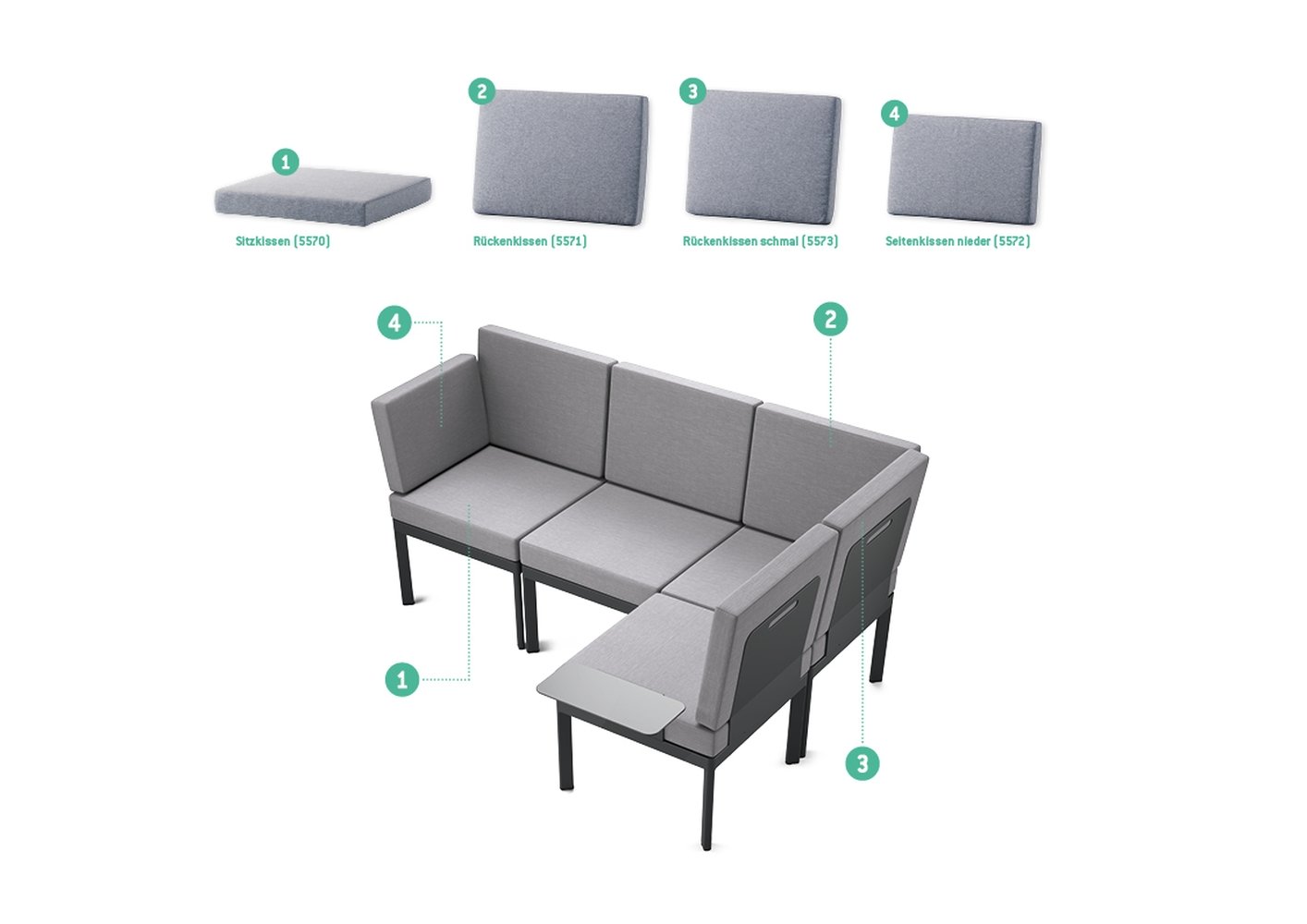 ✔Mit Rücken- bzw. Seitenelement und Verbindungselement lassen sich individuelle Lounge-Kombinationen erstellen.