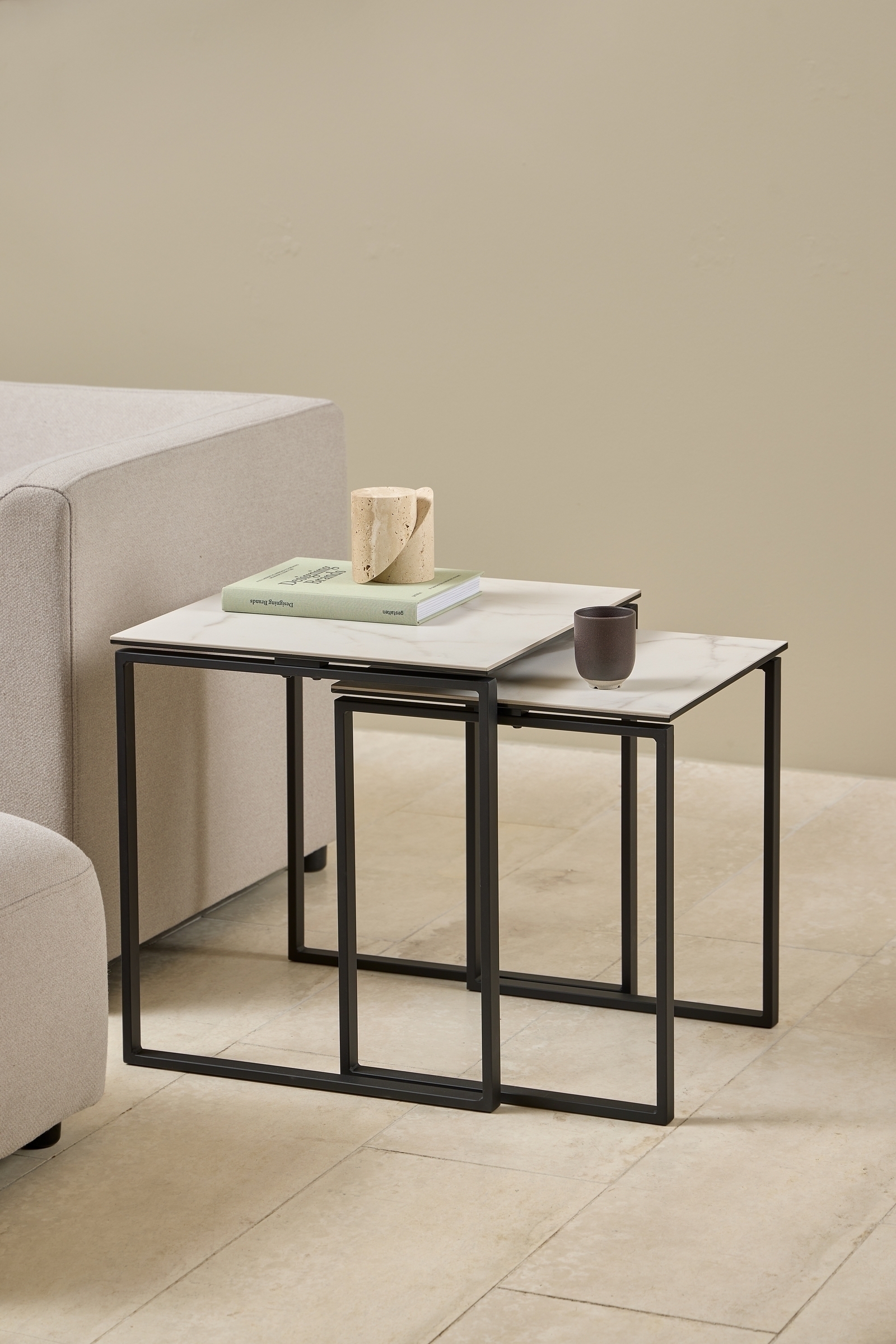 [BulletPoints] => Der Katrine Satztisch hat Maße von 50x50x55 cm, 43x43x50 cm und 36x36x45 cm und bietet vielseitige Einsatzmöglichkeiten mit einer maximalen Belastbarkeit von 20 kg pro Tisch.;Hochwertige Glas-Keramik-Tischplatten in Fairbanks schwarz mit rauer Oberfläche sorgen für Langlebigkeit und Stil, ideal für moderne und klassische Einrichtungsstile.;Das Gestell aus matt-schwarz pulverbeschichtetem Stahl mit Kufenfüßen garantiert Stabilität und ein elegantes Design, das sich nahtlos in jede Wohnumgebung einfügt.;Pflegeleichte Tischplatten und Gestell: Ein gut ausgewrungenes Tuch mit milder Seifenlauge reicht aus, um sowohl die Glas-Keramik- als auch die Stahloberflächen zu reinigen.;Der Katrine Satztisch wird zerlegt geliefert, ist jedoch einfach zu montieren. Perfekt für alle, die ein stilvolles und funktionales Möbelstück suchen.