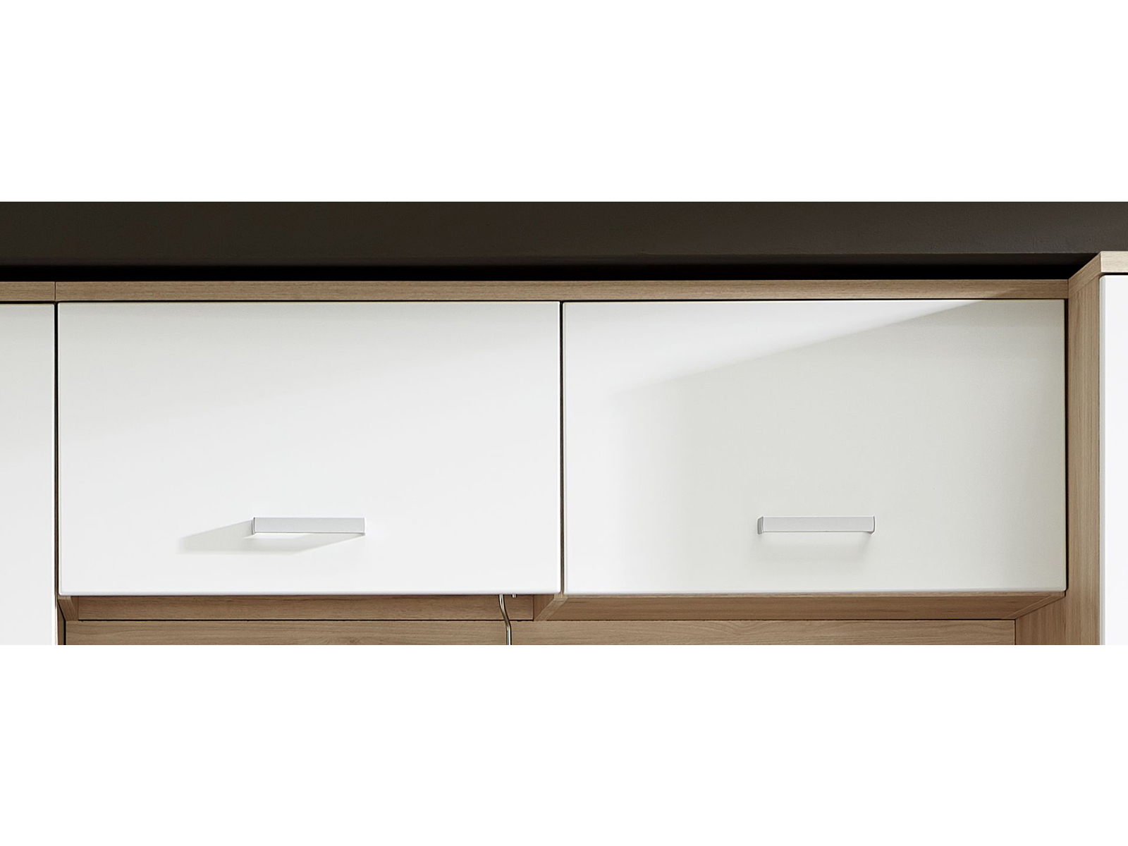 Der Korpus in Jackson Eiche Nachbildung und die Front in Lack Laminat weiß supermatt bilden einen attraktiven Kontrast, der für eine moderne, zugleich wohnliche Ausstrahlung sorgt. Die realistische Holznachbildung mit täuschend echter Maserung fügt sich harmonisch in unterschiedlichste Einrichtungsstile ein.