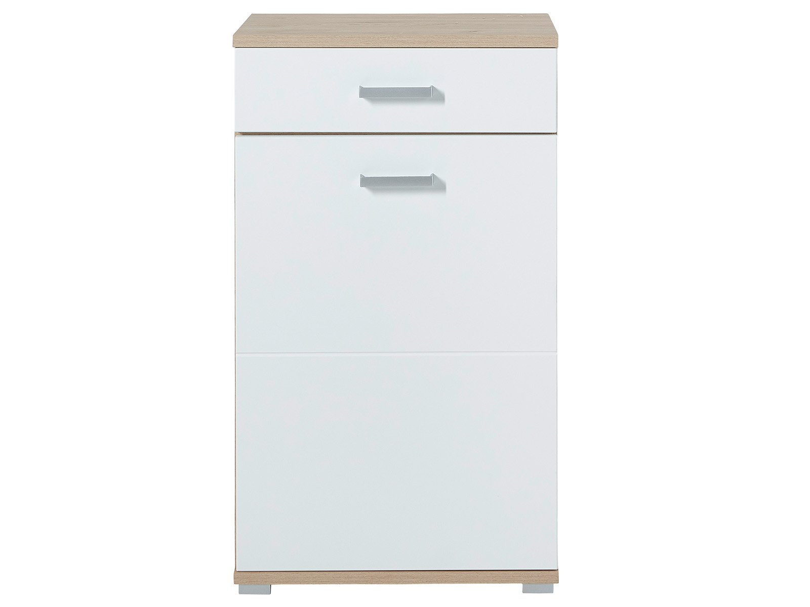 [metaDescription] => Moderner Schuhschrank, Korpus aus Spanplatte in Jackson Eiche Nachbildung, Front aus MDF Perfect Touch in Lack Laminat weiß supermatt mit 1 Holztür, 1 Schub