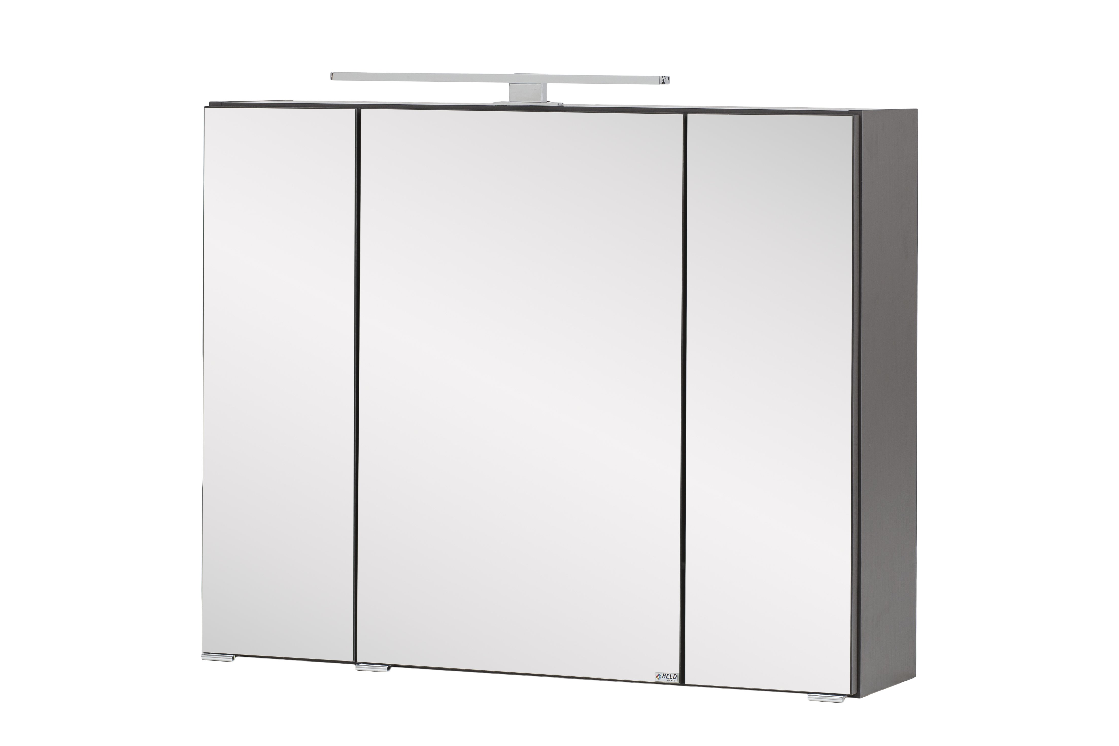 [BulletPoints] => Modernes Waschtisch-Set; Korpus aus melaminharzbeschichteter Spanplatte in Grafitgrau, Front aus MDF in Wotaneiche; 1 Waschtisch mit 2 Metall-Vollauszügen, 1 Spiegelschrank mit 3 Spiegeltüren und 6 Glaseinlegeböden, 1 Hängeschrank mit 1 Tür und 2 Einlegeböden; 1 Unterschrank mit 1 Tür, 1 Schubkasten und 1 Einlegeboden sowie 1 Midischrank mit 2 Türen und 3 Einlegeböden; Waschbecken in Grau; Individuelles Stellmaß