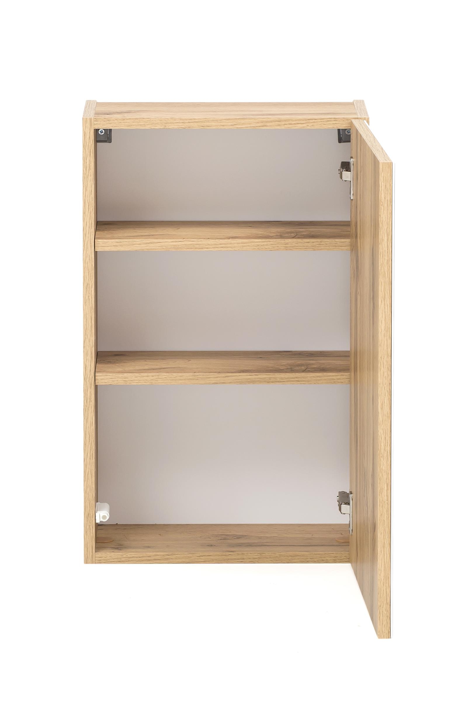 Im Inneren sorgen zwei Einlegeböden für eine praktische Unterteilung, sodass Badutensilien, Accessoires oder andere Kleinteile übersichtlich verstaut werden können. Dank Wandmontage wirkt der Schrank leicht und schwebend, was insbesondere in kleineren Räumen von Vorteil ist.