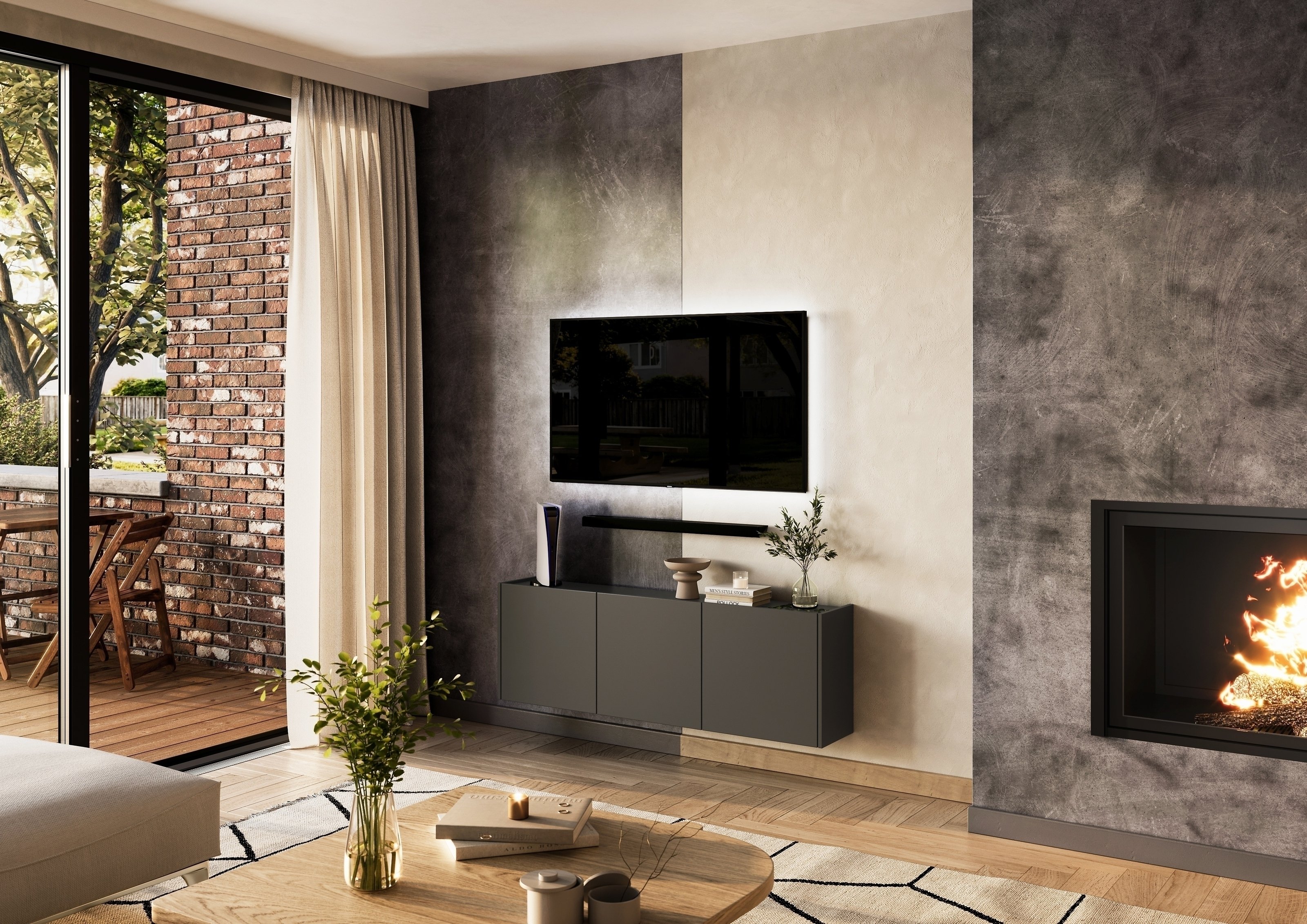 Die grifflosen Fronten in Graphit mit Balkonoptik fügen sich harmonisch in zeitgemäße Wohnkonzepte ein.