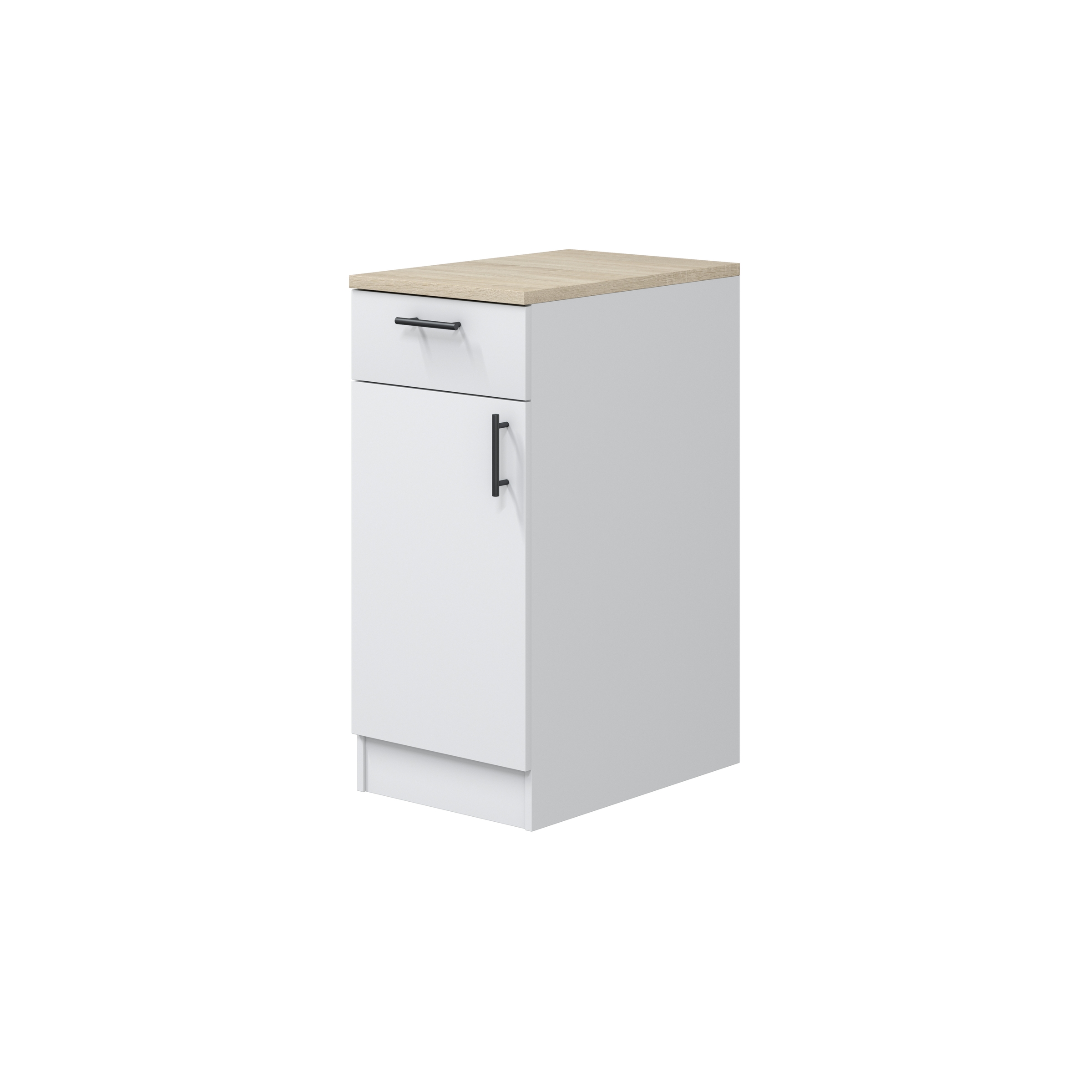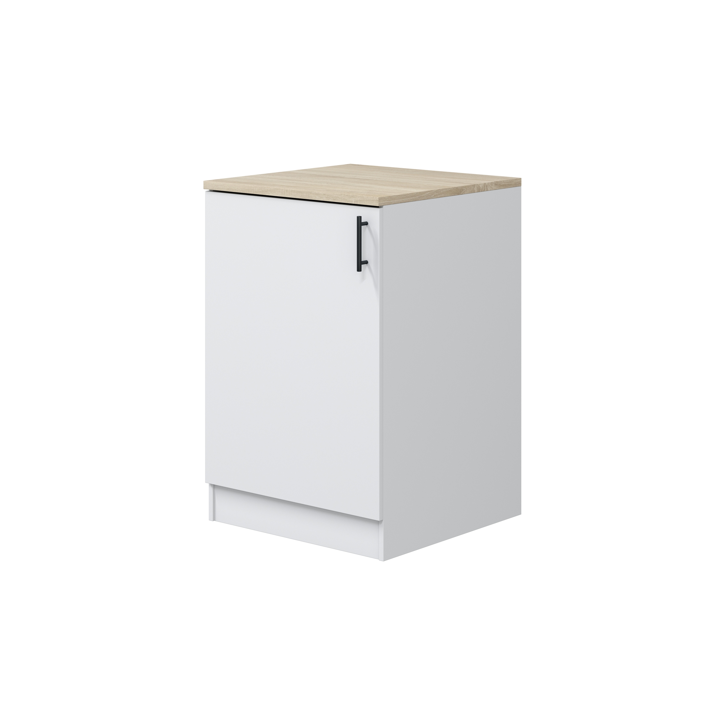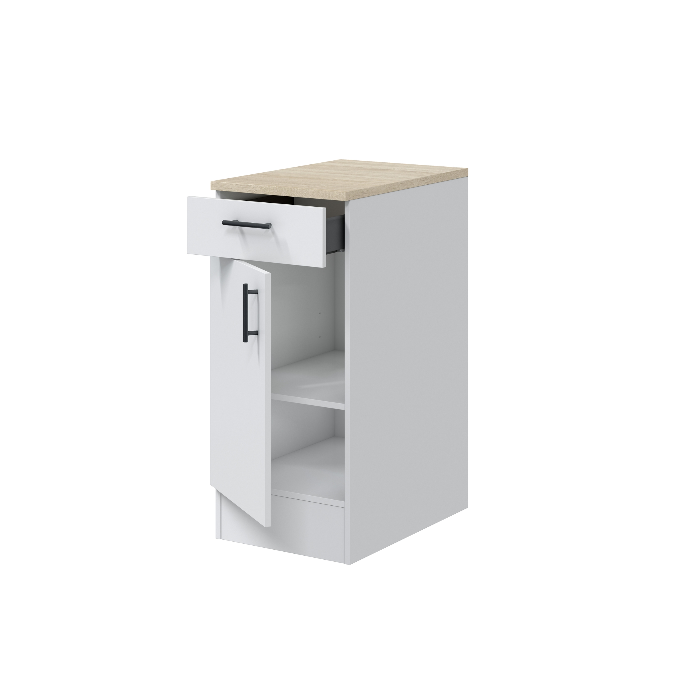 Korpus und Arbeitsplatte bestehen aus melaminbeschichtetem Holzwerkstoff, der durch seine pflegeleichte Oberfläche und die 0,6 mm starken Melaminkanten überzeugt. In Weiß glänzend/Mattweiß wirkt der Schrank dezent und modern, während die Kombination mit der warmen Canadian Eiche-Arbeitsplatte für einen wohnlichen Akzent sorgt. Die maximale Belastbarkeit des Schranks beträgt 30 kg, womit er für den typischen Einsatz im Küchenbereich ausgelegt ist.