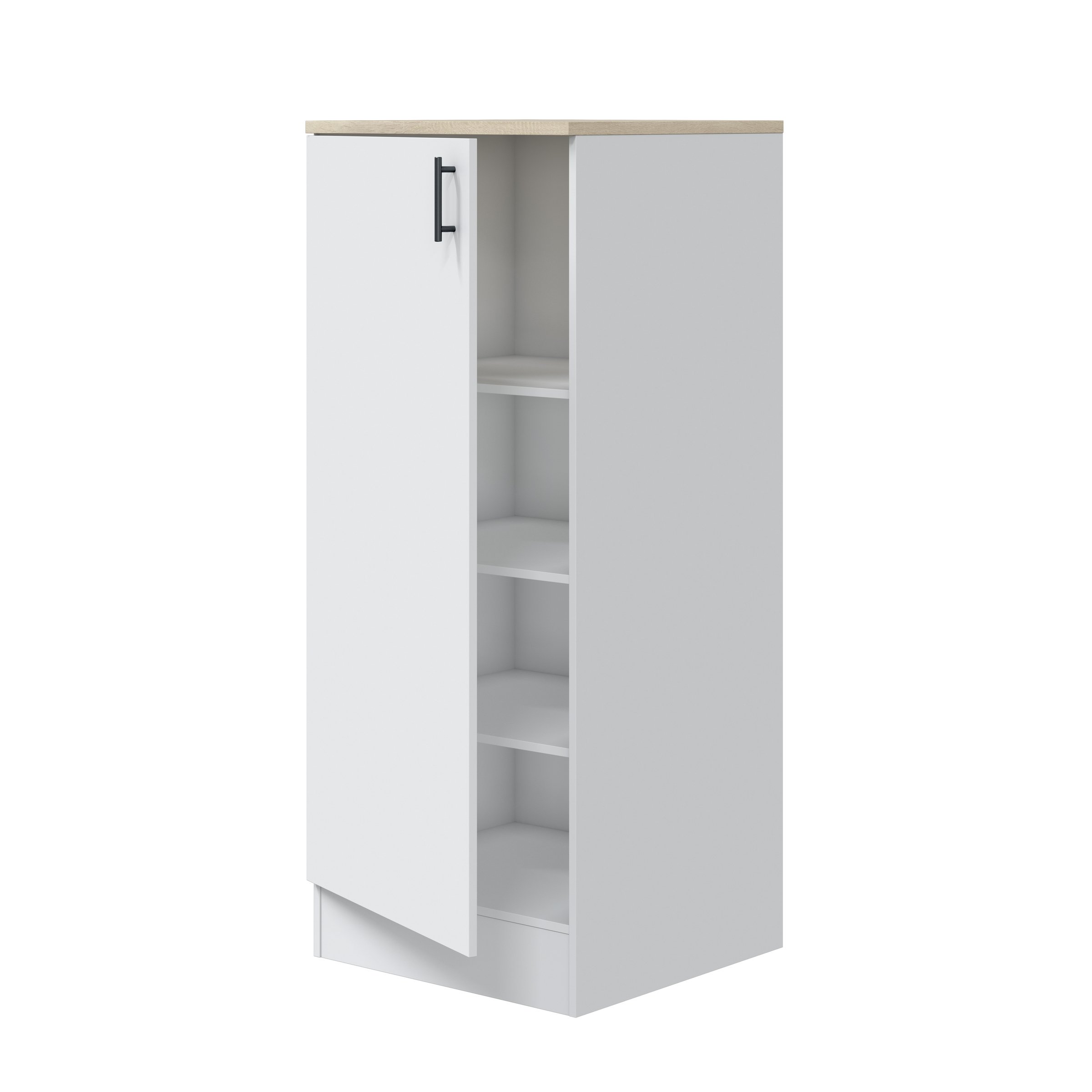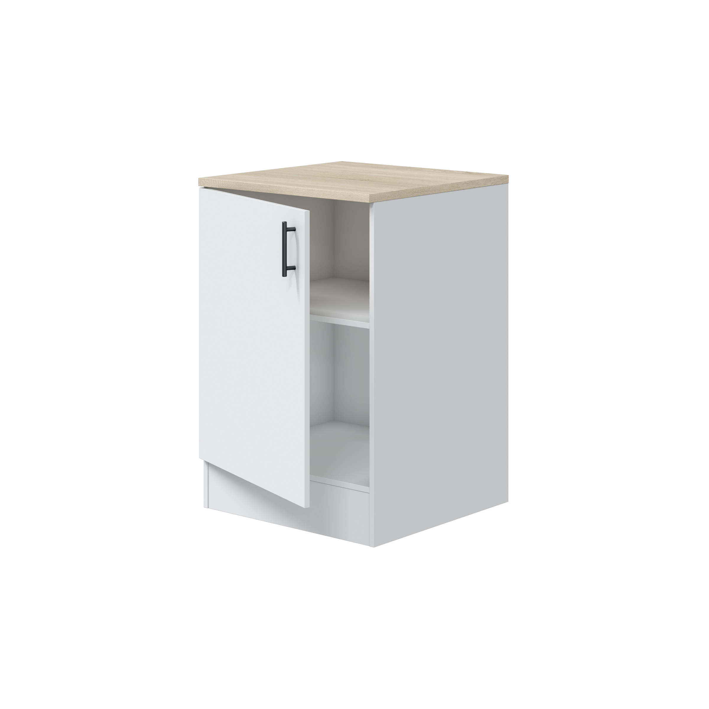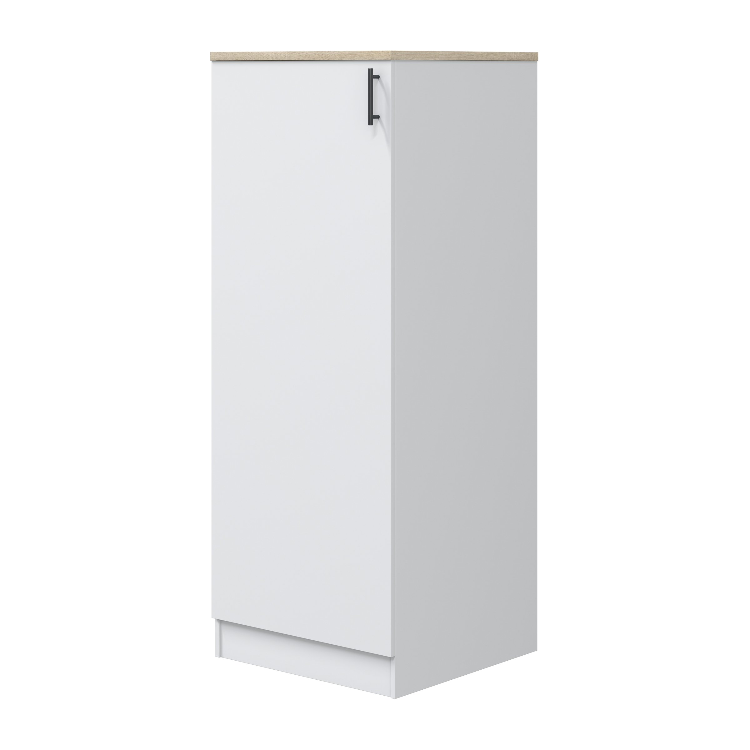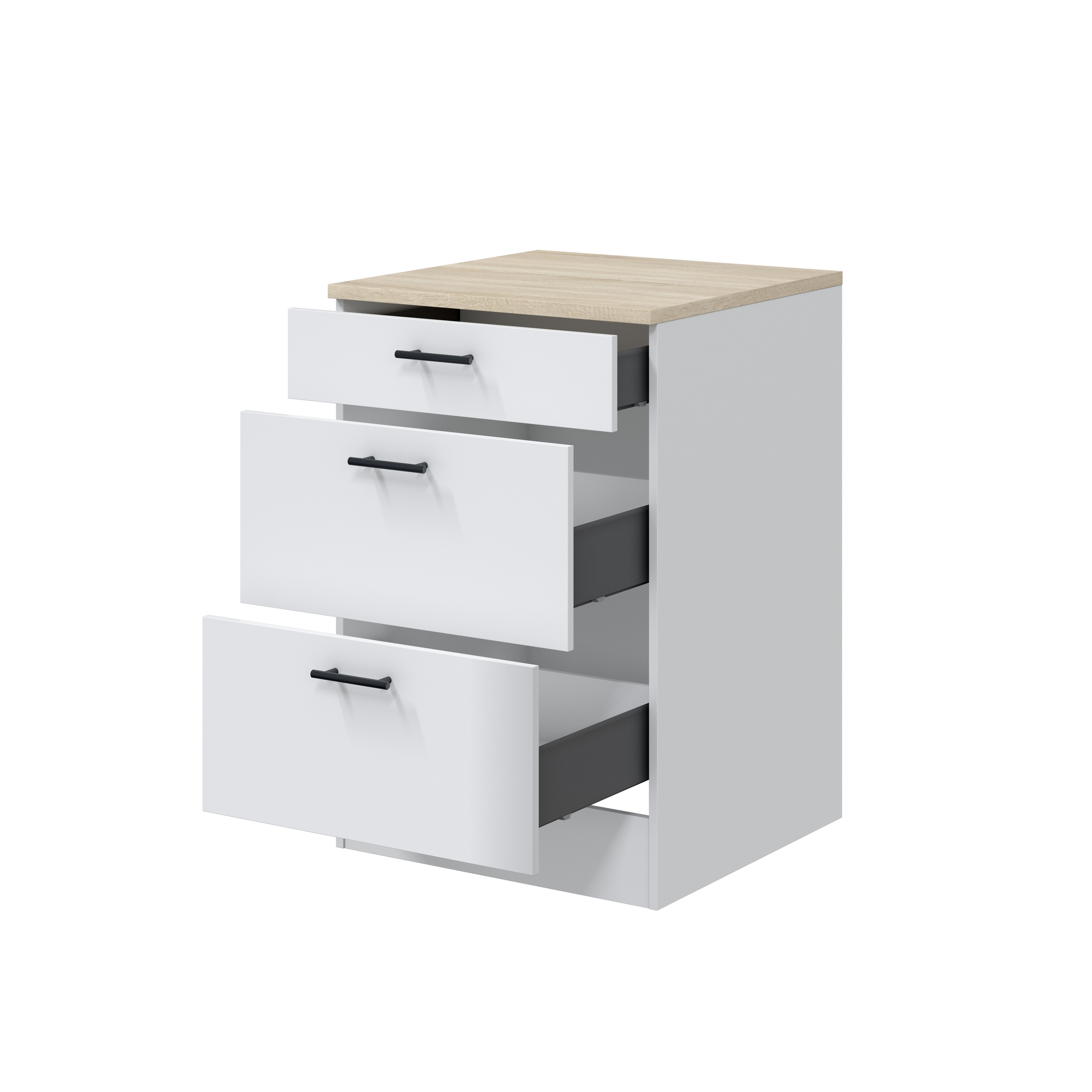 Korpus und Arbeitsplatte bestehen aus melaminbeschichtetem Holzwerkstoff, der durch seine pflegeleichte Oberfläche und die 0,6 mm starken Melaminkanten überzeugt. In Weiß glänzend/Mattweiß wirkt der Schrank dezent und modern, während die Kombination mit der warmen Canadian Eiche-Arbeitsplatte für einen wohnlichen Akzent sorgt. Die maximale Belastbarkeit des Schranks beträgt 30 kg, womit er für den typischen Einsatz im Küchenbereich ausgelegt ist.
