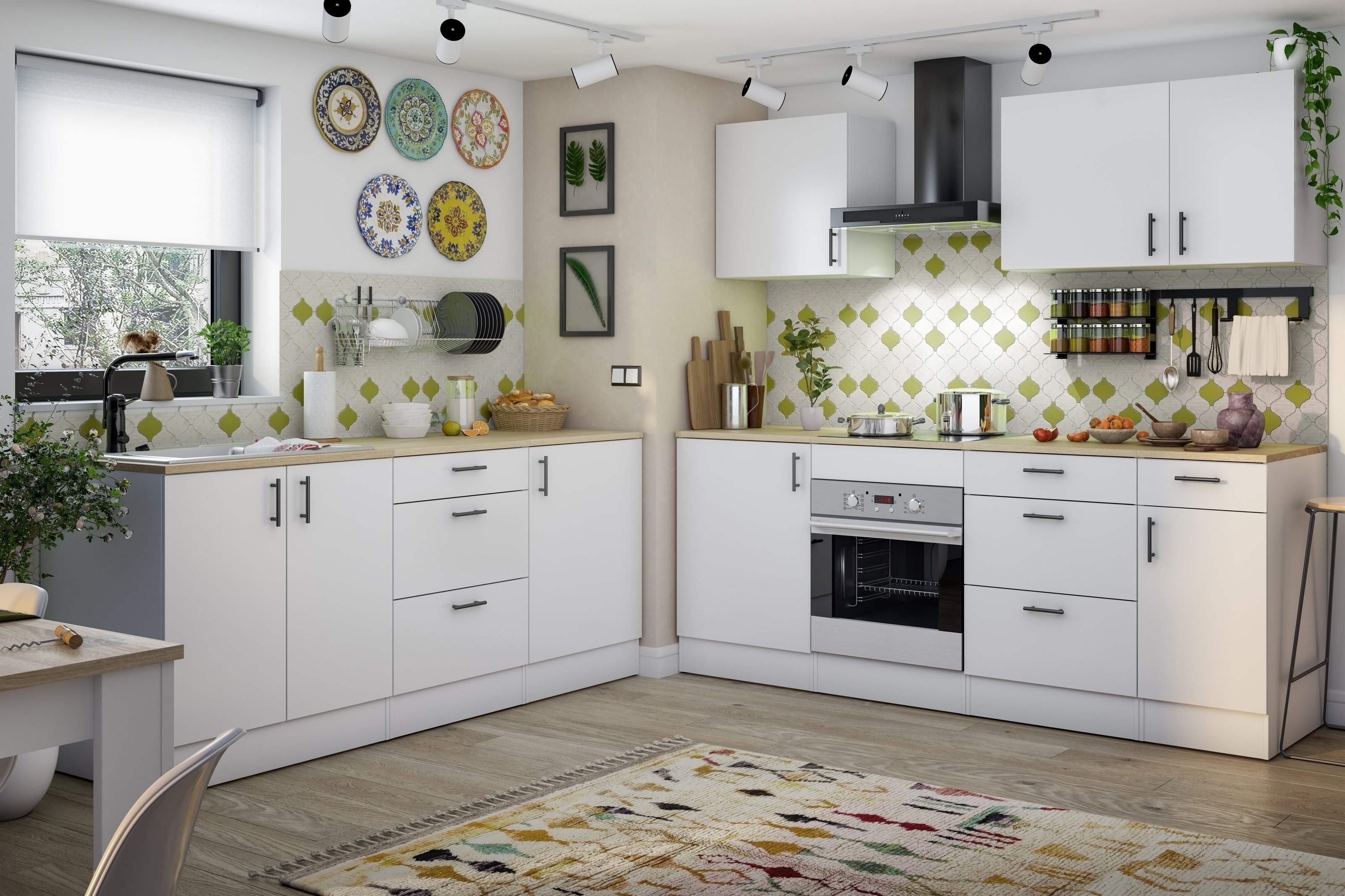 Der in Spanien gefertigte Korpus aus 15 mm starkem, melaminbeschichtetem Holzwerkstoff in Weiß glänzend/Mattweiß wirkt modern und zeitlos, während die pflegeleichte Oberfläche und das 0,6 mm starke Melamin-Kantenprofil für Langlebigkeit im Küchenalltag sorgen.