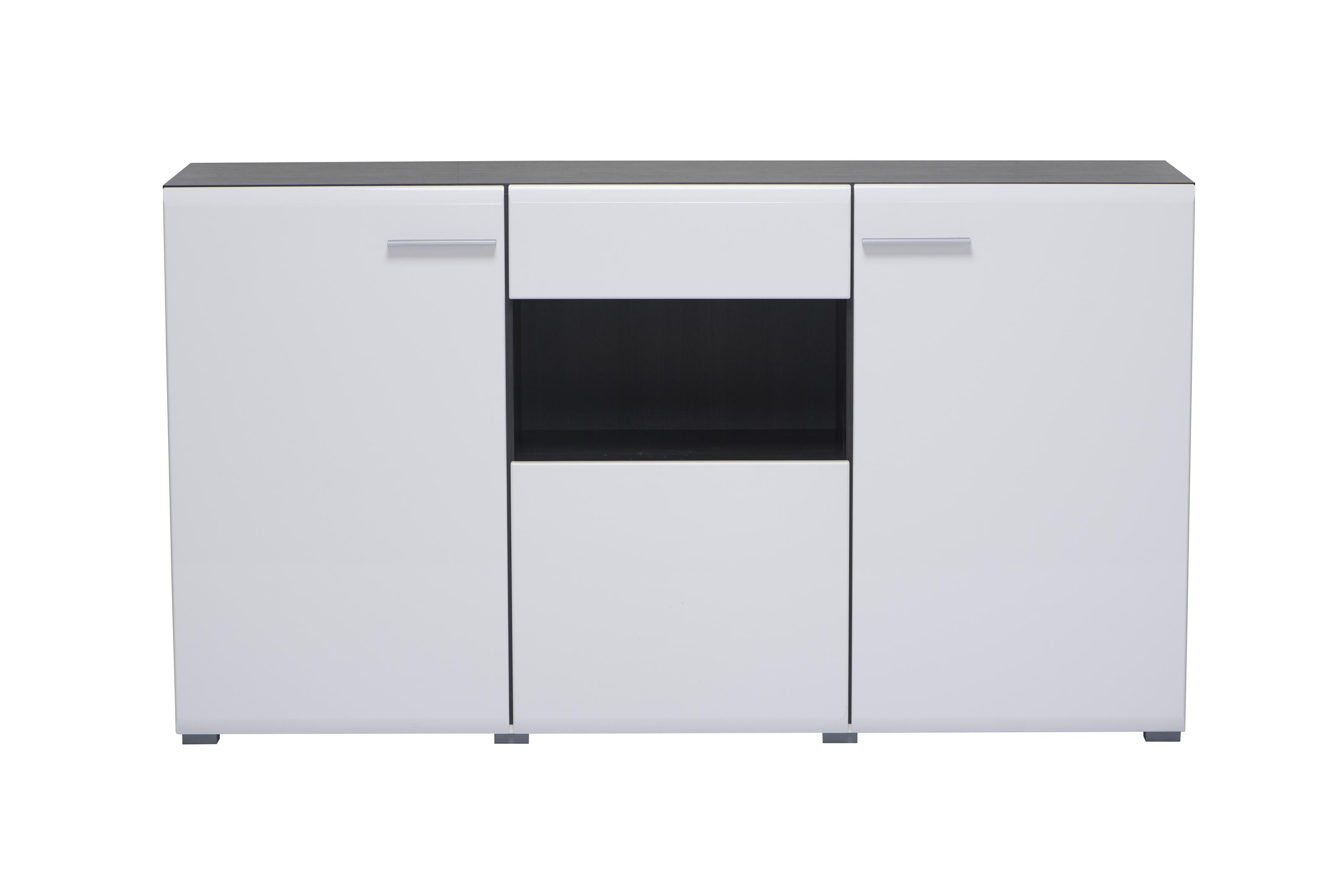 [metaDescription] => Modernes Highboard, Front aus MDF in Weiß-Hochglanz, Korpus aus melaminbeschichteter Spanplatte in Opaque White, Absetzungen in Schwarz mit 3 Holztüren, 1 S