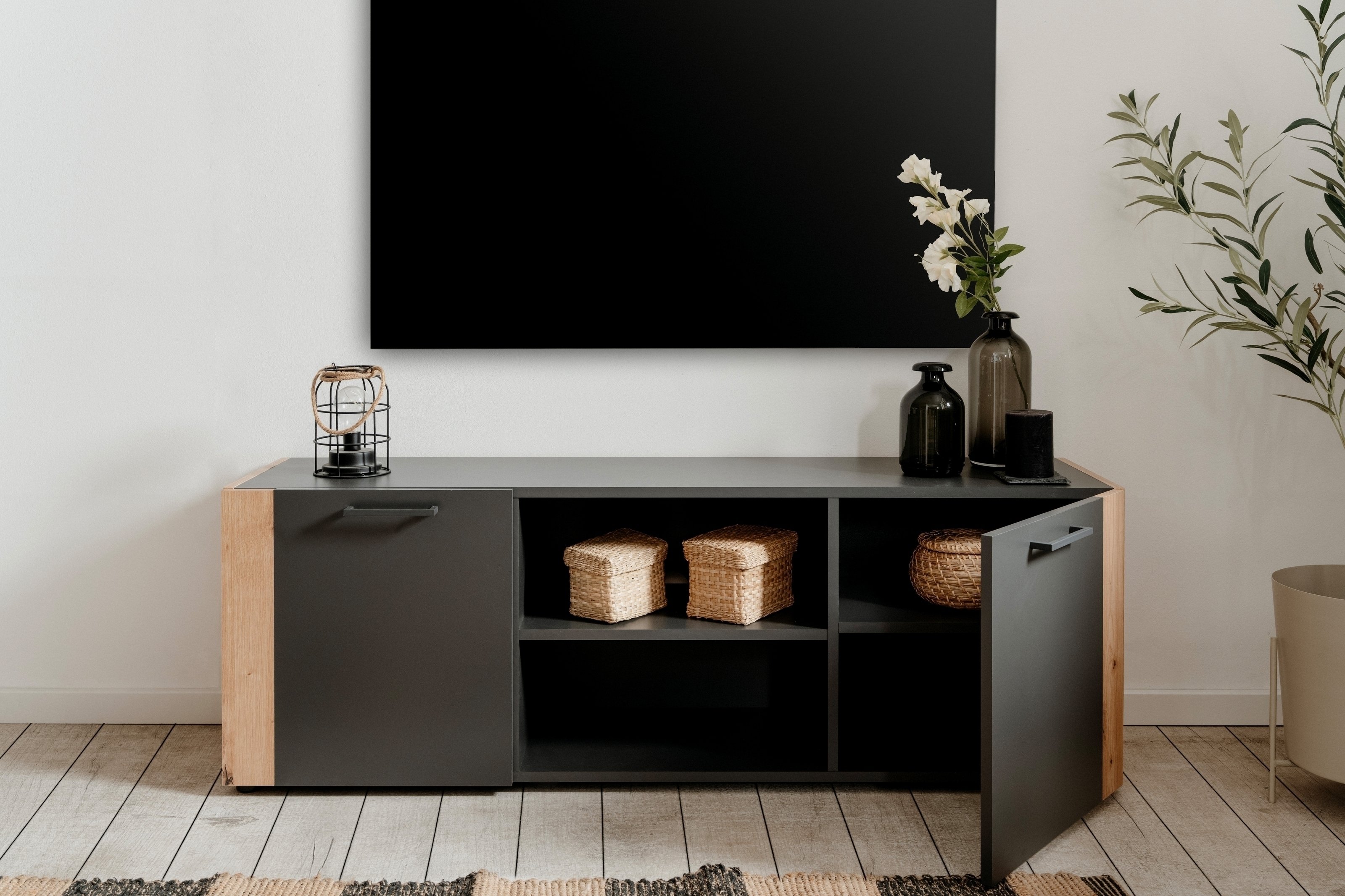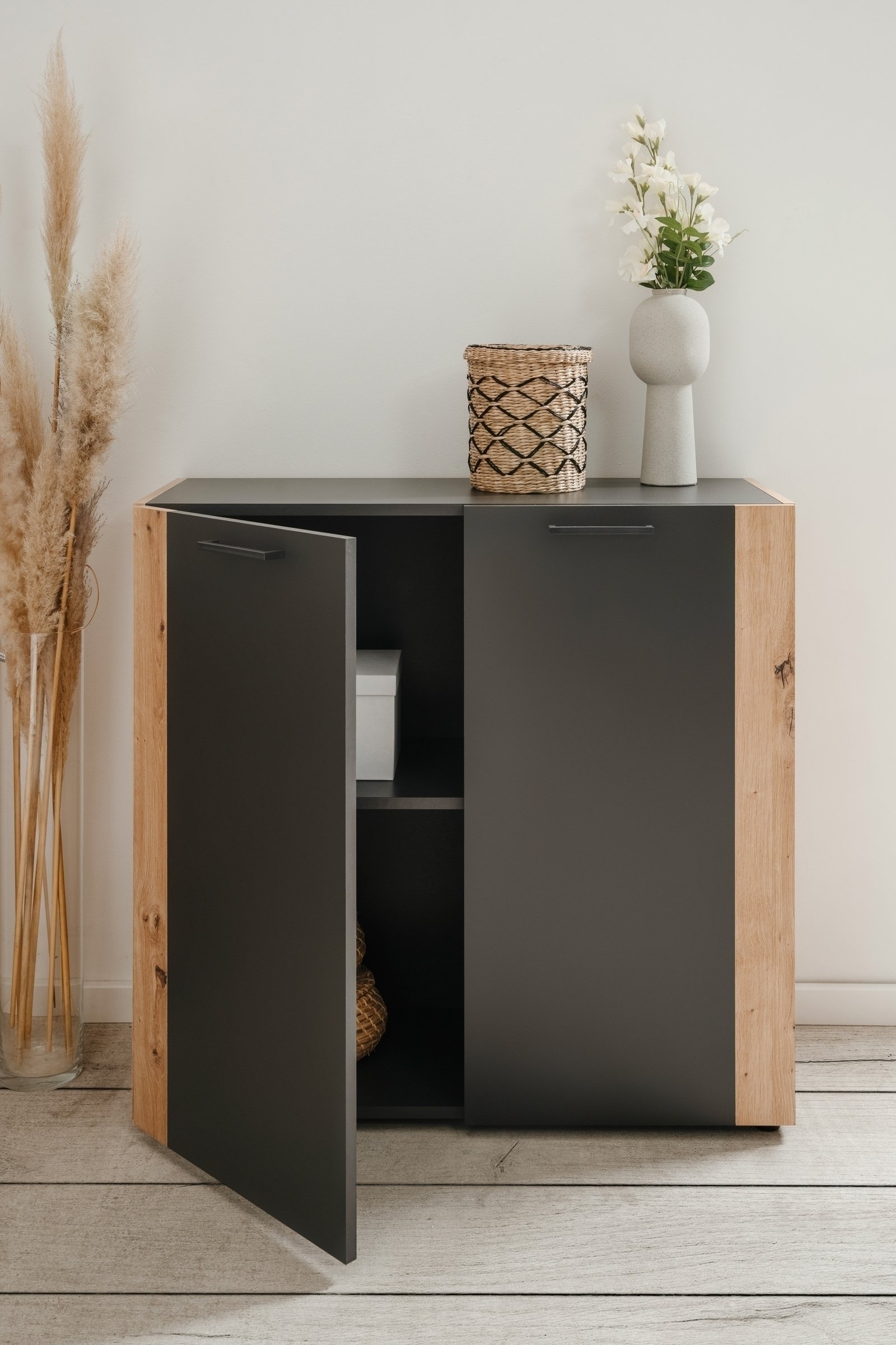Die Kombination aus anthrazitfarbenen Türen mit dem warmen Artisan Oak-Dekor schafft eine harmonische Optik, die sich in moderne wie klassische Einrichtungsstile einfügt. Ob Geschirr, Bücher oder Dekoration – das Highboard bietet mit 4 Einlegeböden, 2 offenen Fächern und einer Schublade ausreichend Platz für alle Alltagsgegenstände.