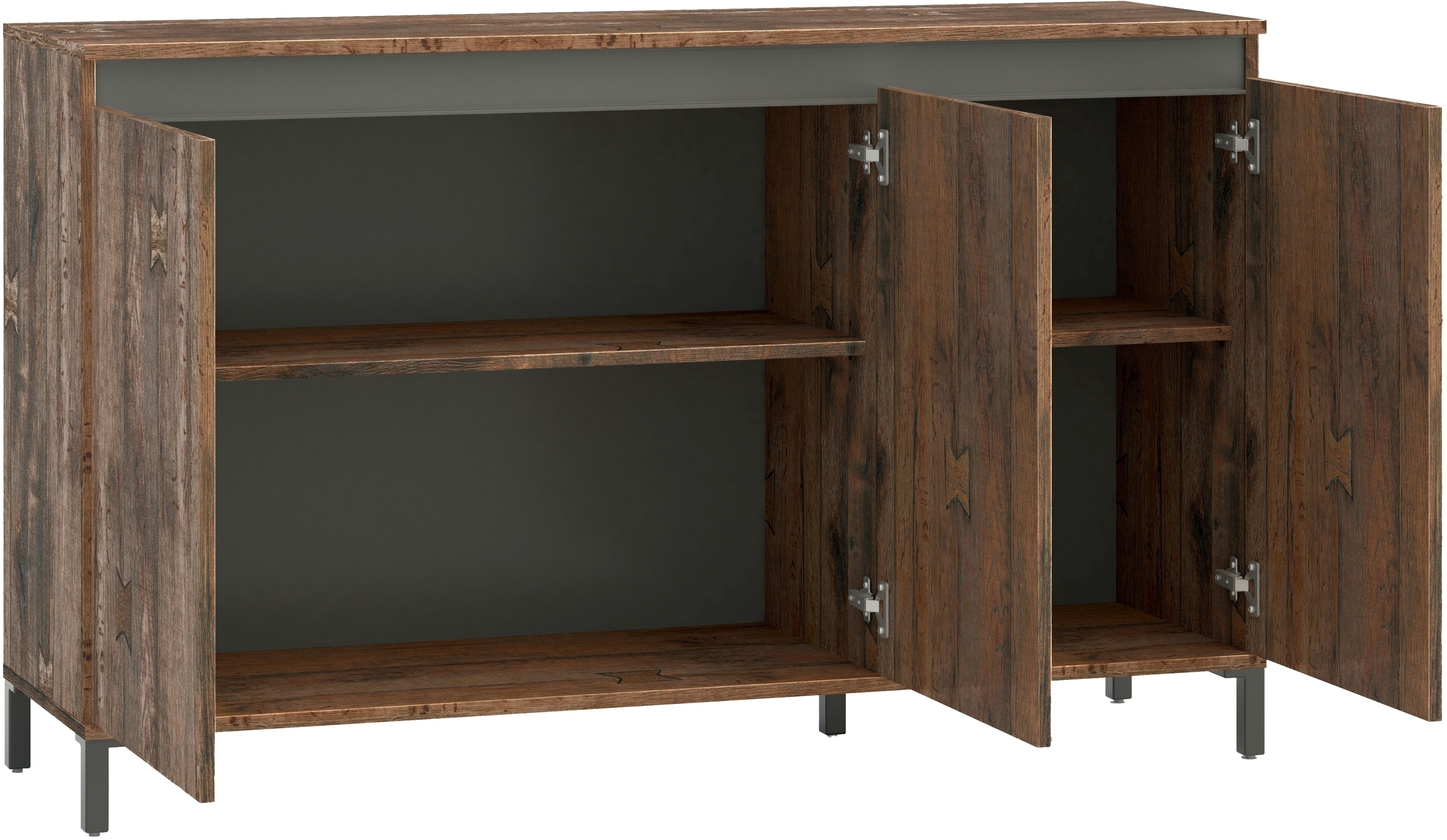 Hinter den 3 Scharniertüren verbergen sich 4 lose Einlegeböden, die Sie flexibel anordnen können, sodass Sie Ihr Highboard individuell an Ihre Aufbewahrungsbedürfnisse anpassen. Die anthrazitfarbenen Vierkantfüße setzen einen reizvollen Kontrast zum braunen Korpus in Eiche und unterstreichen den angesagten Industrial-Look.