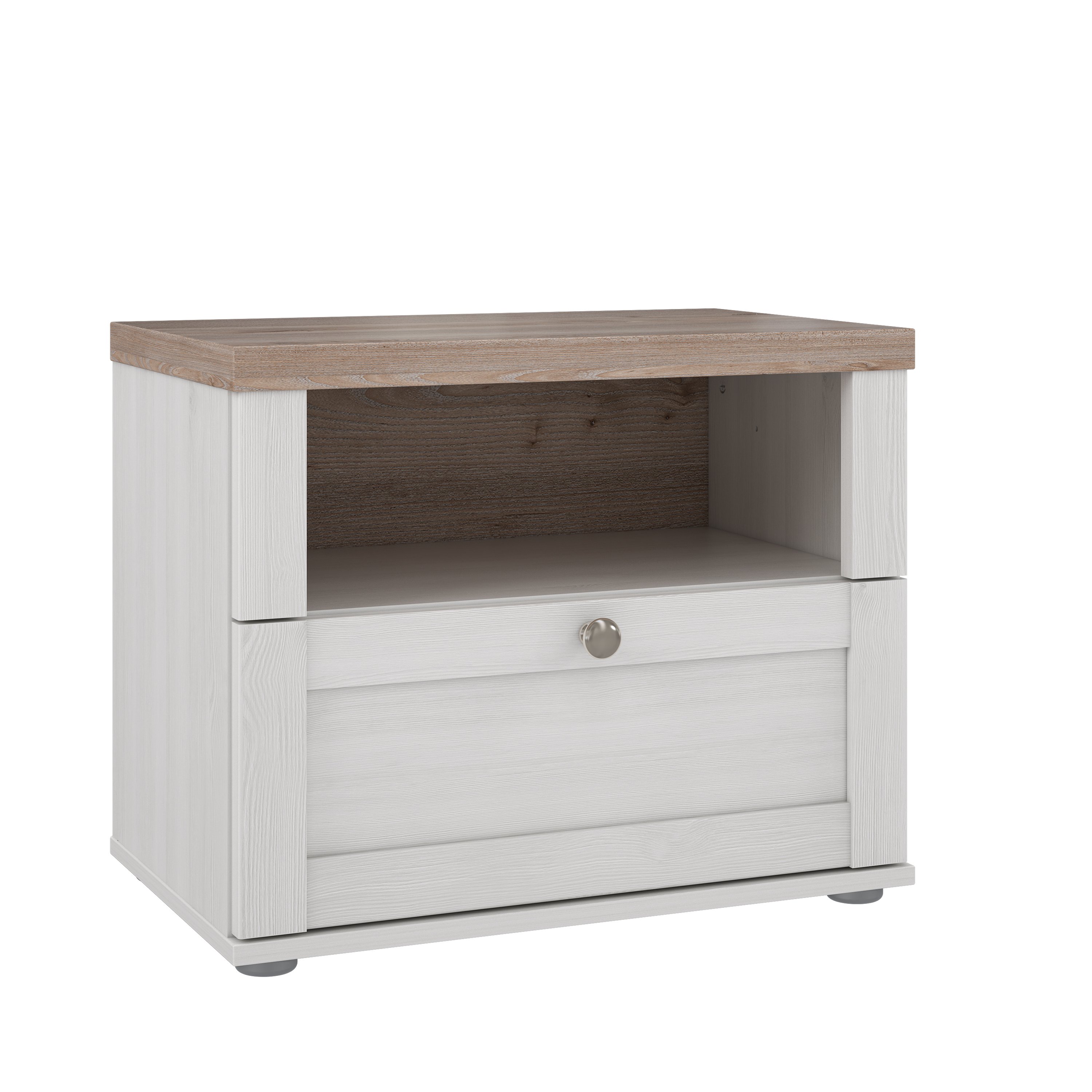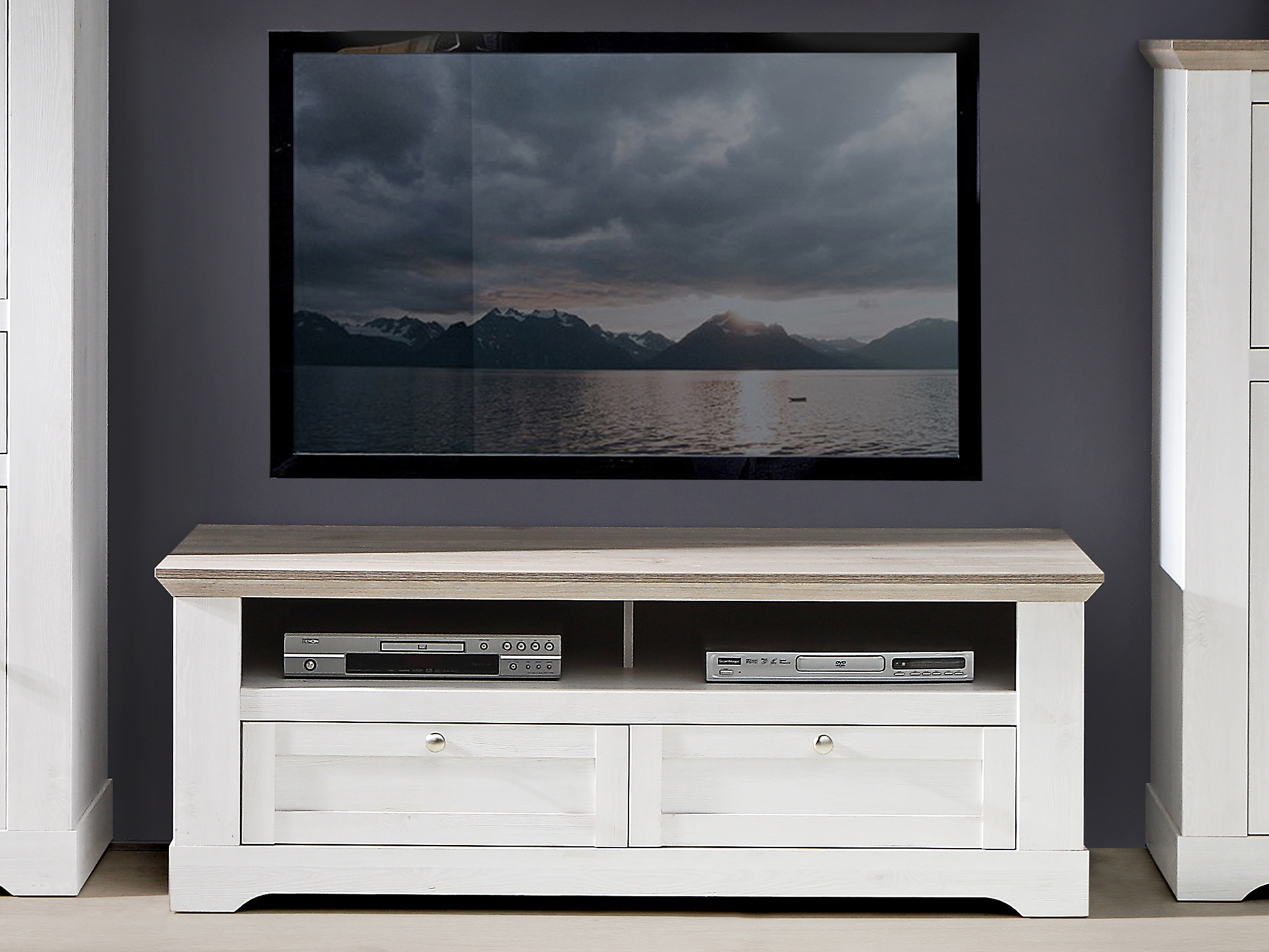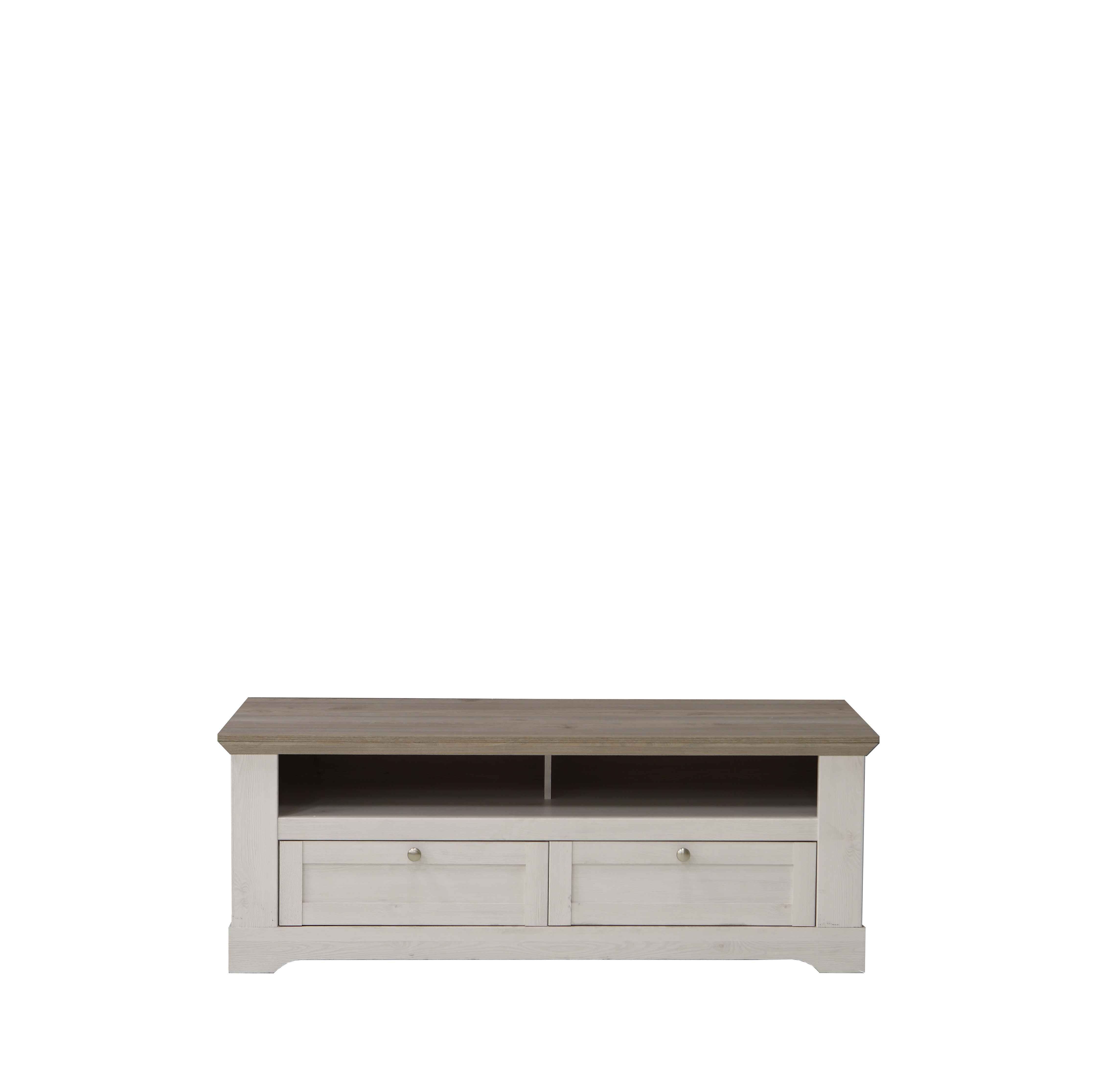 Die Fronten und der Korpus aus Spanplatte in Schneeeiche-Nachbildung werden durch den Oberboden in Nelson Eiche-Nachbildung wirkungsvoll ergänzt. So entsteht ein harmonischer Farbkontrast, der sich besonders gut mit hellen wie dunklen Möbeln kombinieren lässt. Der Landhaus-Wohnstil wird durch die ruhige Maserung der Nachbildung und die wertigen Metallgriffe in nickel gebürstet stimmig unterstrichen.