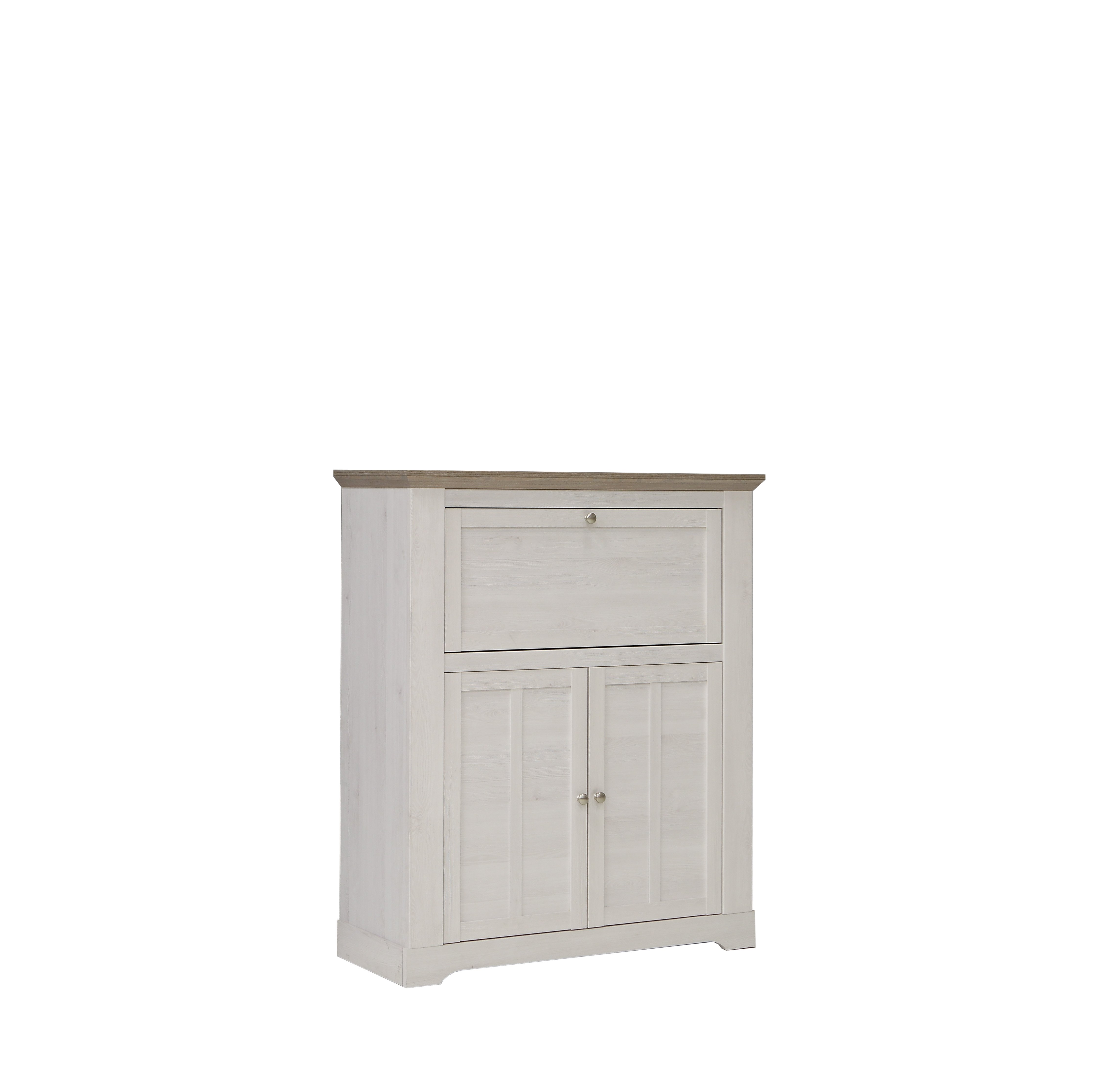 Zwei höhenverstellbare Einlegeböden, zwei Holztüren und eine Klappe erlauben eine anpassbare Organisation Ihres Stauraums.