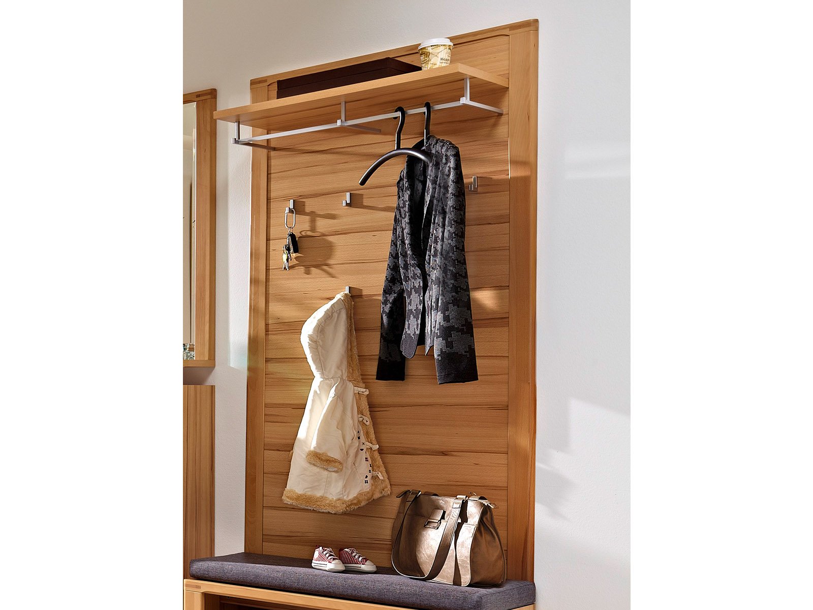 [metaDescription] => Modernes Garderobenpaneel aus Kernbuche Massiv lackiert, Korpus aus Spanplatte in Kernbuche Nachbildung mit 1 Ablage , 1 Kleiderstange und 6 Kleiderhaken Br