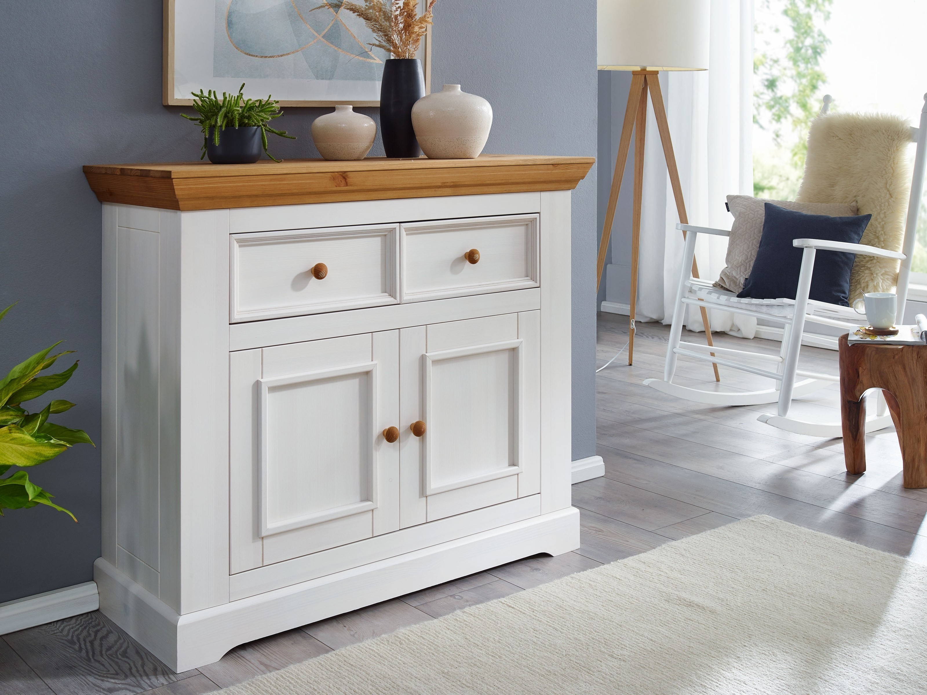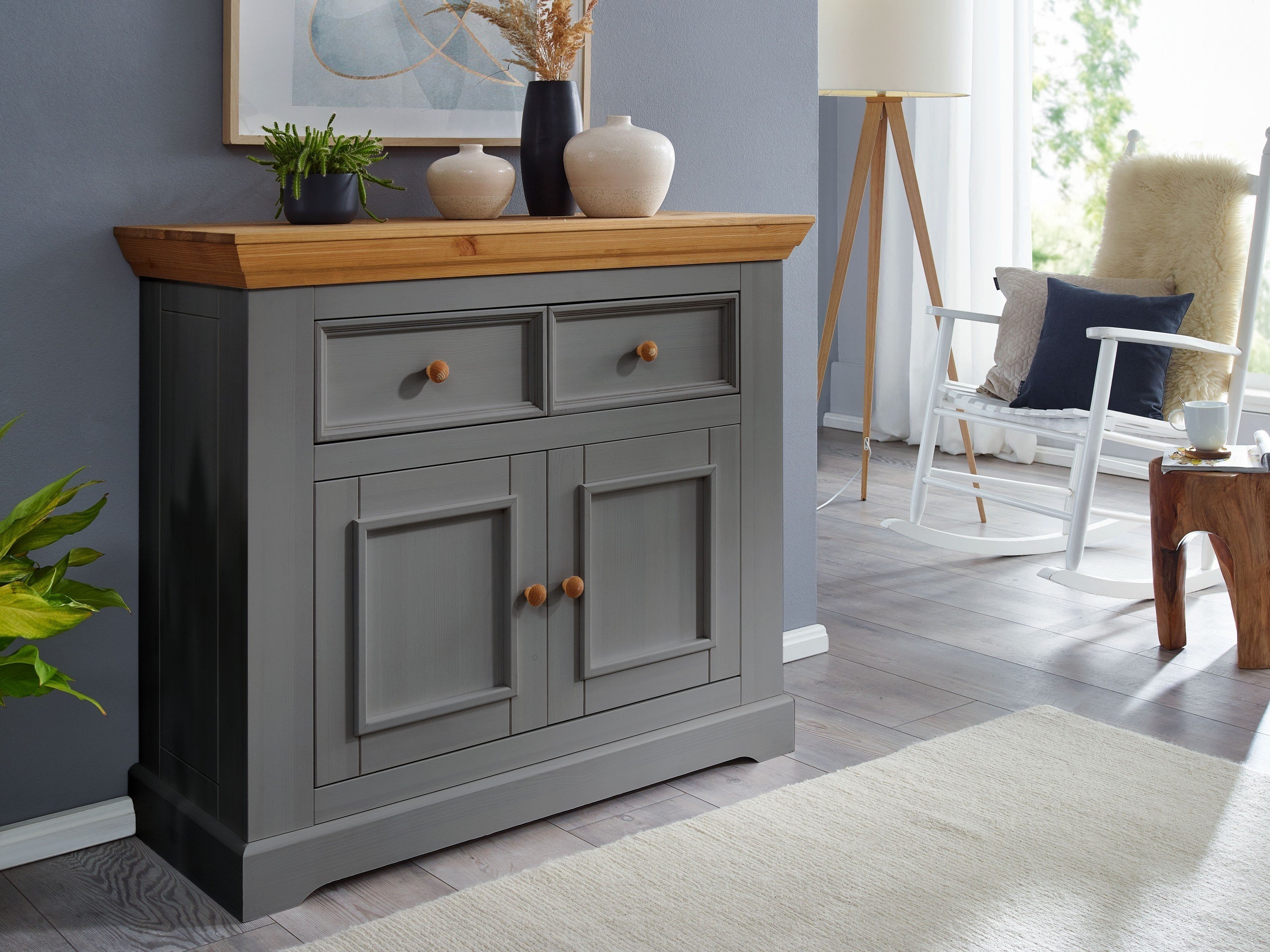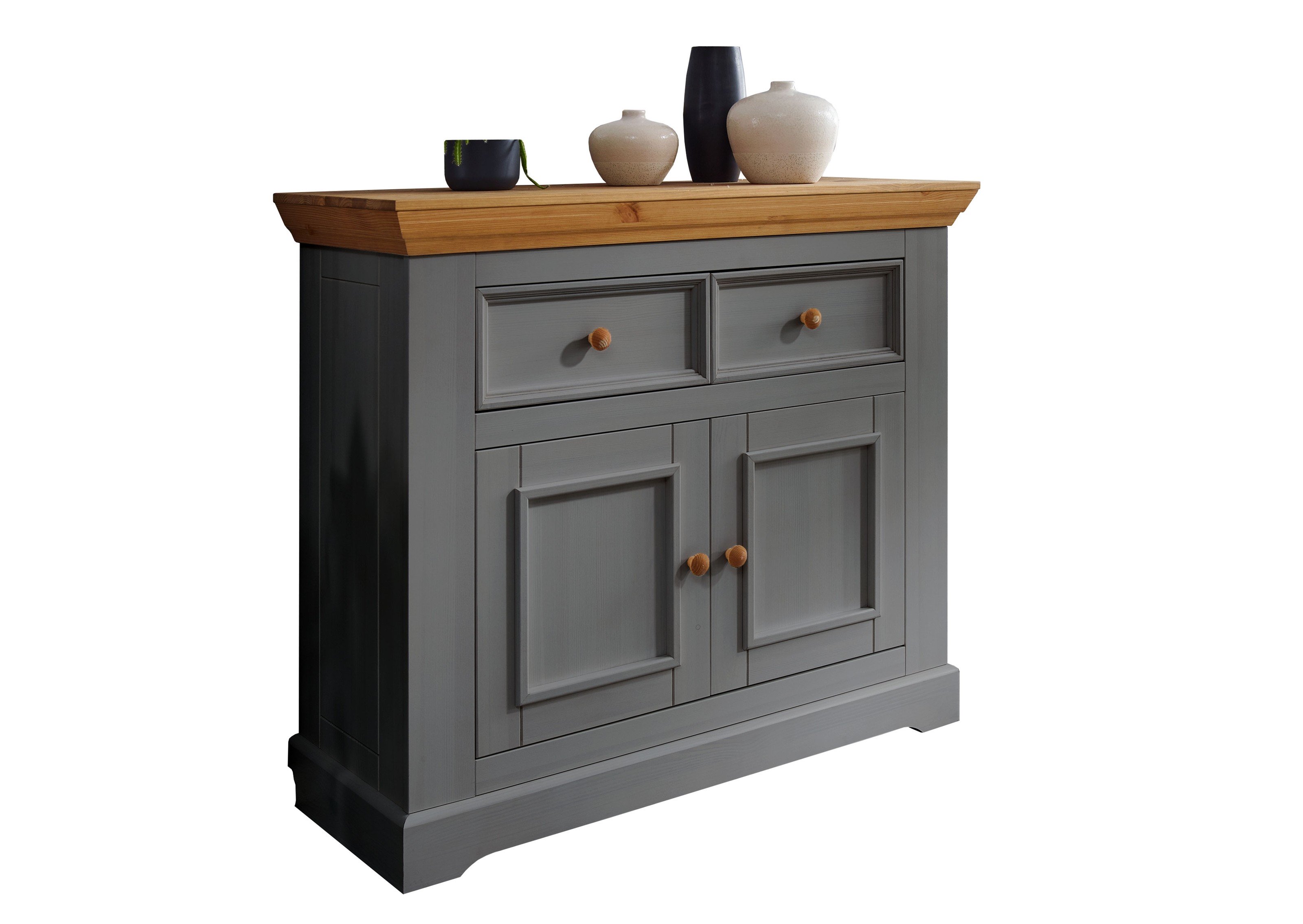 [metaDescription] => Anrichte im Landhaus Stil in Kiefer massiv grau gewachst, Deckelplatte in eichefarbig abgesetzt Anrichte mit 2 Holztüren und 2 Schubladen Maße ~Breite 108,5