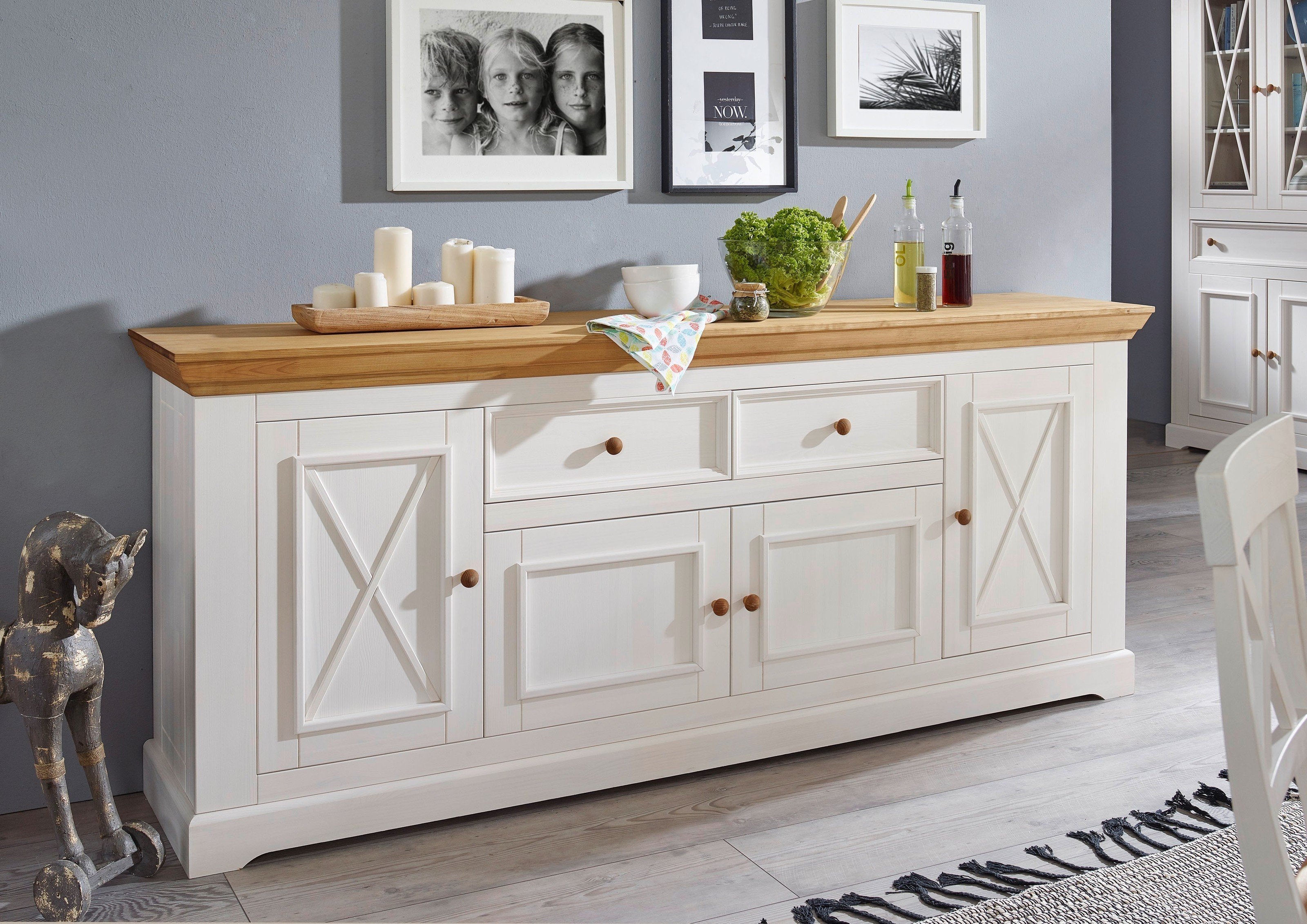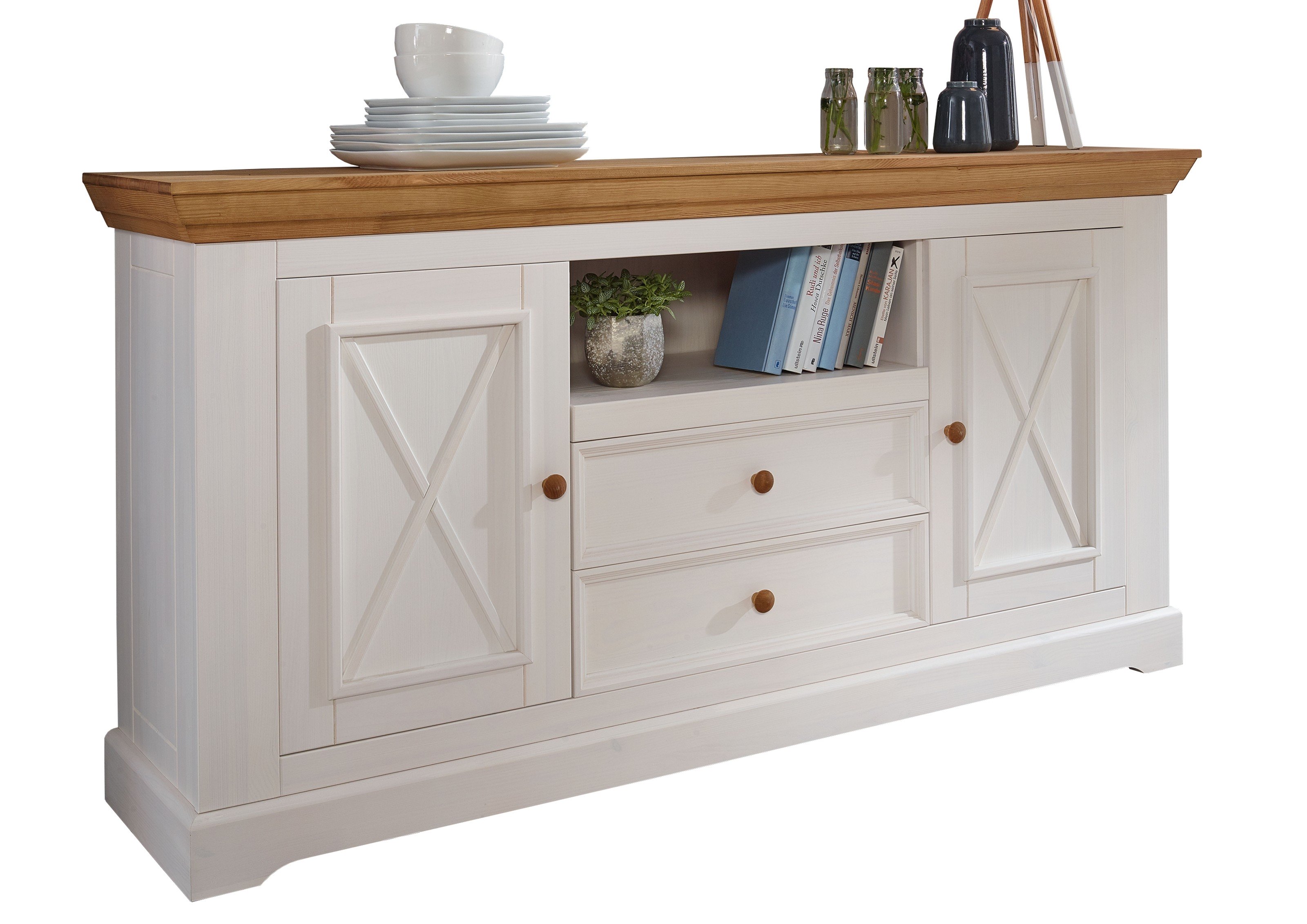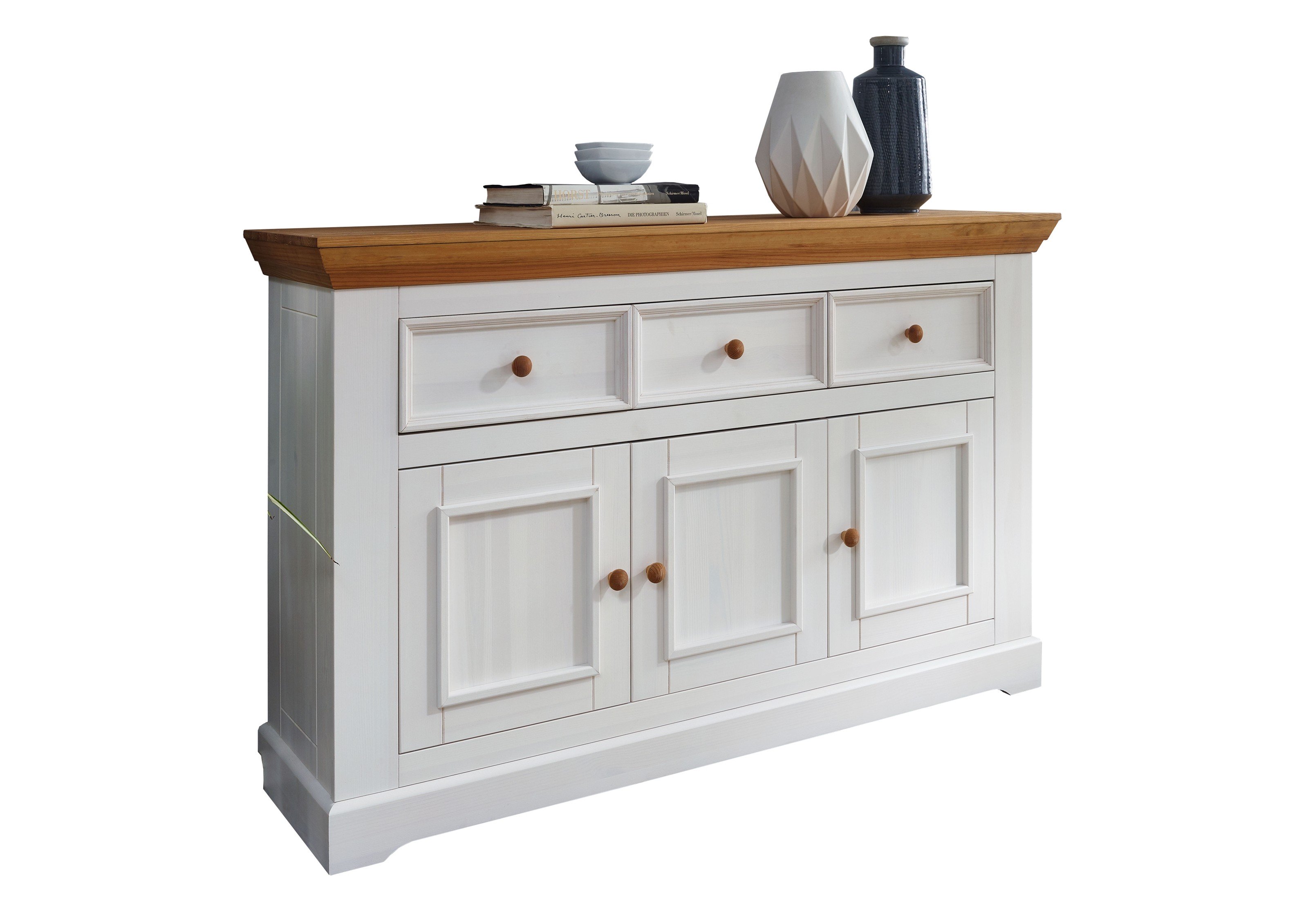 [metaDescription] => Anrichte im Landhaus Stil in Kiefer massiv grau gewachst, Deckelplatte in eichefarbig abgesetzt Anrichte mit 2 Holztüren und 2 Schubladen Maße ~Breite 108,5