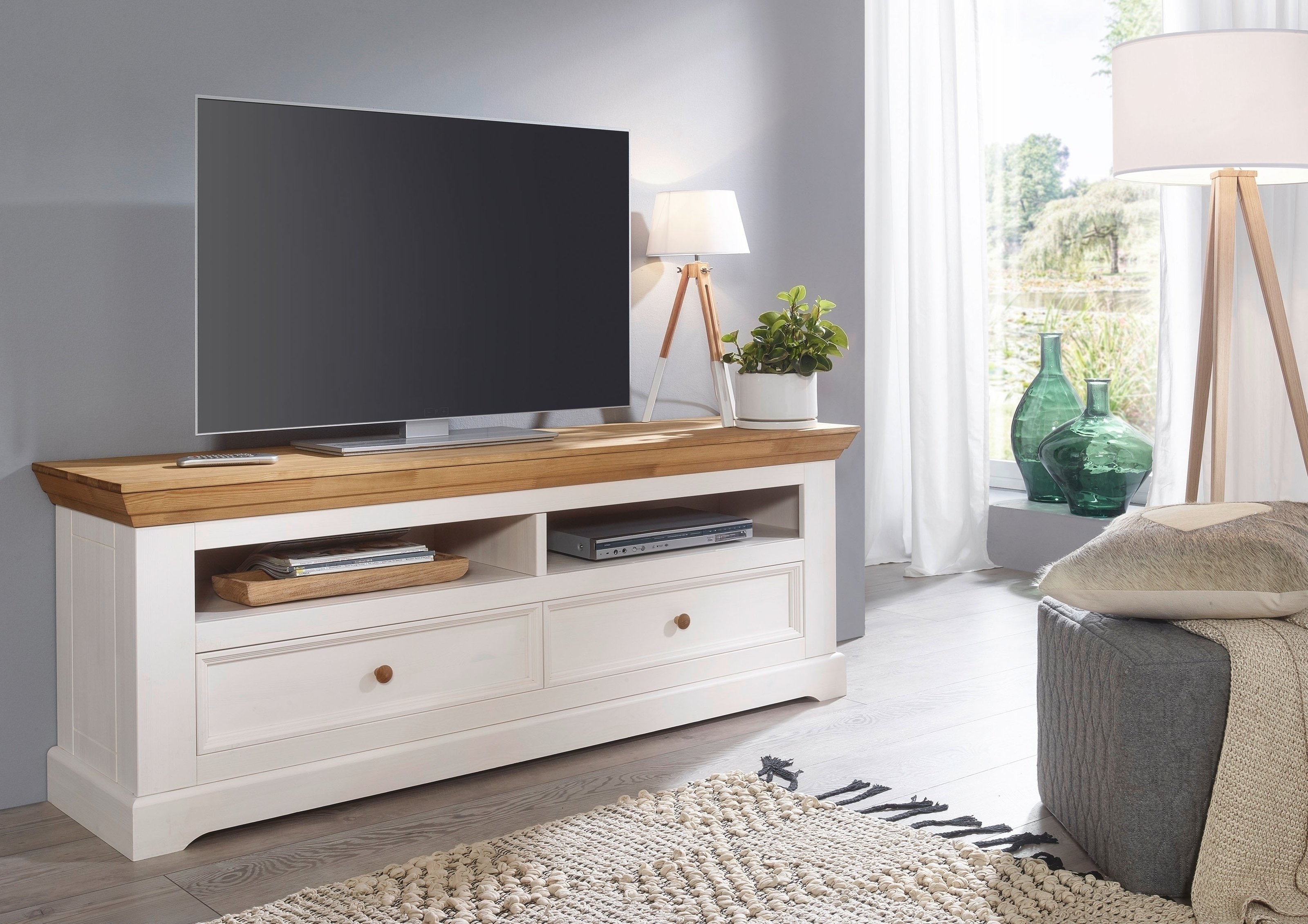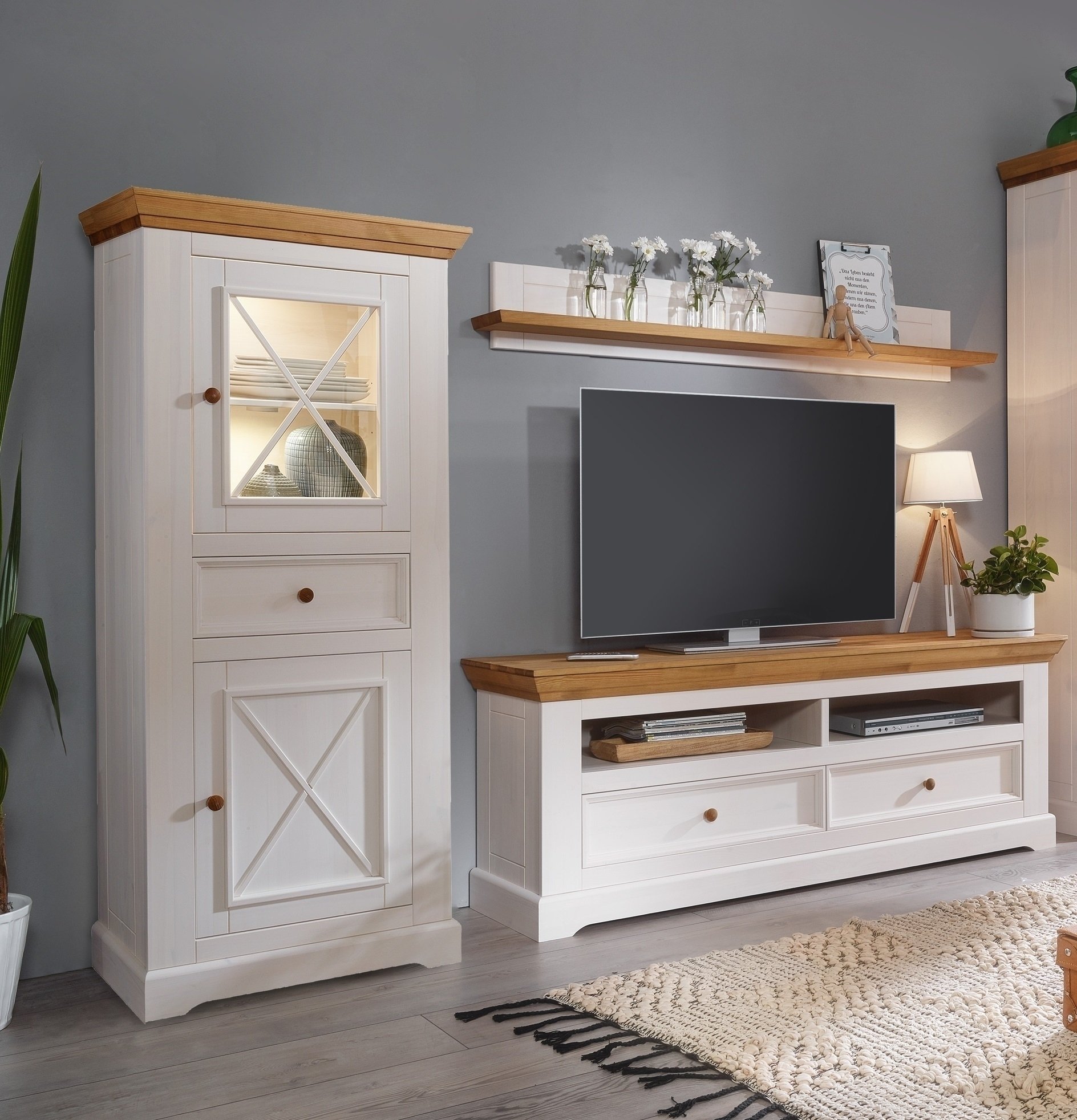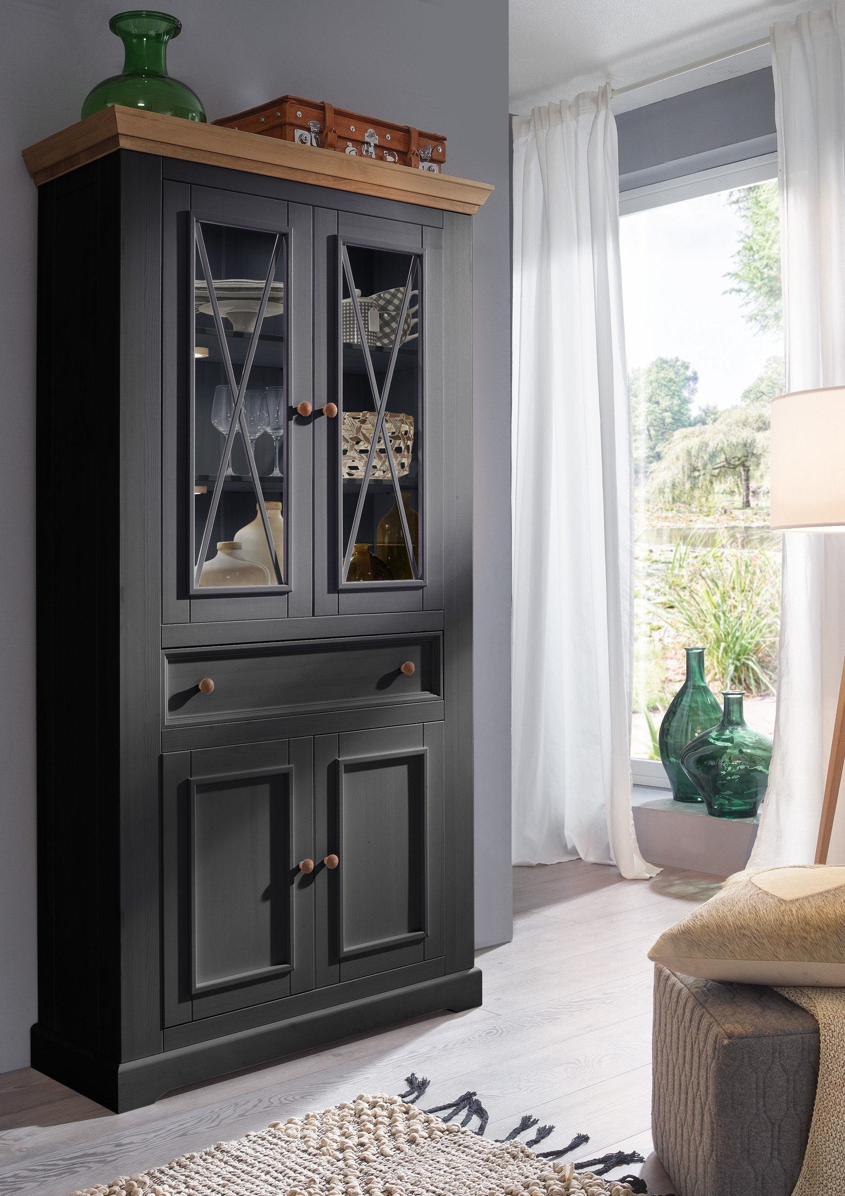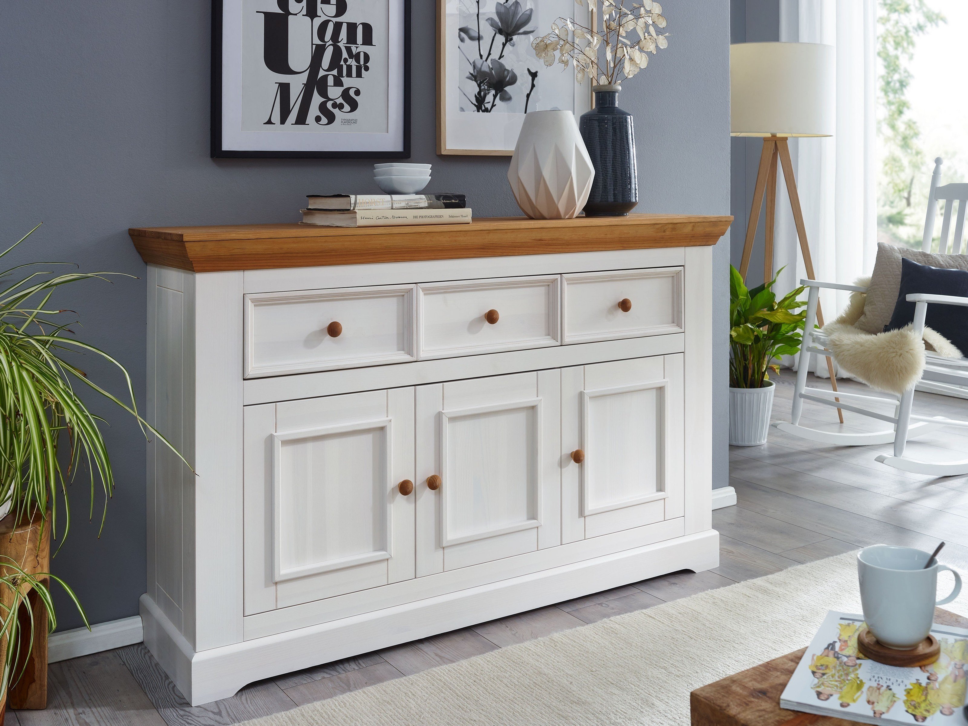 Die grau gewachste Kiefer mit eichefarbiger Deckelplatte sorgt für zeitloses Landhausflair in Ihrem Wohnbereich.